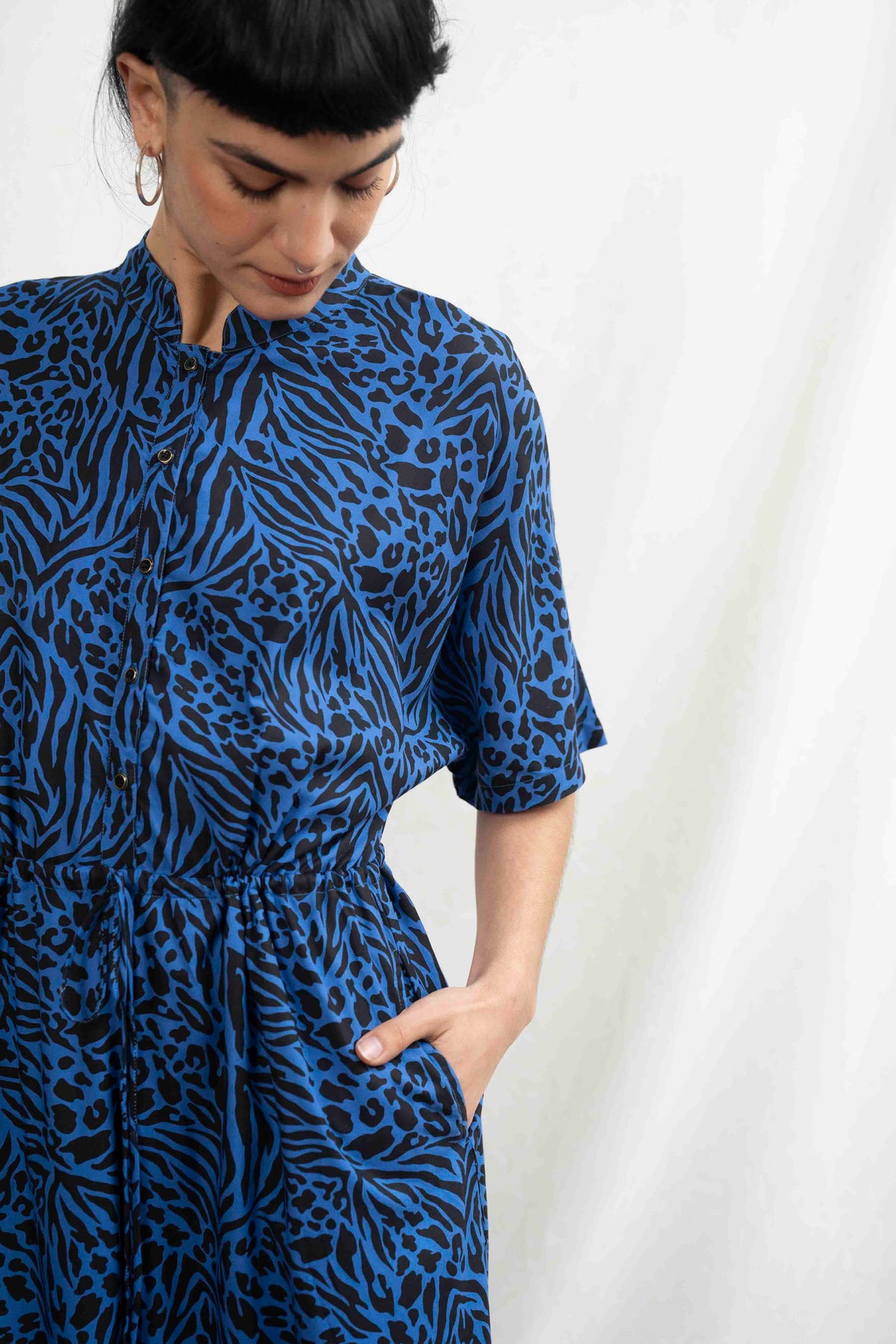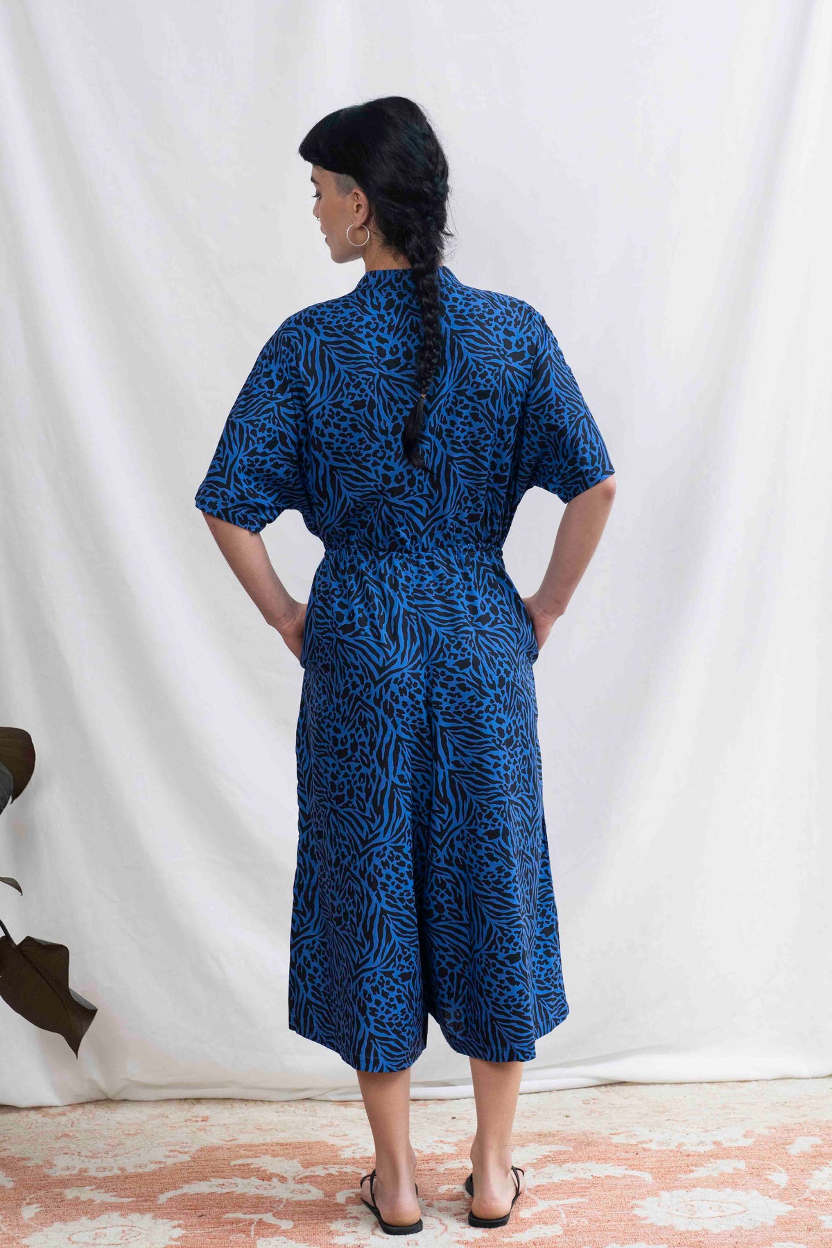 אוברול גל בלו לאופרד מעוטר חברבורות שחורות על רקע כחול רויאל, מלכותי ועל זמני.