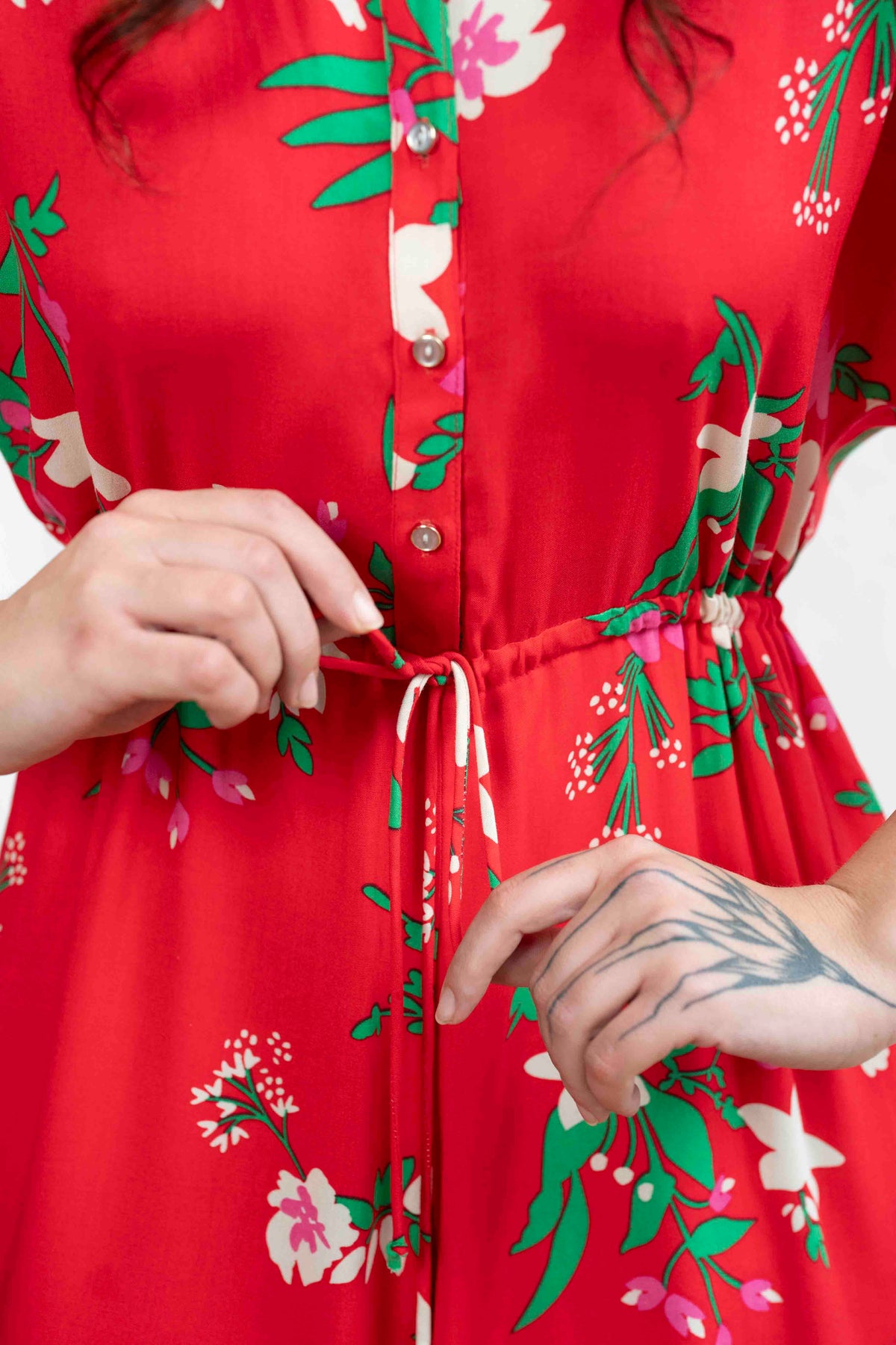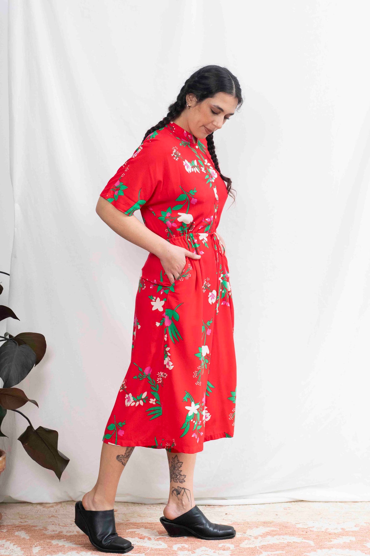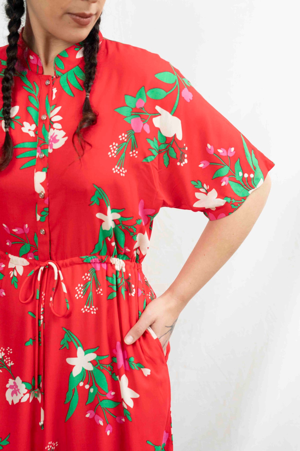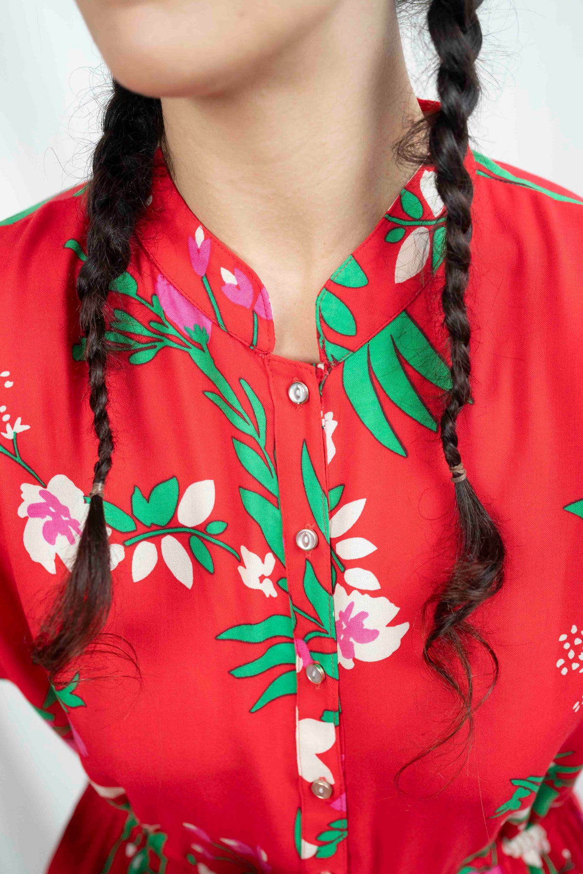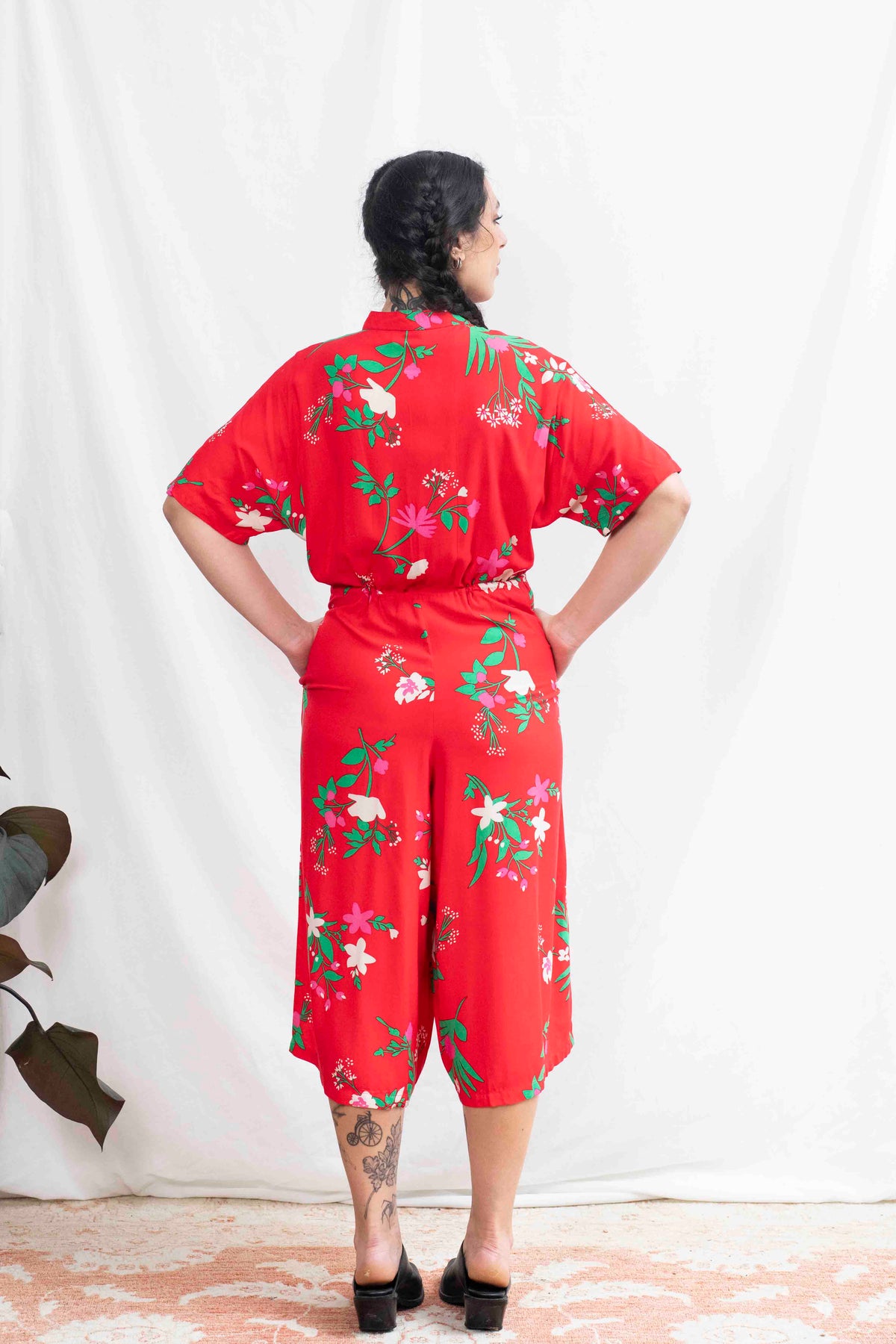אוברול גל יש לך אותי בצבע אדום בועט ובעל הדפס פרחוני משמח.