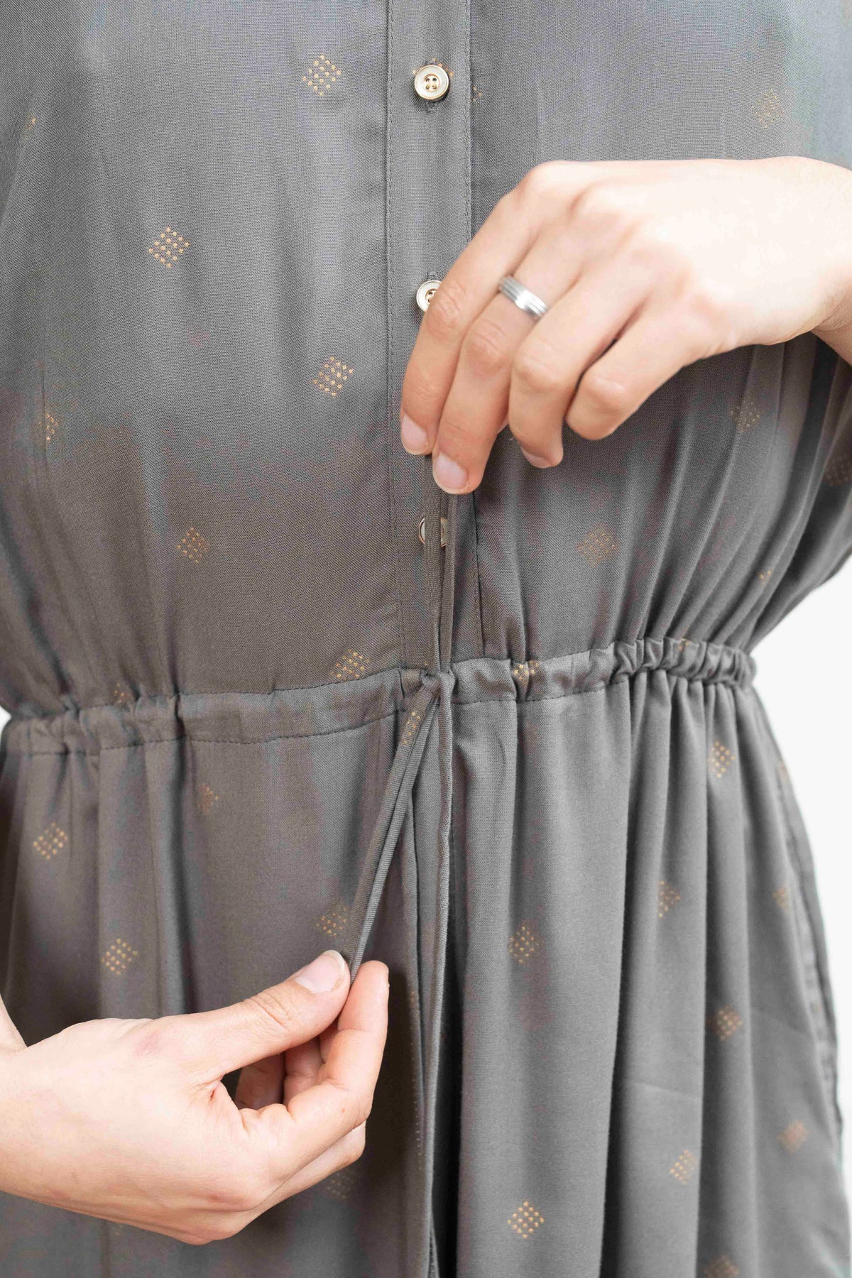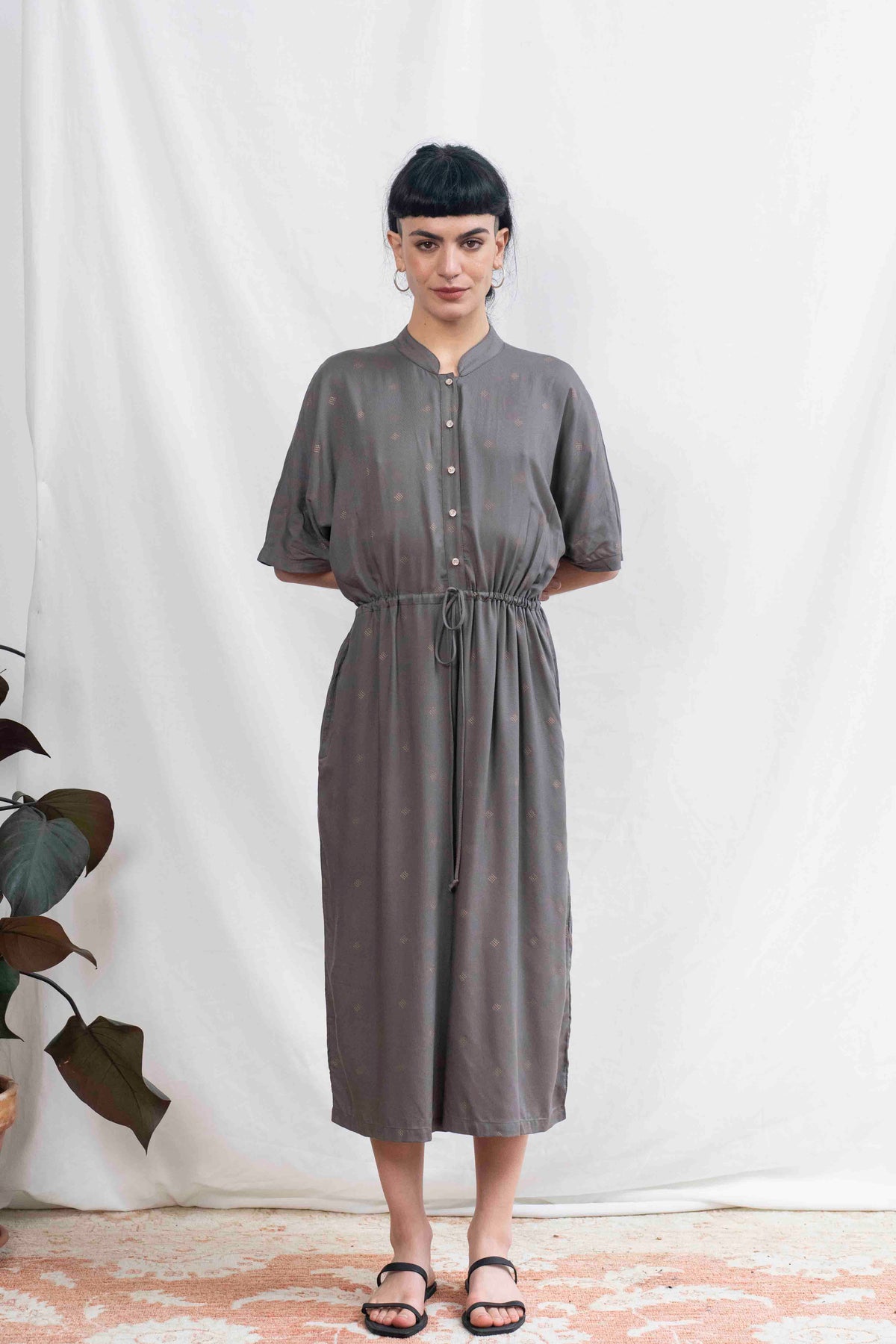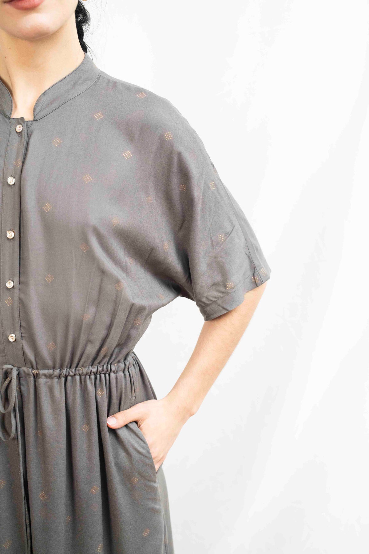 אוברול גל ניצוצות בגוון אפור עשיר עם נקודות זהב עדינות שיוצרות עיטור קסום, אוברול קלאסי שלעולם לא ימאס עליך.