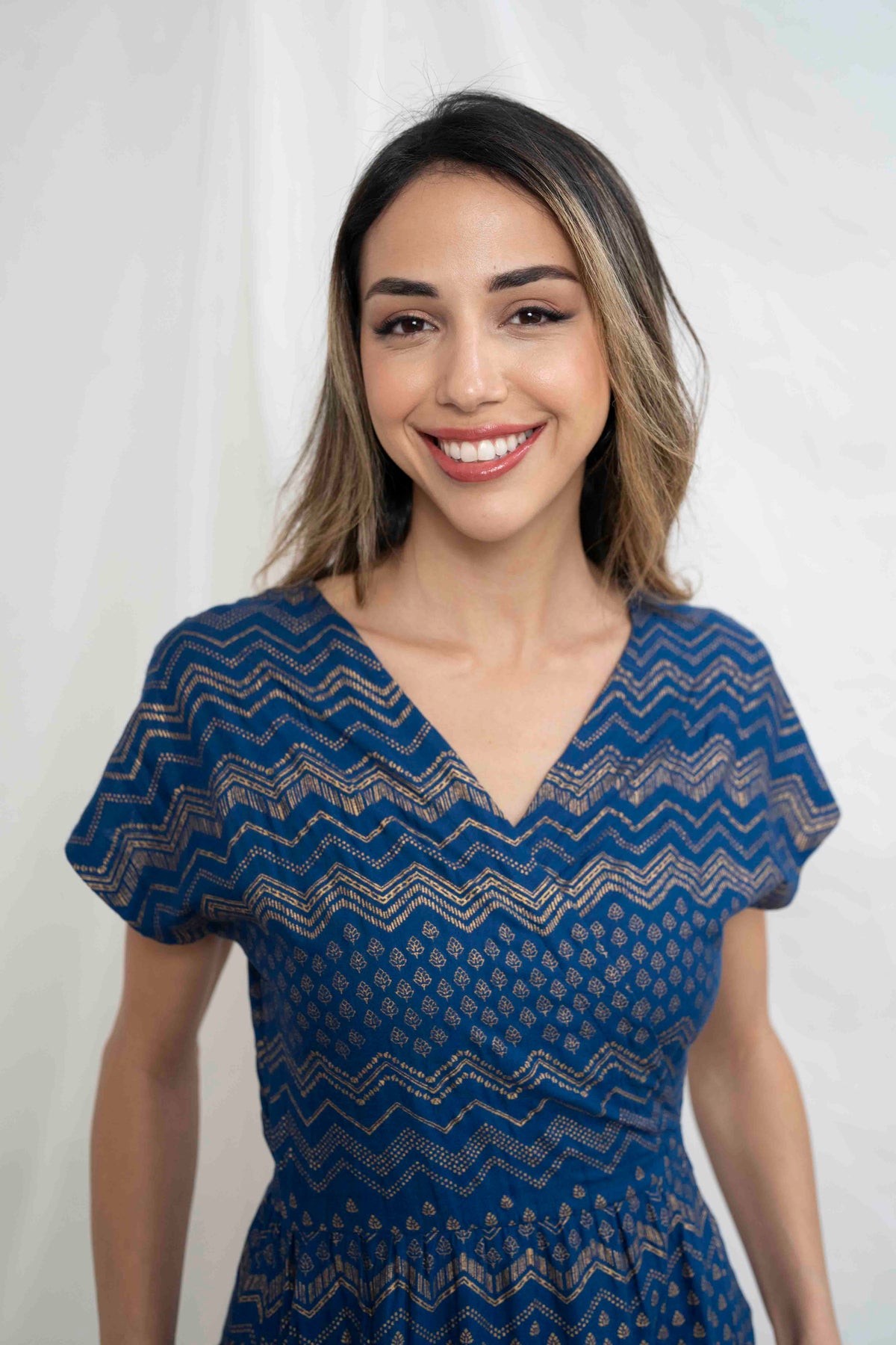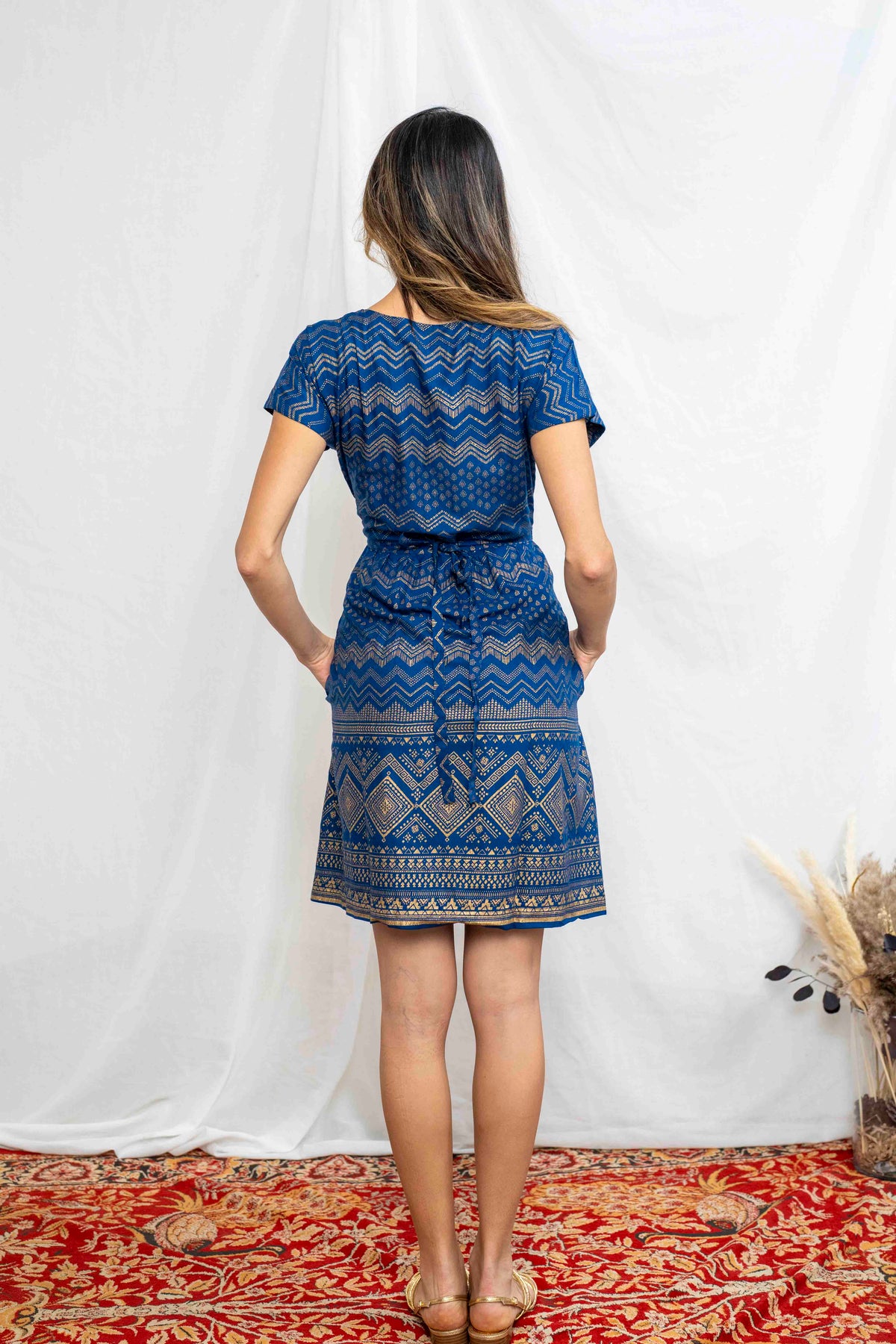 שמלת גיישה מיני! הגירסה הקצרצרה של שמלת גיישה, מעוטרת בהדפס זהב שבטי וגאומטרי.