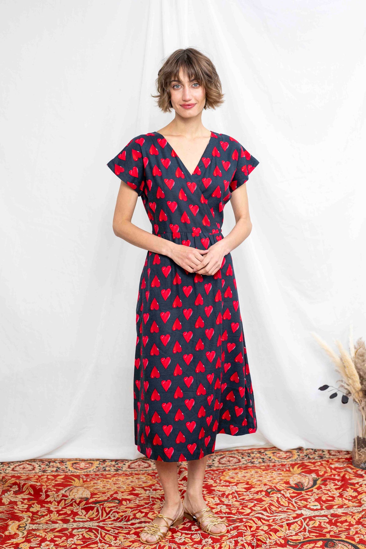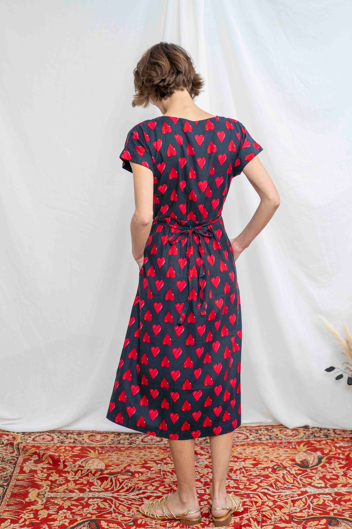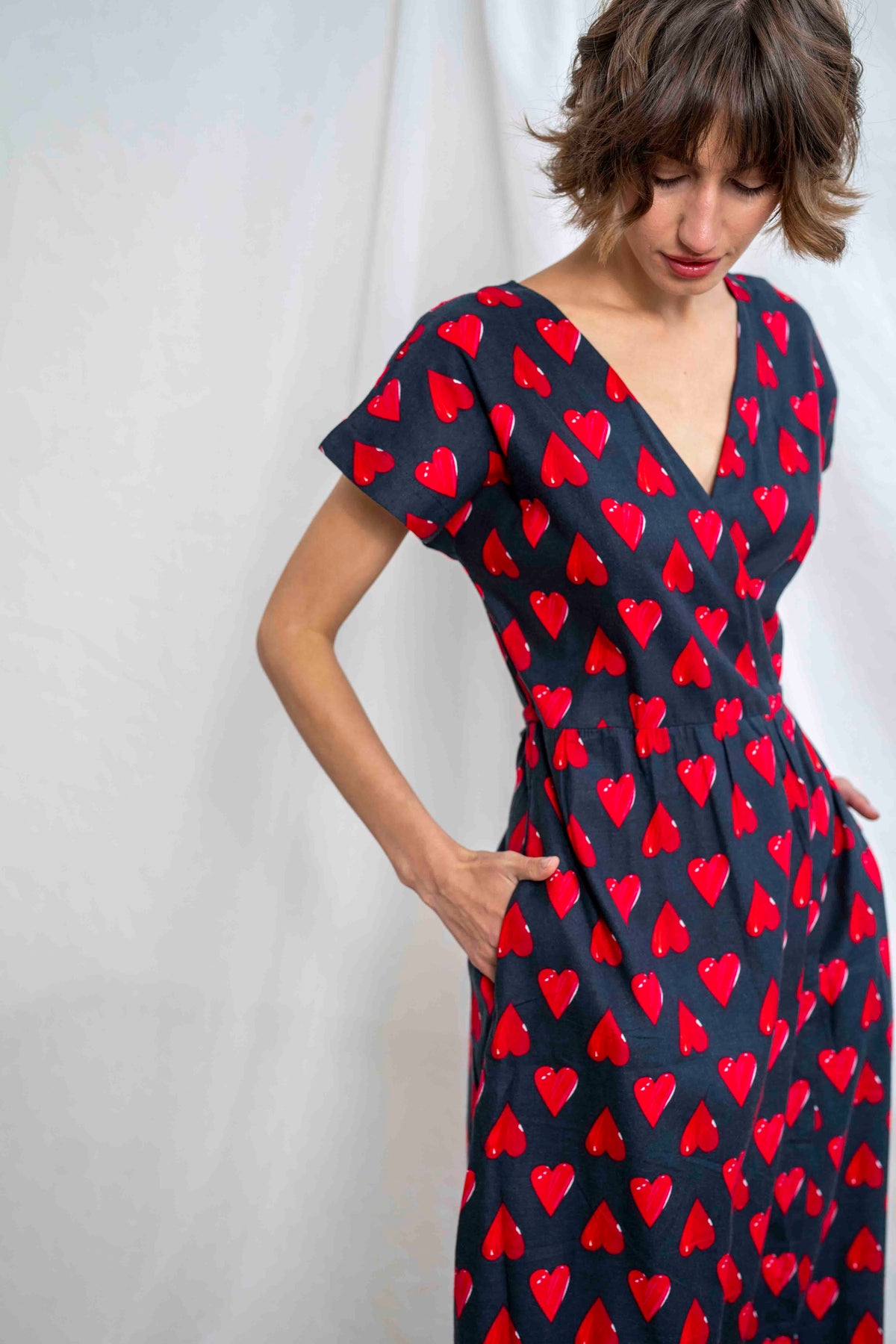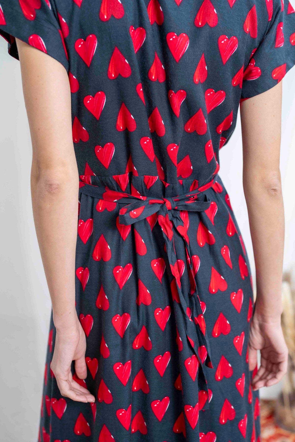 שמלת גיישה מלכת הלבבות מעוטרת בלבבות אדומים וגדולים, משמחת לבב אנוש ומאירה כל חדר שתכנסי אליו.