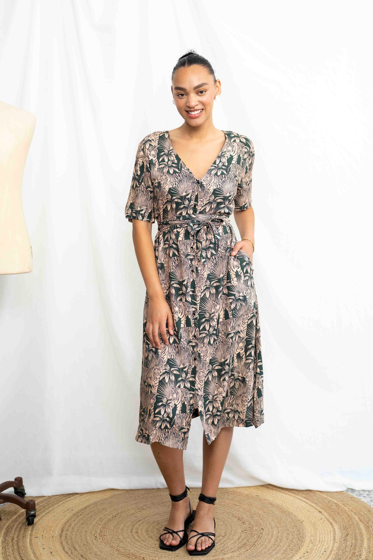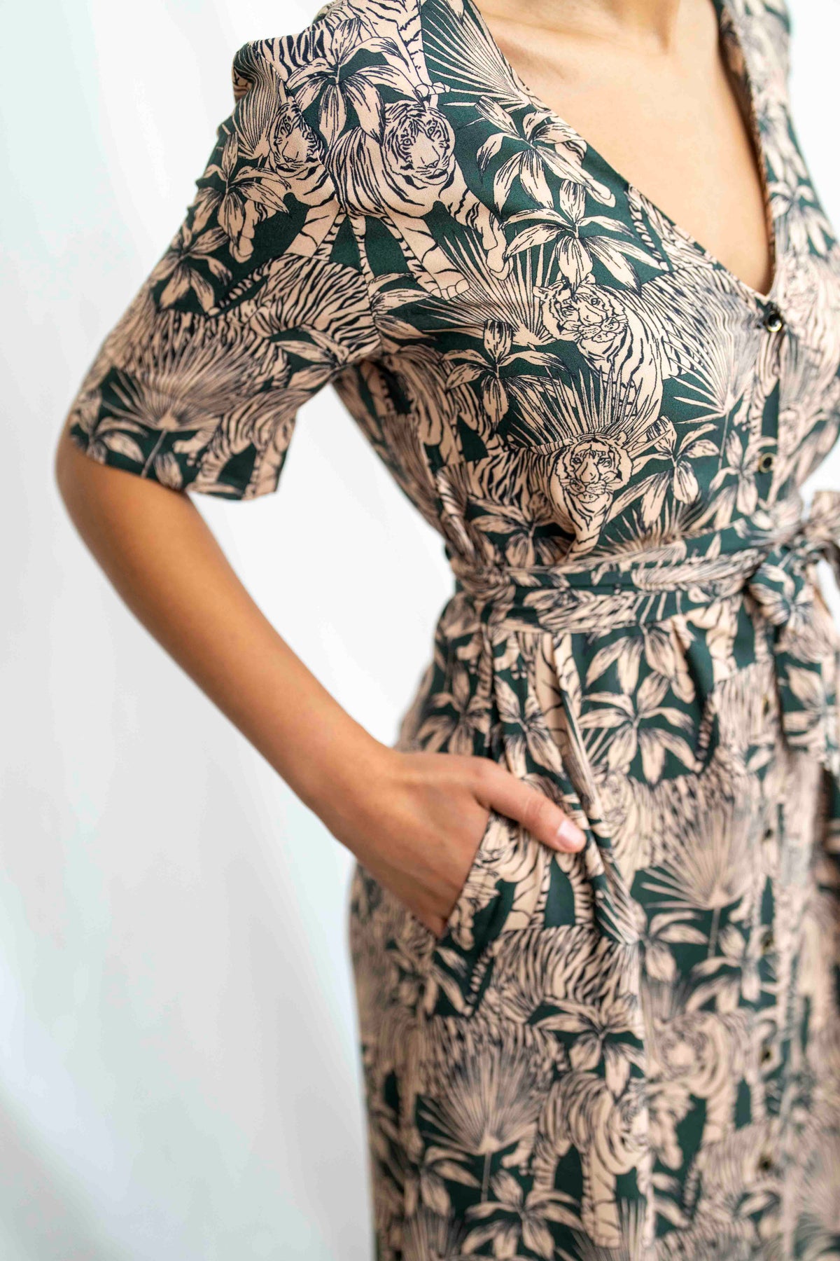 שמלת מיכאלה ג'ונגל וייב לוקחת אותך הישר ללבו של יער טרופי, עם הדפס פראי אך אלגנטי בגווני ירוק מעושן ובז’ טבעי. בין עלים, פסים ודוגמאות חייתיות מתוחכמות, נוצרת תחושת עומק ועושר ויזואלי, כמו ציור חי של טבע שקט אך מלא עוצמה. הבד קליל ונושם, והצבעים המאופקים מאפשרים לשמלה להשתלב במגוון הופעות – ועדיין לשדר נוכחות.