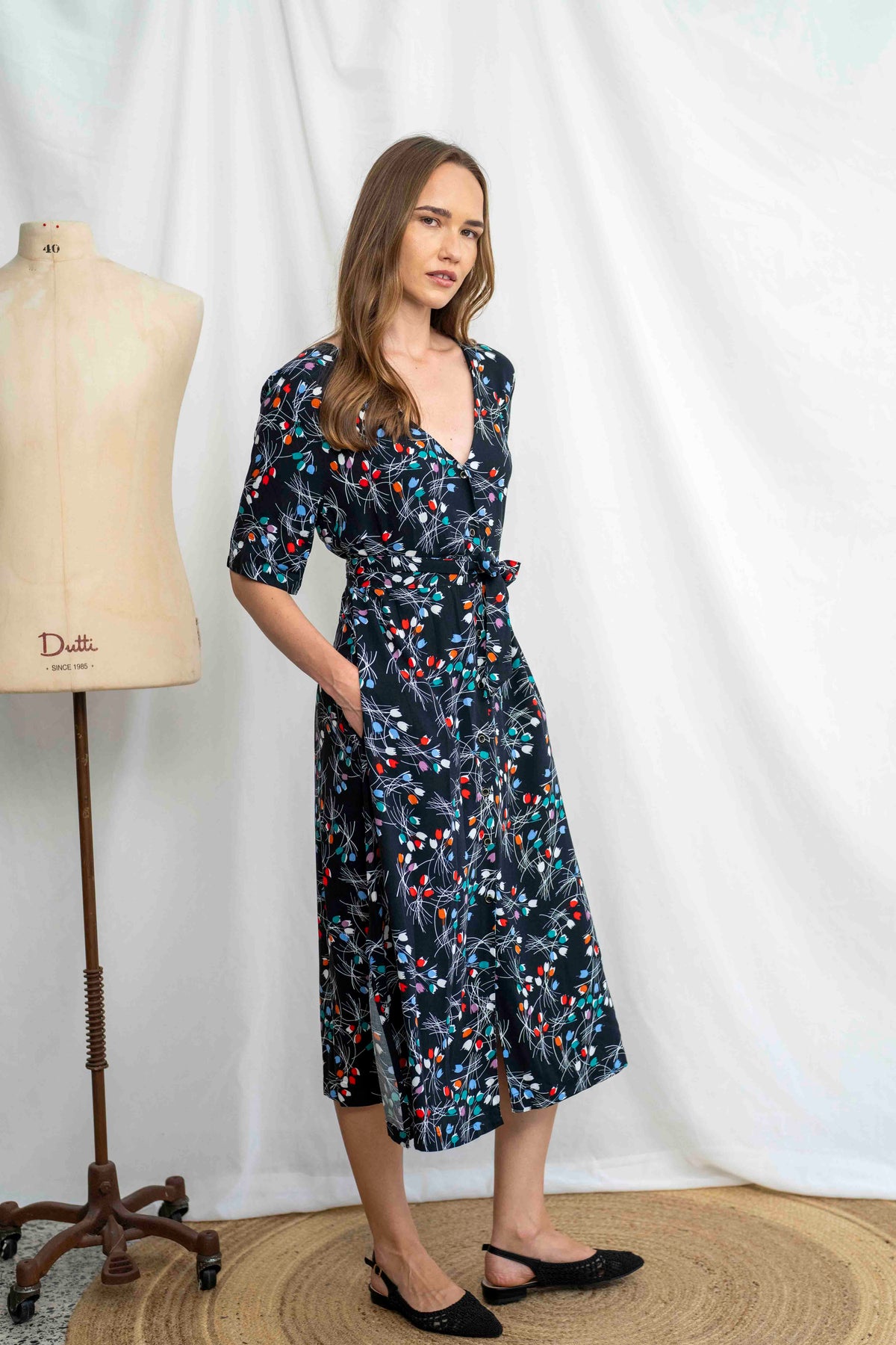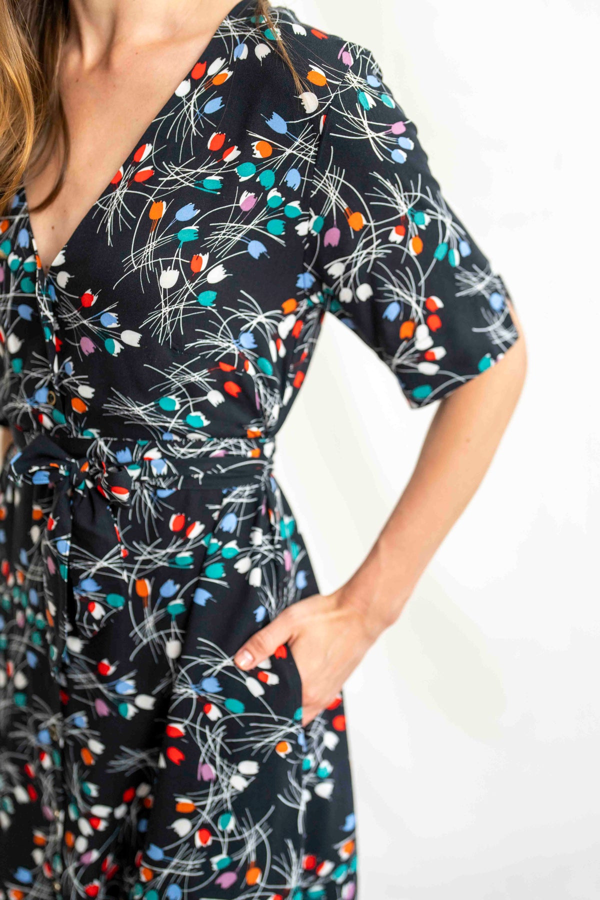 שמלת מיכאלה – זרי טוליפ מעוצבת בגזרת A רכה ונשית, עם מפתח V מחמיא, שרוולים באורך ביניים, חגורת קשירה תואמת וכמובן – שורת כפתורים מלאה וכיסים צדדיים פרקטיים. האורך המידי מעניק לה נוכחות אלגנטית אך קלילה, מה שהופך אותה לפריט ורסטילי שתוכלי ללבוש לסידורים, לעבודה או לערב נעים בחוץ – בקלילות, בסטייל, ובתחושת נוחות מקסימלית.