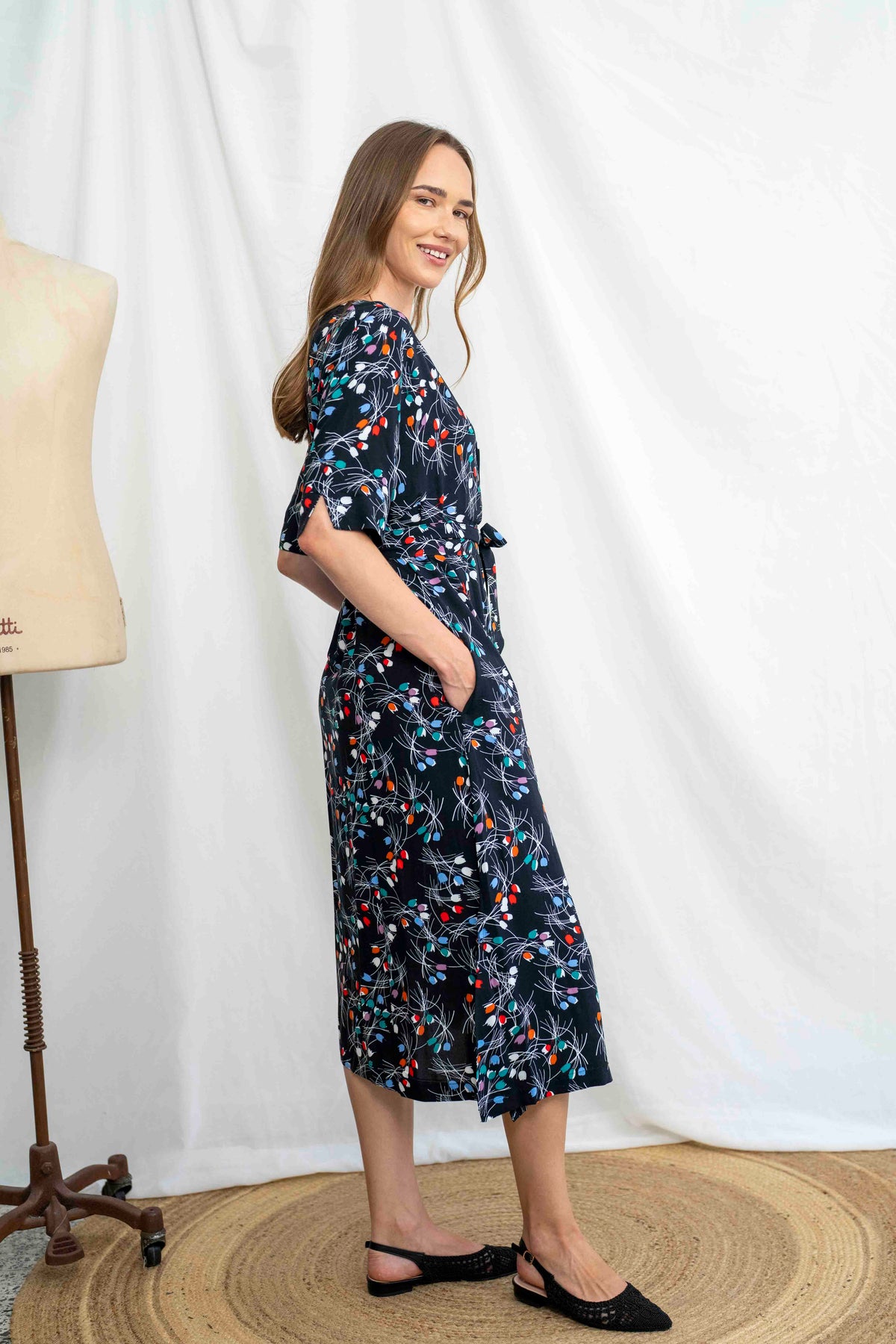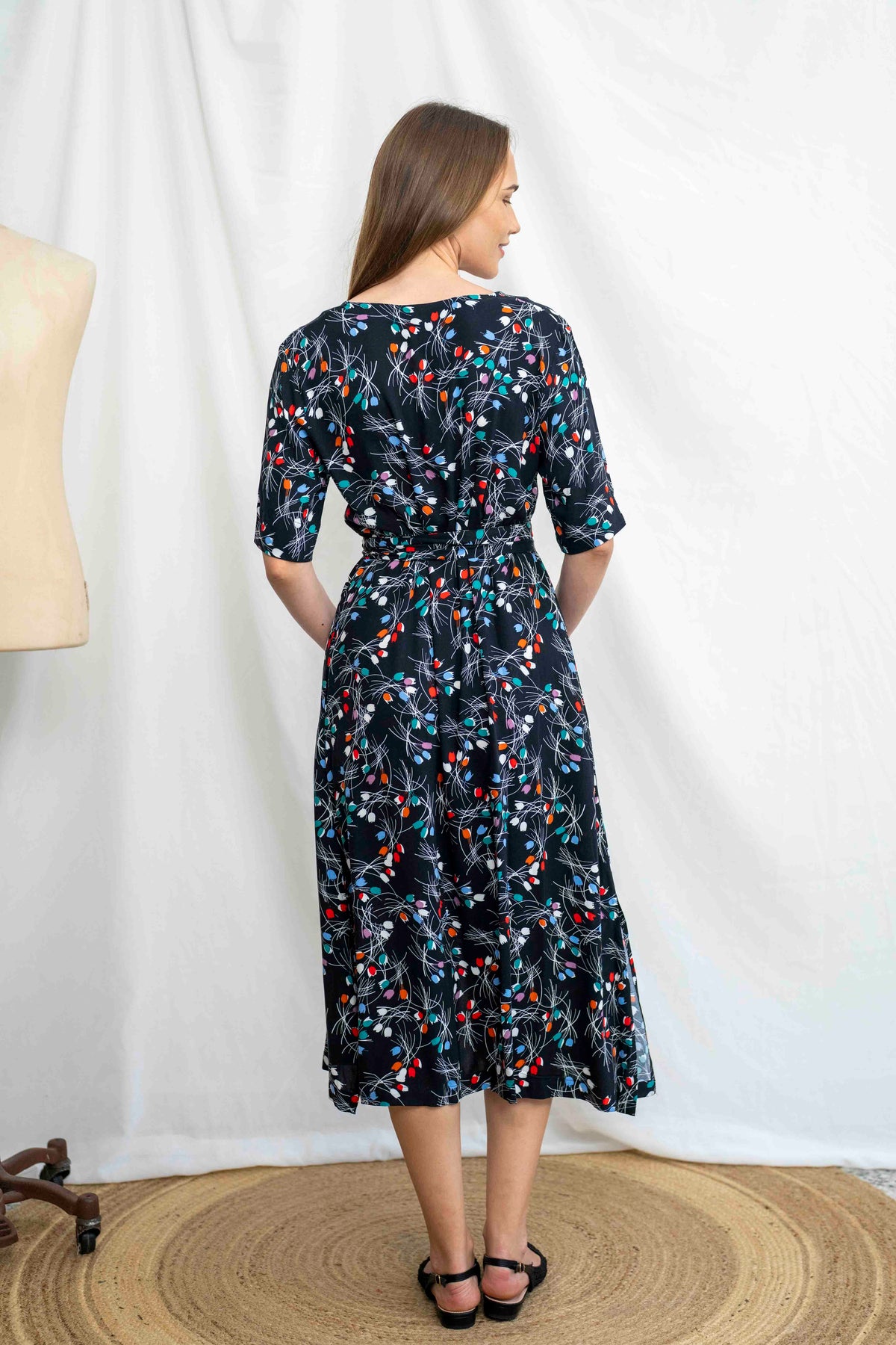 שמלת מיכאלה זרי טוליפ מביאה איתה אווירה פיוטית של לילה קיצי פורח: רקע שחור עמוק מקושט בהדפס זרים צבעוניים של פרחי טוליפ קטנים בגווני אדום, תכלת, סגול וכתום. העיצוב הגרפי של הפרחים יוצר תחושת תנועה אוורירית ועדינה, עם נגיעה של רטרו נוסטלגי ומראה שמתאים לכל שעה – קלאסי עם טוויסט.