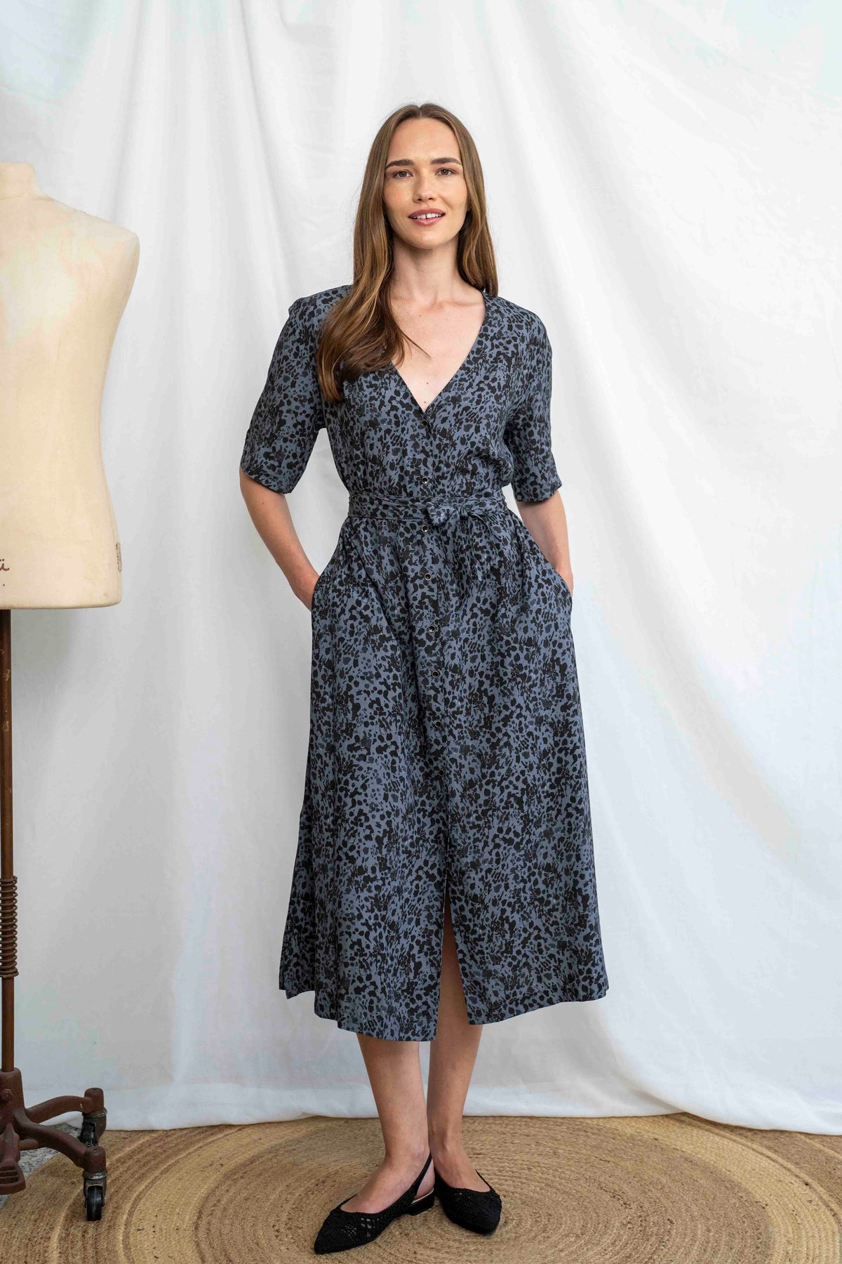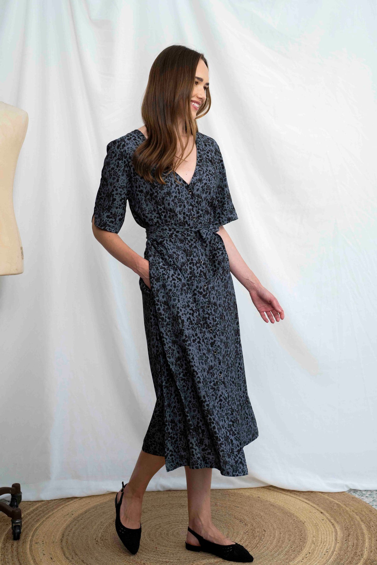 הגזרה המוכרת והאהובה של שמלת מיכאלה – מגיעה כאן במיטבה: מפתח V נשי, שרוולים באורך ביניים, חגורת קשירה תואמת להדגשת המותן, שורת כפתורים לאורך השמלה וכמובן – כיסים פרקטיים. האורך המידי שומר על איזון מושלם בין יומיומי לאלגנטי, והבד הנעים הופך אותה לאופציה טבעית שתלווה אותך מהעבודה ועד דרינק בערב – בשיק מאופק ומדויק.