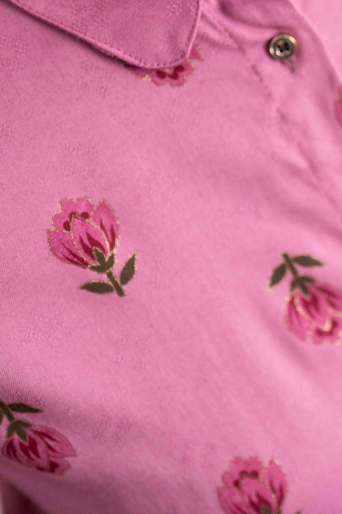 חולצת דריה טוליפ ורוד מעוטרת בפרחים עם קווי מתאר בזהב, על רקע גוון ורוד-סגול מושלם, קלאסיקה על-זמנית: הבד קליל ונעים על הגוף, והכפתורים הקטנים משתלבים בצורה הרמונית עם ההדפס ומוסיפים טאץ' מוקפד ועדין.