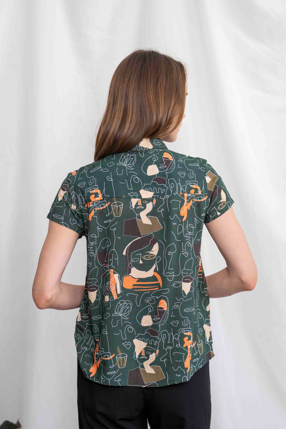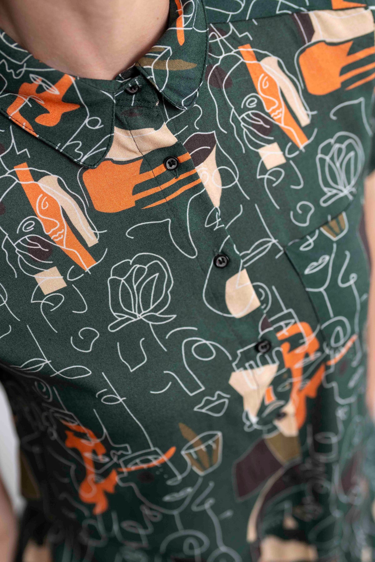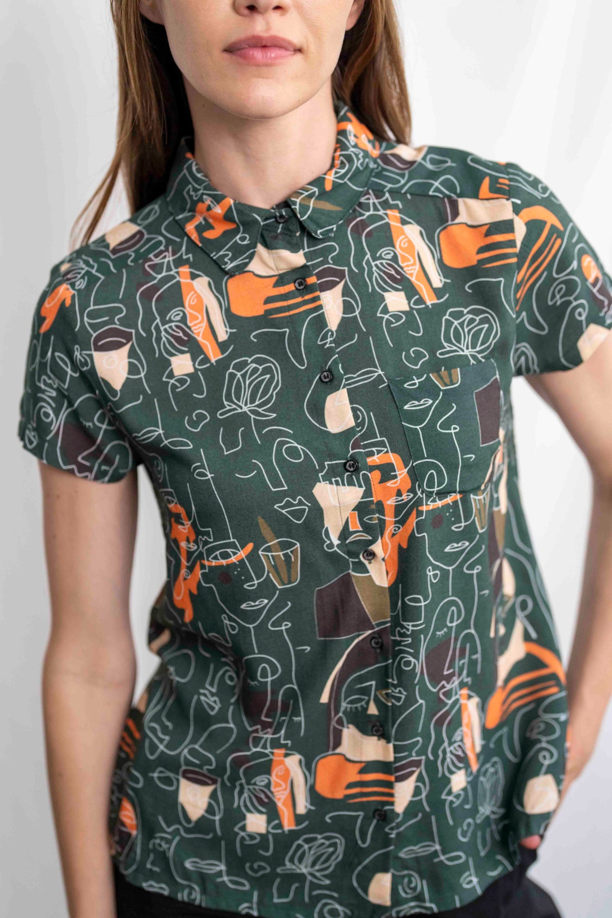 הדפס אבסטרקטי בעל נוכחות מרשימה פוגש גזרה נשית מחויטת: חולצת דריה בהדפס "פורטרט נשי" מעוטרת בקווים מינימליסטיים של דיוקנאות נשיים, לצד כתמי צבע בגווני כתום, קרם, וחום על רקע ירוק עמוק. התוצאה – מראה אמנותי, מודרני ובועט שמוסיף עניין לכל לוק. הדפס עשיר בפרטים אך לא עמוס, כזה שמושך מבטים מבלי להשתלט על ההופעה כולה.