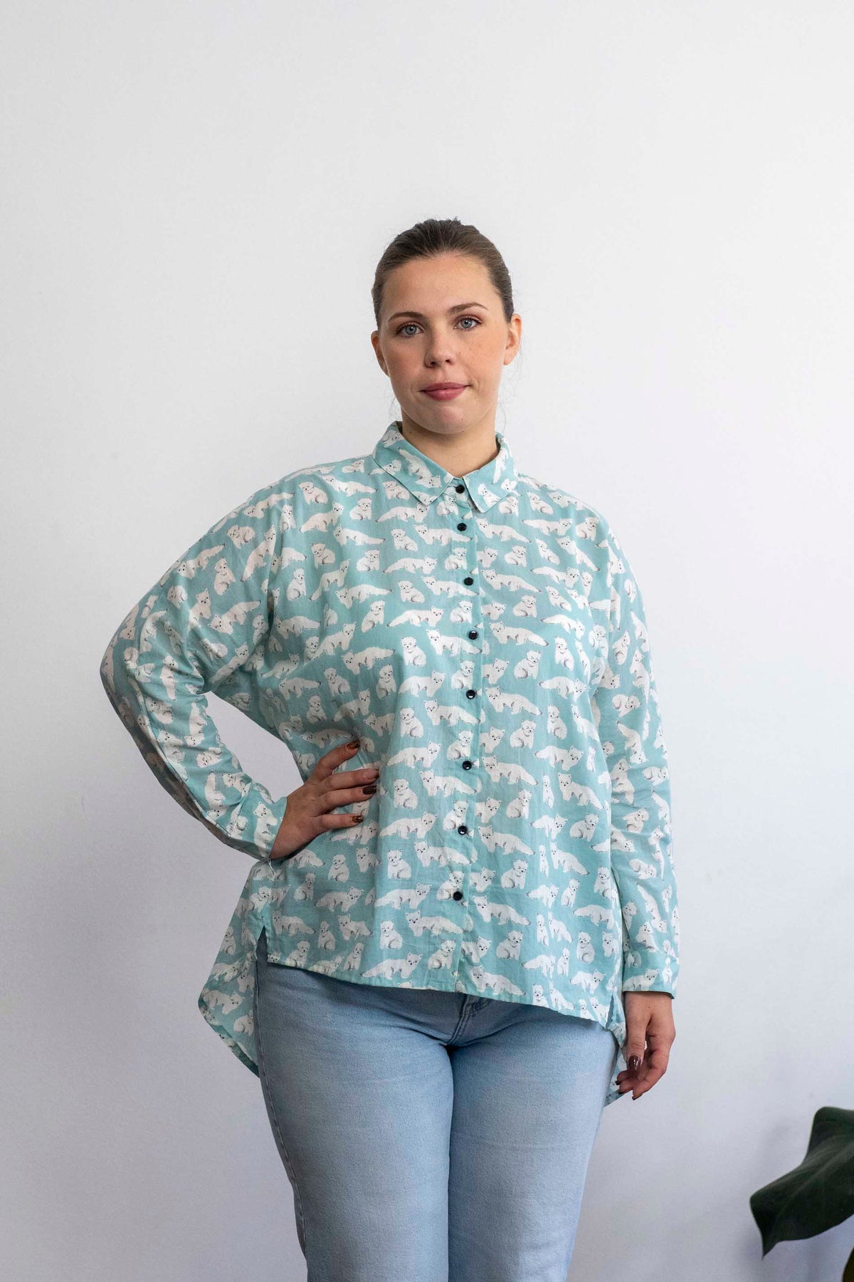 חולצת טוי מעוצבת בגזרת A מחמיאה ורפויה מהגוף, בעלת כפתורים לכל האורך, צווארון קלאסי, וגימור עגול וא-סימטרי (החלק הקדמי שלה קצר יותר מהחלק האחורי). חולצה מושלמת לעונות מעבר - לבשי אותה עם מכנסיים מחוייטים לארוחת ערב אלגנטית, או עם הג'ינס האהוב עלייך ללוק יומיומי.