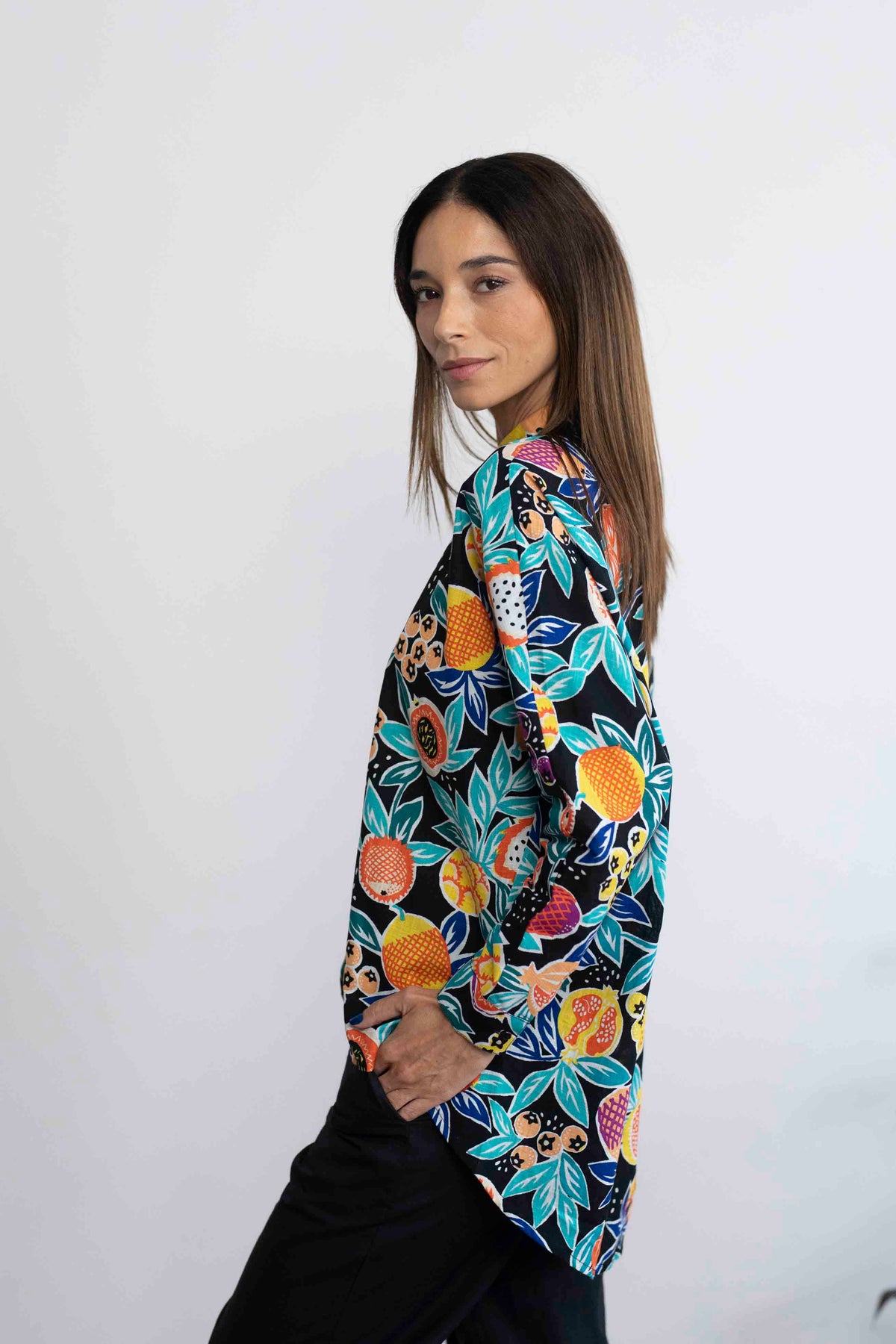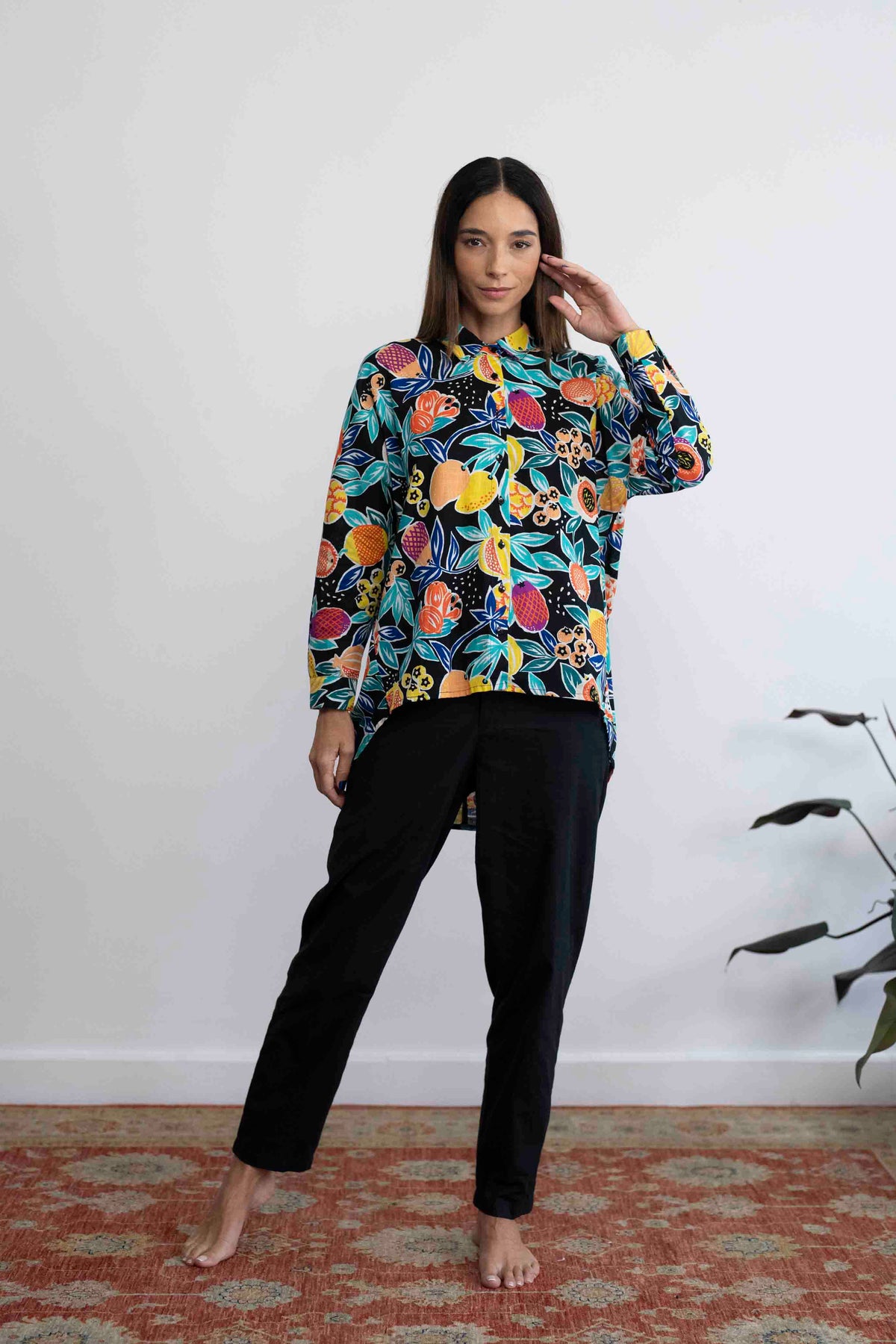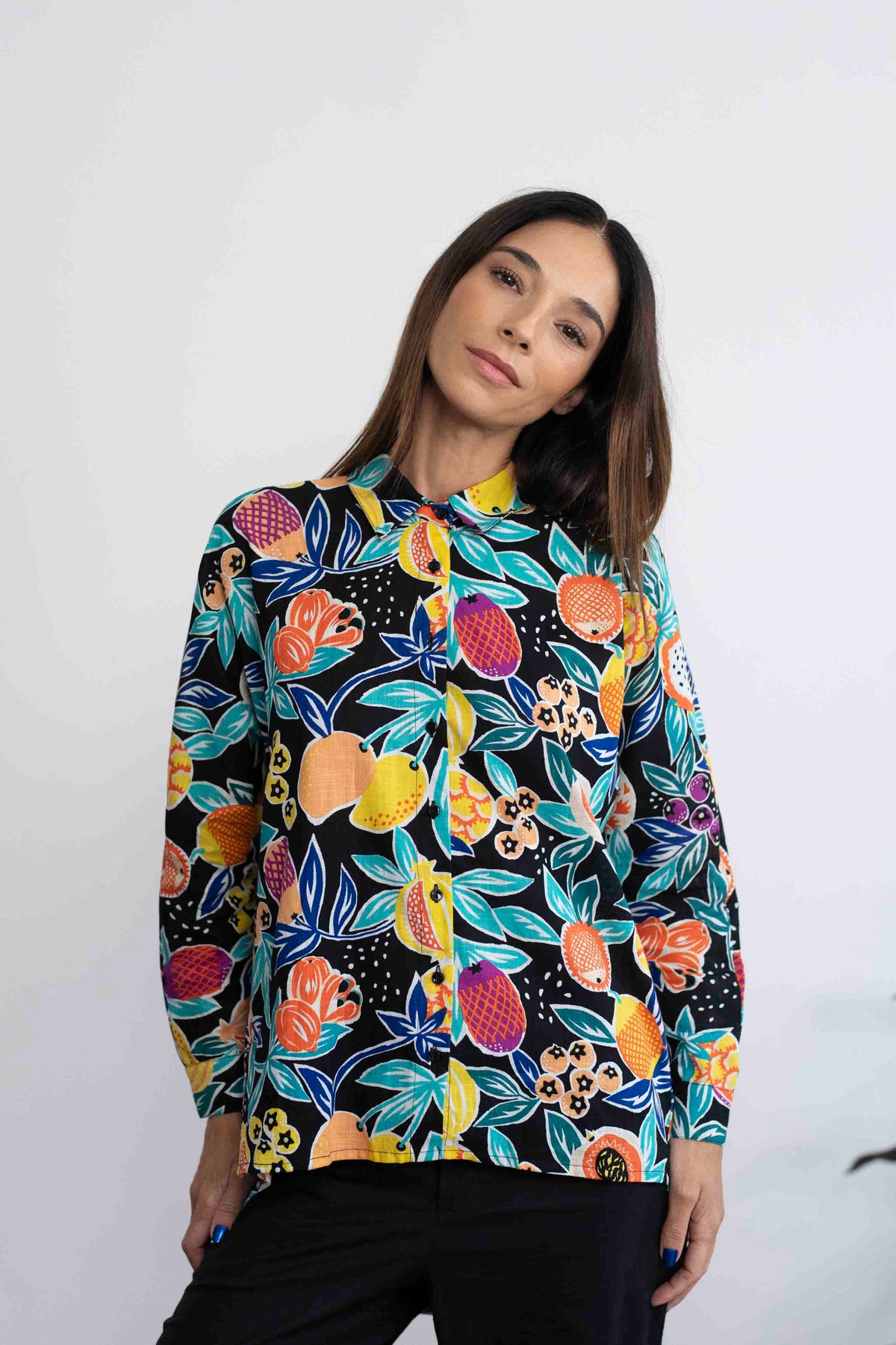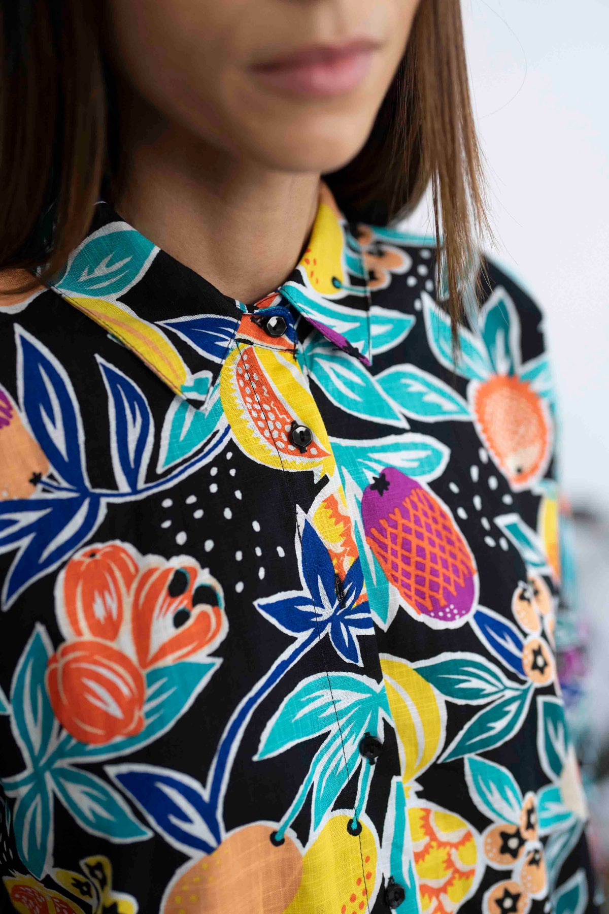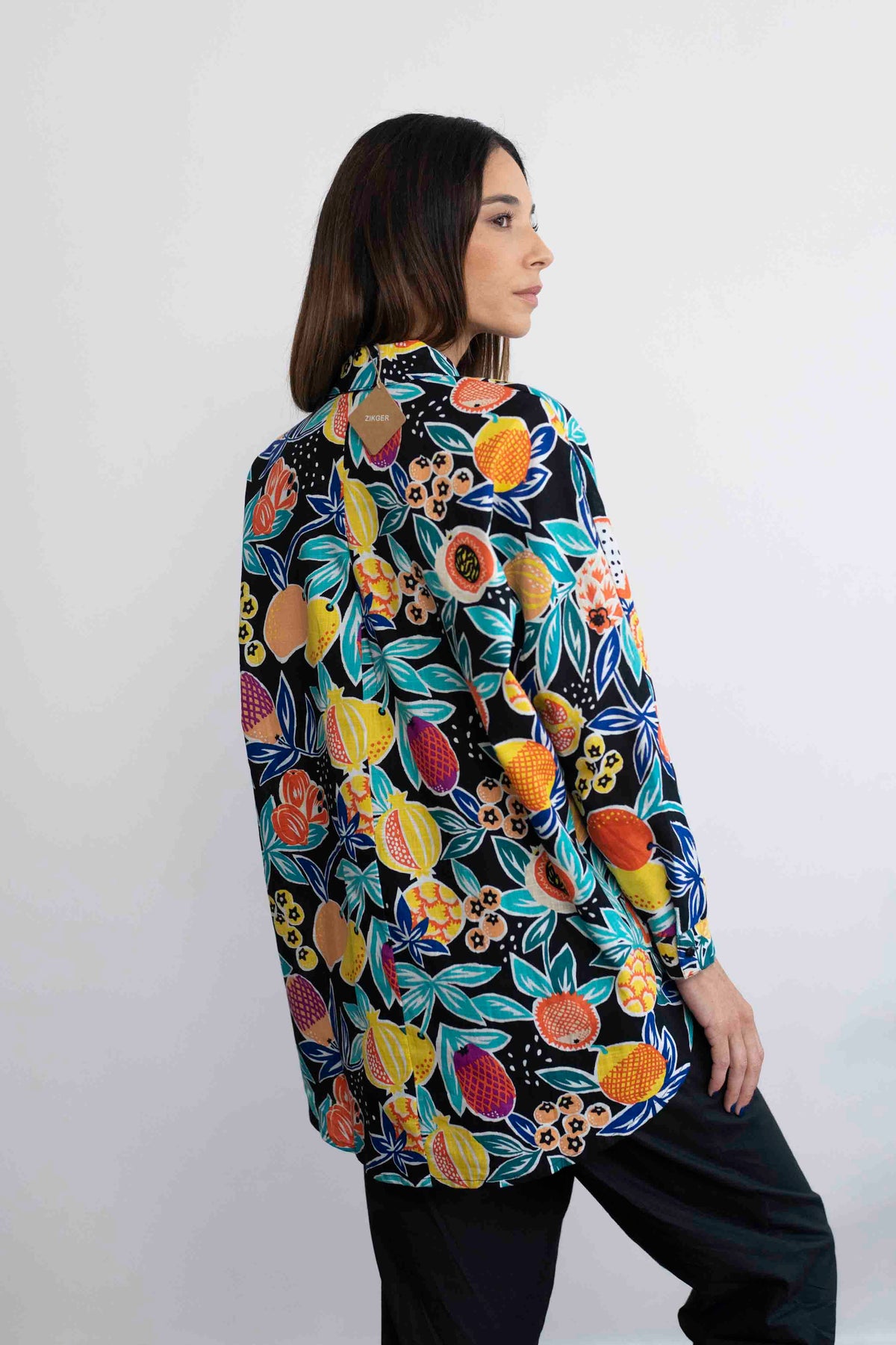 חולצת טוי צבעונית על רקע שחור, עם מוטיבים של פירות גדולים ועסיסיים.