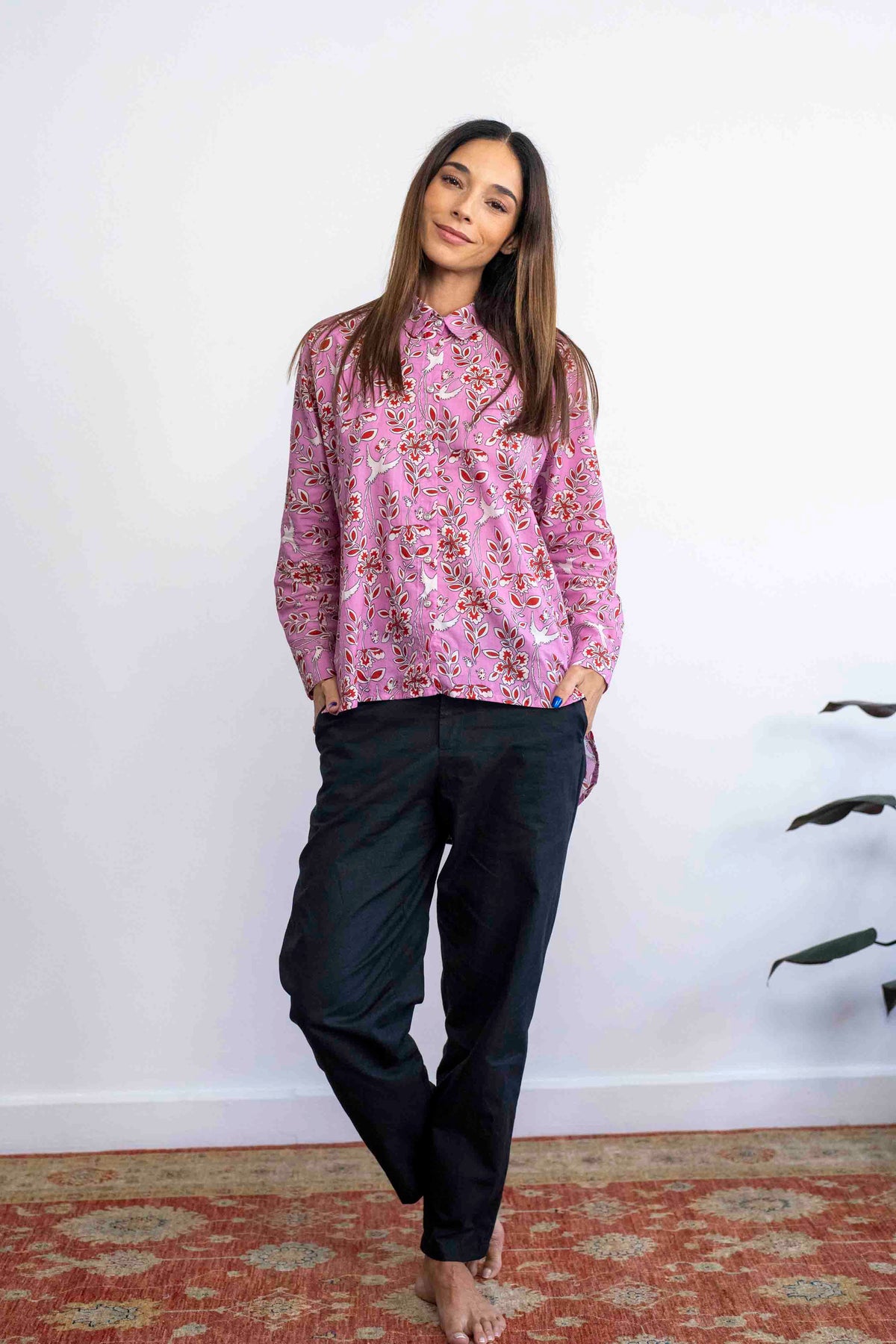 חולצת טוי בצבע ורוד, עם מוטיב פרחוני וציפורים, שיא הרומנטיקה.