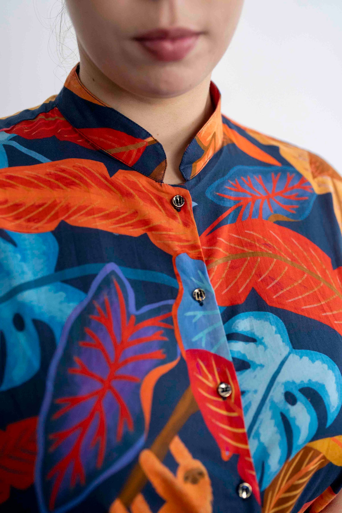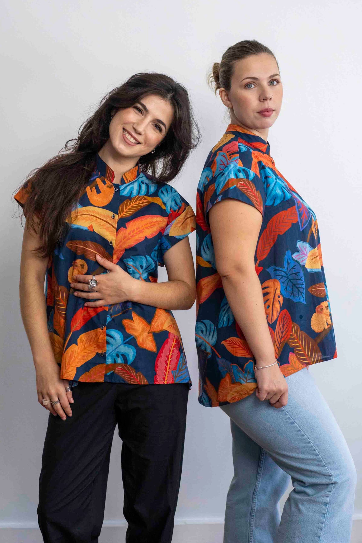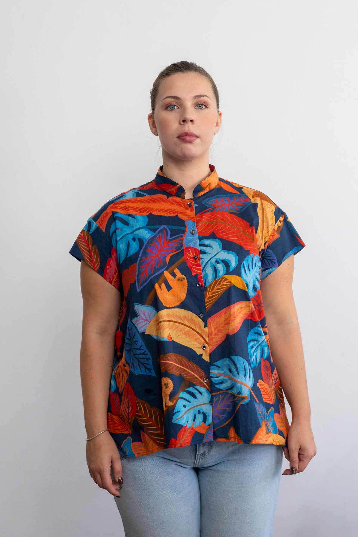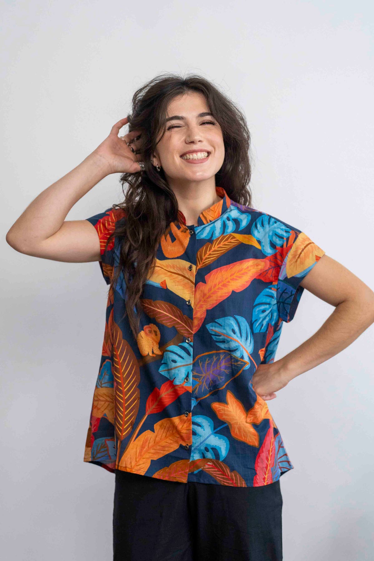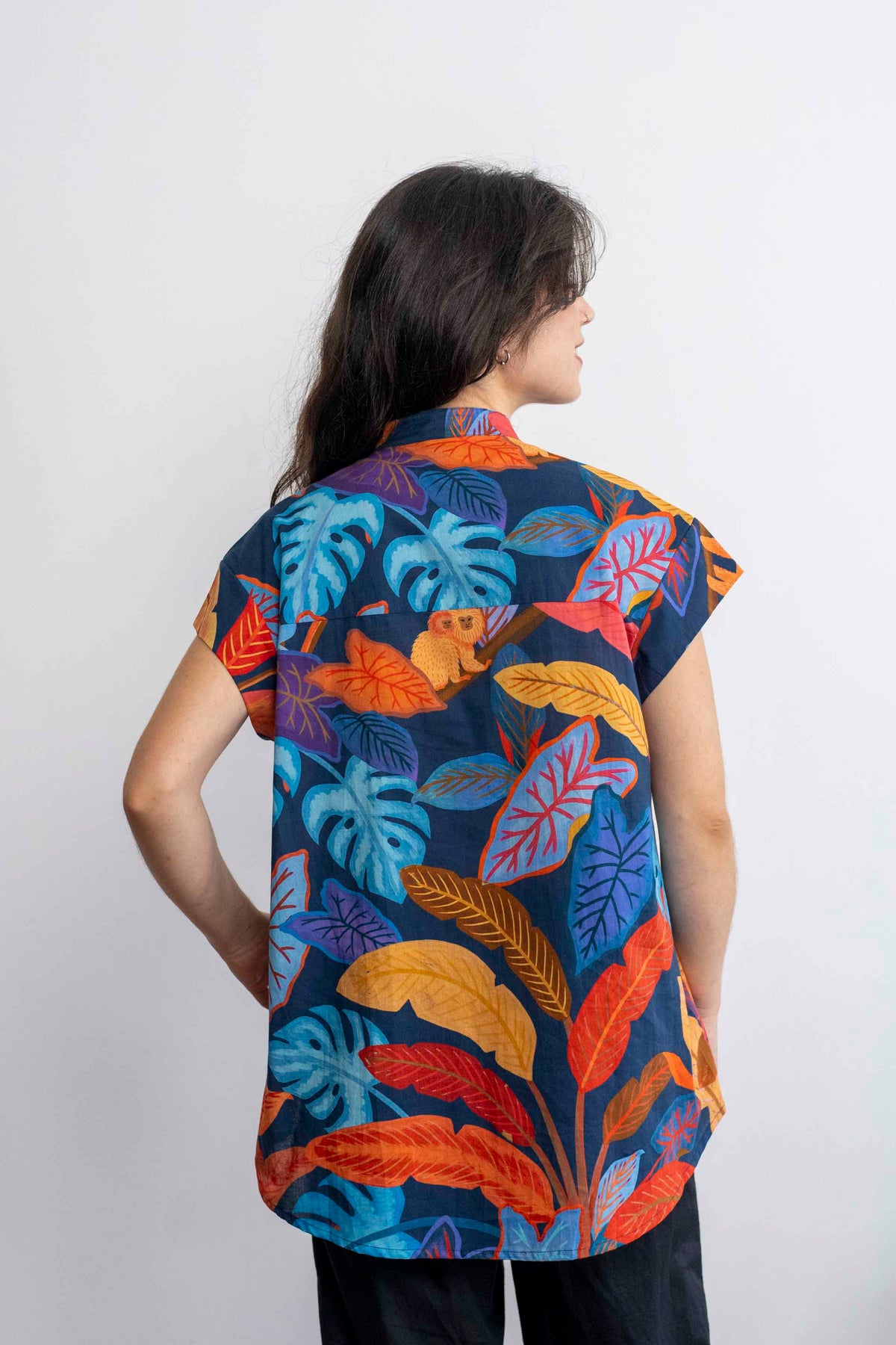 חולצת טוני ג׳ונגל כחול עמוק היא אחת החולצות היפות! מאוהבת במוטיבים של הקופים והעלים הגדולים, ובצבעוניות המצויינת.