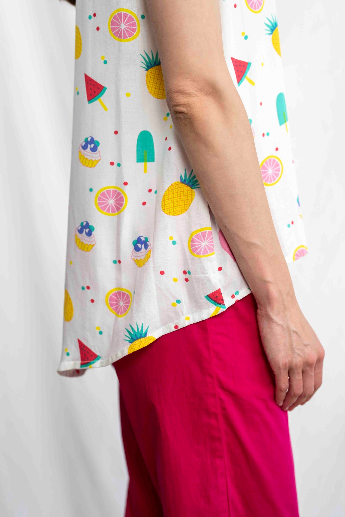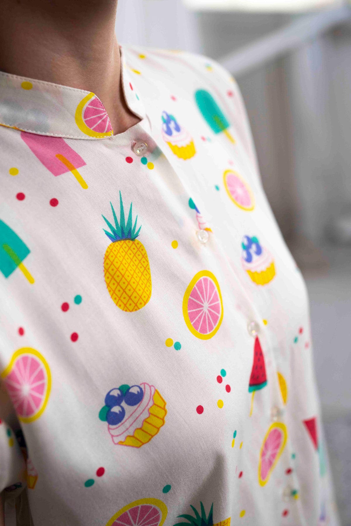 חולצת טוני הכי מתוקה היא חגיגה של צבעים, שמחה וסטייל – כמו קינוח קיצי מרענן שלא רוצים שייגמר. ההדפס כולל עוגות, שלגונים, פירות קיץ עסיסיים ונקודות צבעוניות, והכול על רקע לבן שמבליט כל איור בצורה חיה ומלאת אנרגיה. זו חולצה שמצליחה לשלב הומור, שובבות ואסתטיקה מתוחכמת – מושלמת למי שמחפשת להמתיק את היום שלה (ושל הסובבים) בסטייל מקורי.