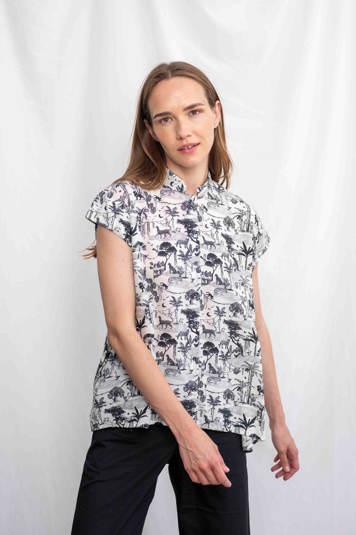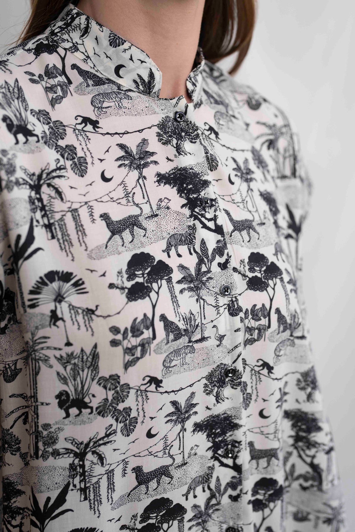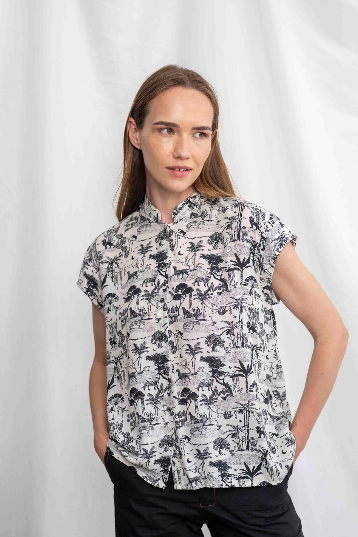 כמו כל חולצות טוני, גם כאן נשמרים האלמנטים האהובים: הגזרה הרחבה והמחמיאה עם הגב הארוך מעט, צווארון סיני שמעניק טאצ' מתוחכם, וכפתורים קטנים שמשתלבים בהרמוניה עם ההדפס. זו חולצה שהיא לא רק יפה – היא מספרת סיפור. מושלמת למי שמחפשת להכניס קצת מהחופש של הטבע והחיות הפראיות אל תוך השגרה העירונית, מבלי לוותר על נוחות ואיכות.