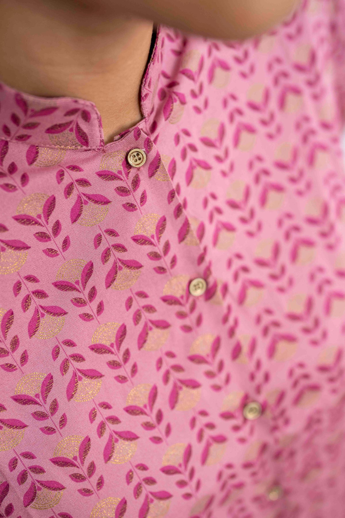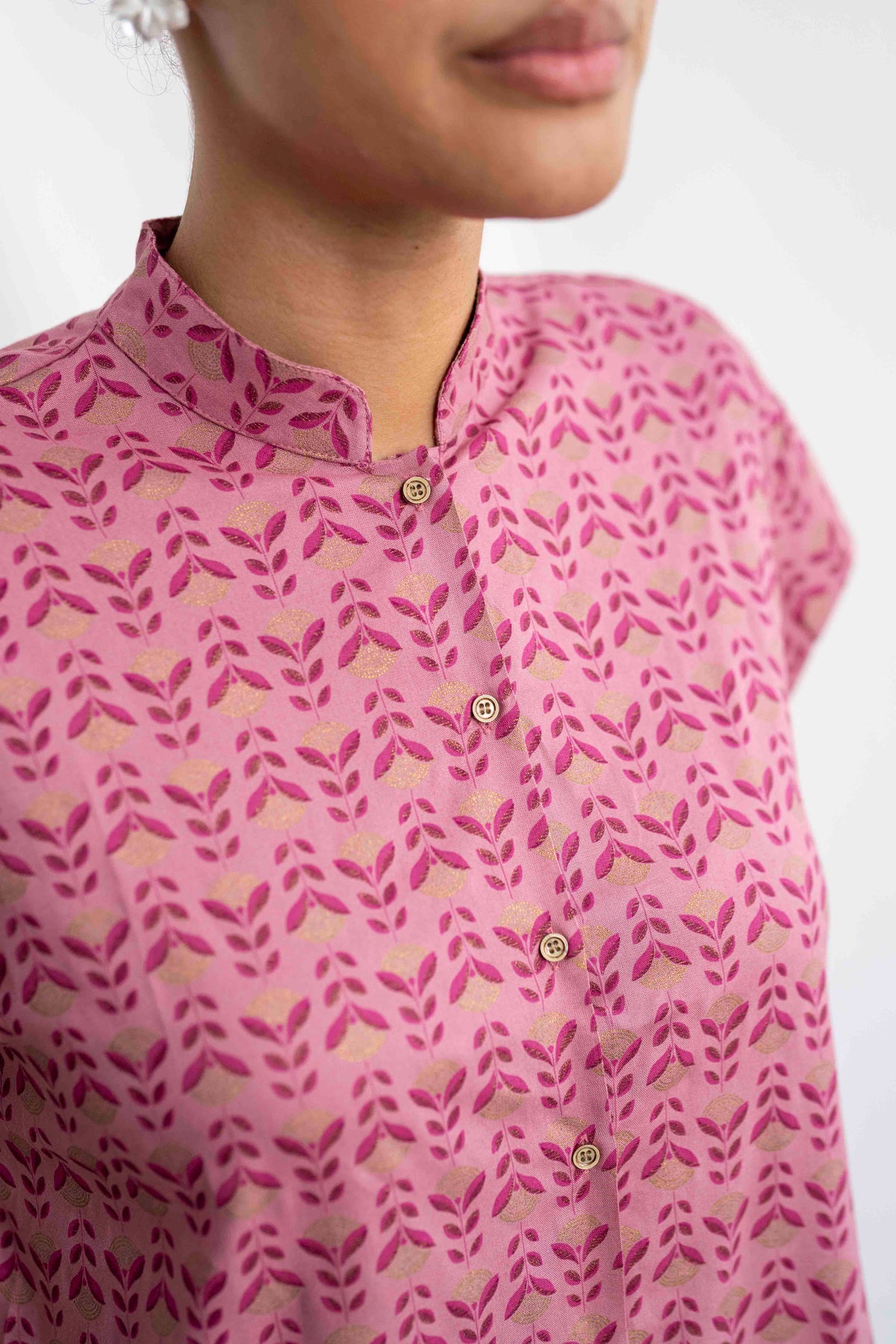 חולצת טוני עדינה במקסימום היא חולצה שמביאה איתה רוך, אלגנטיות ונשיות במידה המדויקת. ההדפס המעודן בגווני ורוד עם עלים קטנים ושילובי זהב מנצנץ יוצר תחושה של עבודת יד אומנותית – כאילו כל פרט בה נרקם בקפידה. הבד עצמו רך ומלטף, עם נגיעת ברק עדינה שמוסיפה לה טאצ' חגיגי אך שומרת על מראה סולידי ואלגנטי.