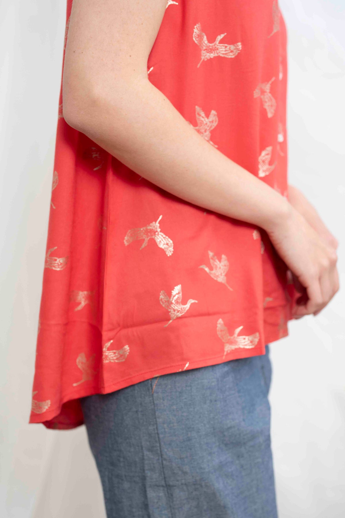 חולצת טוני ציפורים בזהב היא חולצה על זמנית, מעוטרת בהדפס זהב מסורתי בדוגמה של ציפורים חופשיות.