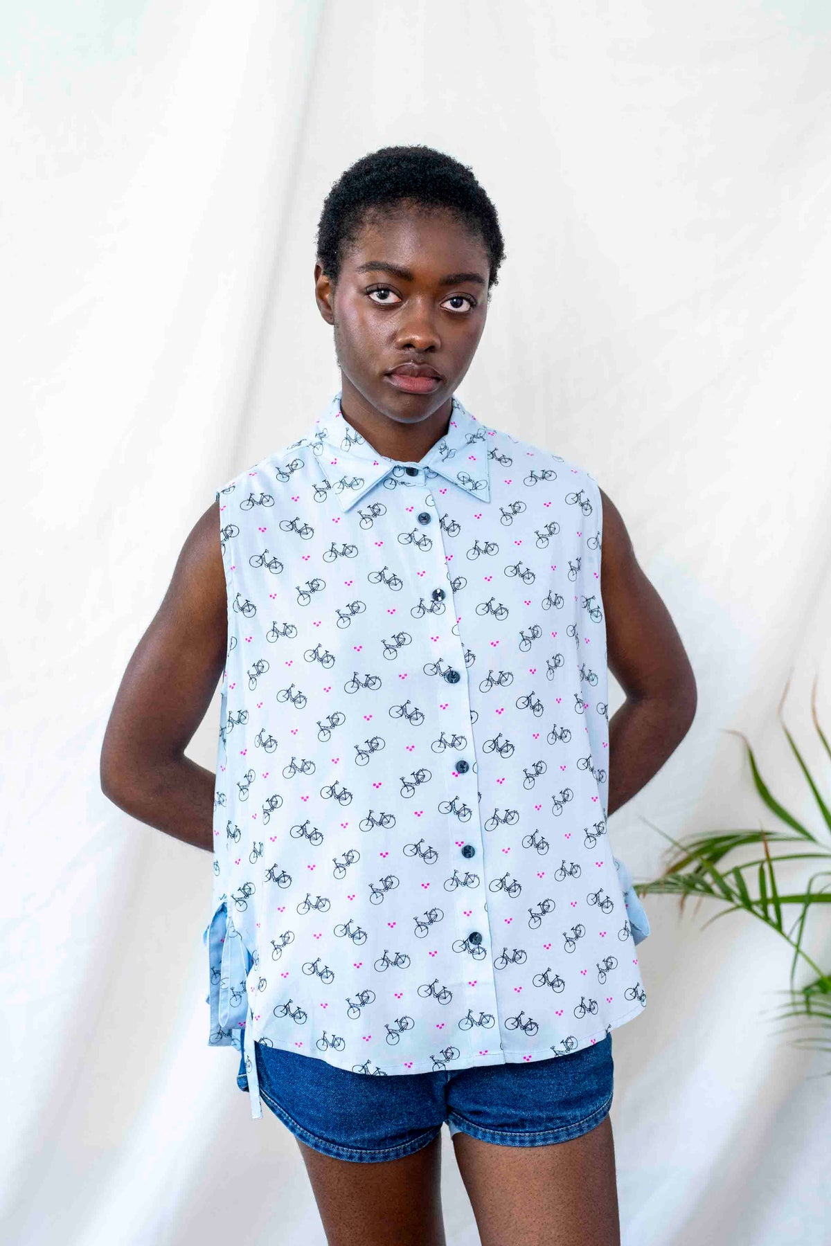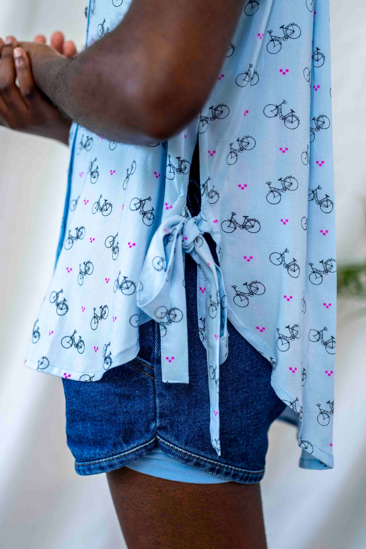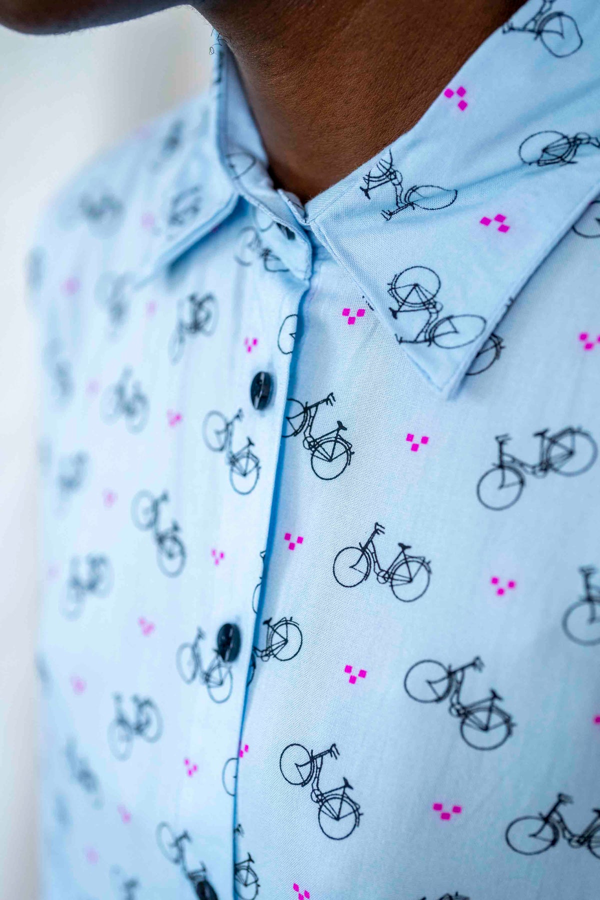 חולצת פפיון הכי תל אביבית ואולי בכלל אמסטרדמית? חולצה בגוון תכלת בהיר מעוטרת באופניים ועיטורים בורוד.