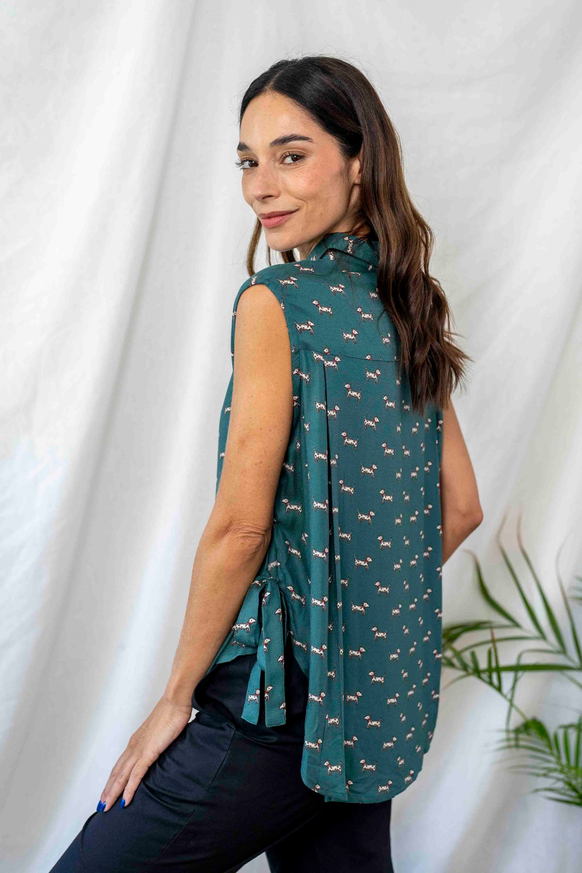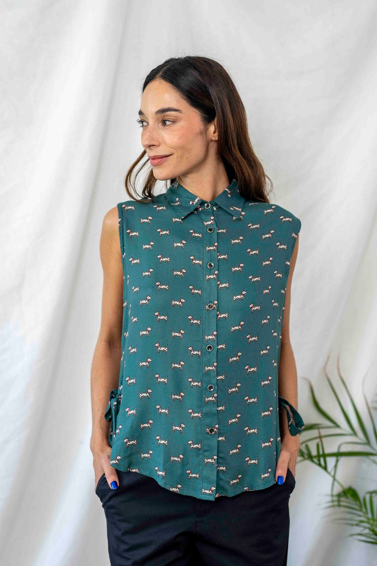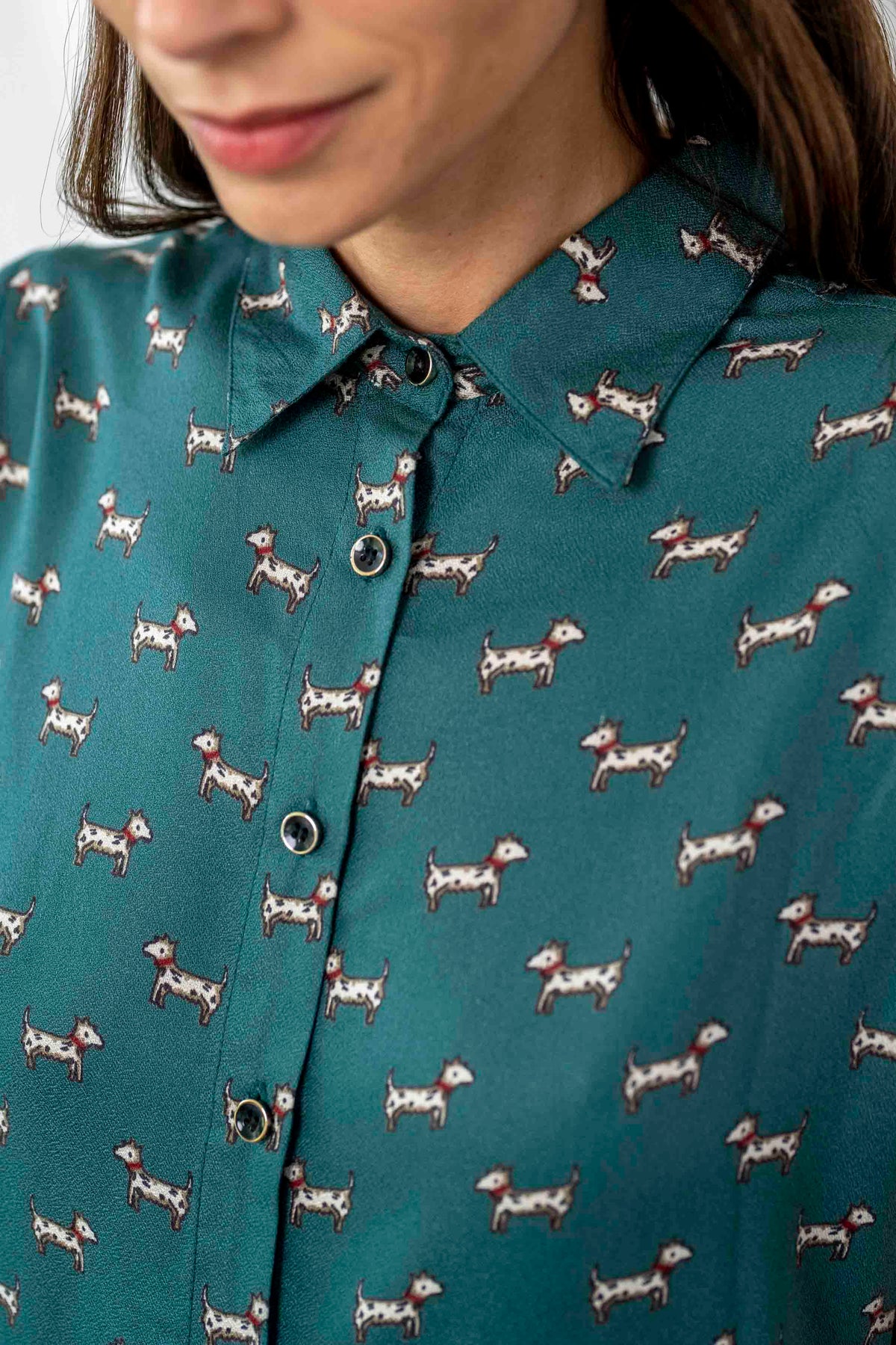 חולצת פפיון כלבלבים בעלת גוון טורקיזי משובח ודוגמה עדינה מוס בבד, נופלת מושלם על הגוף.