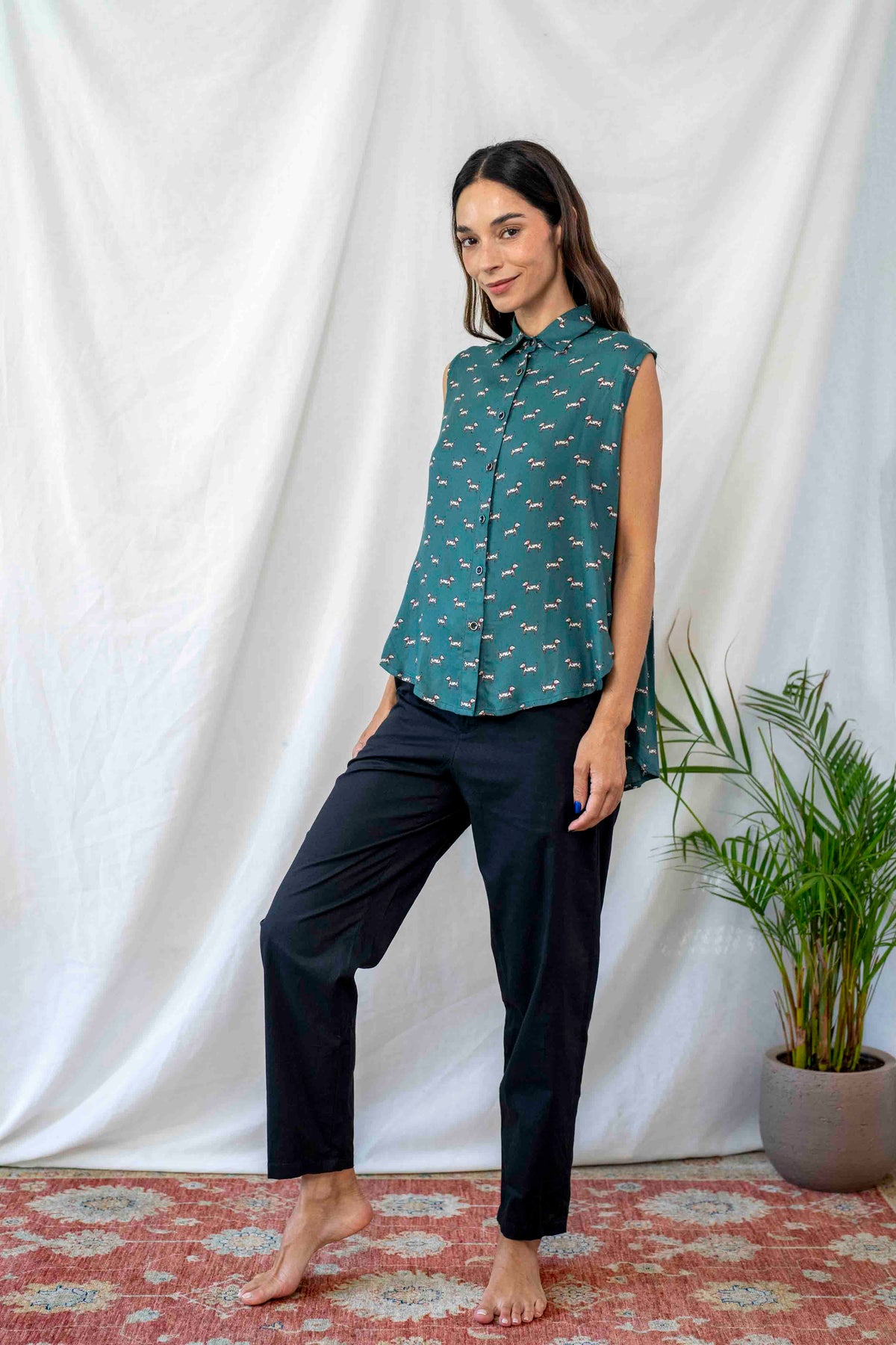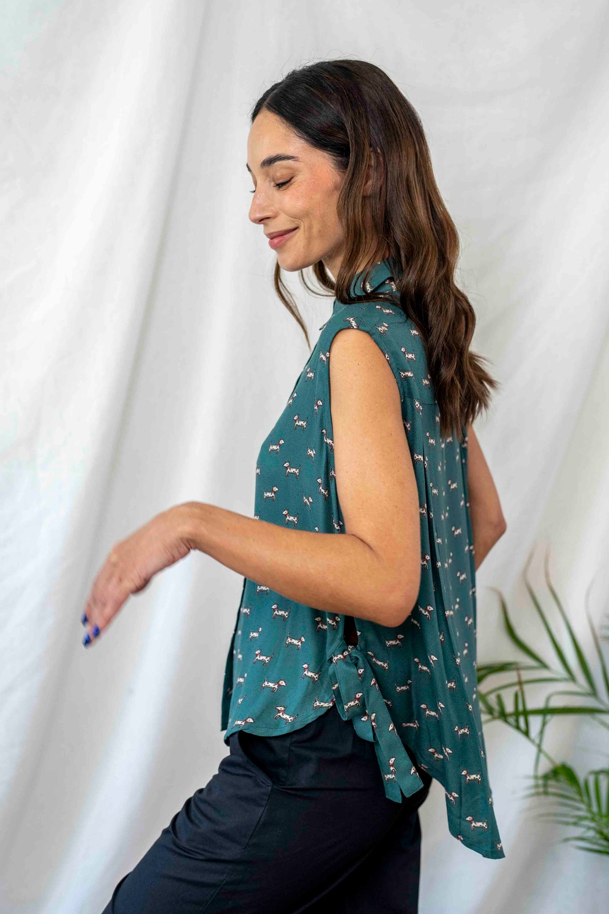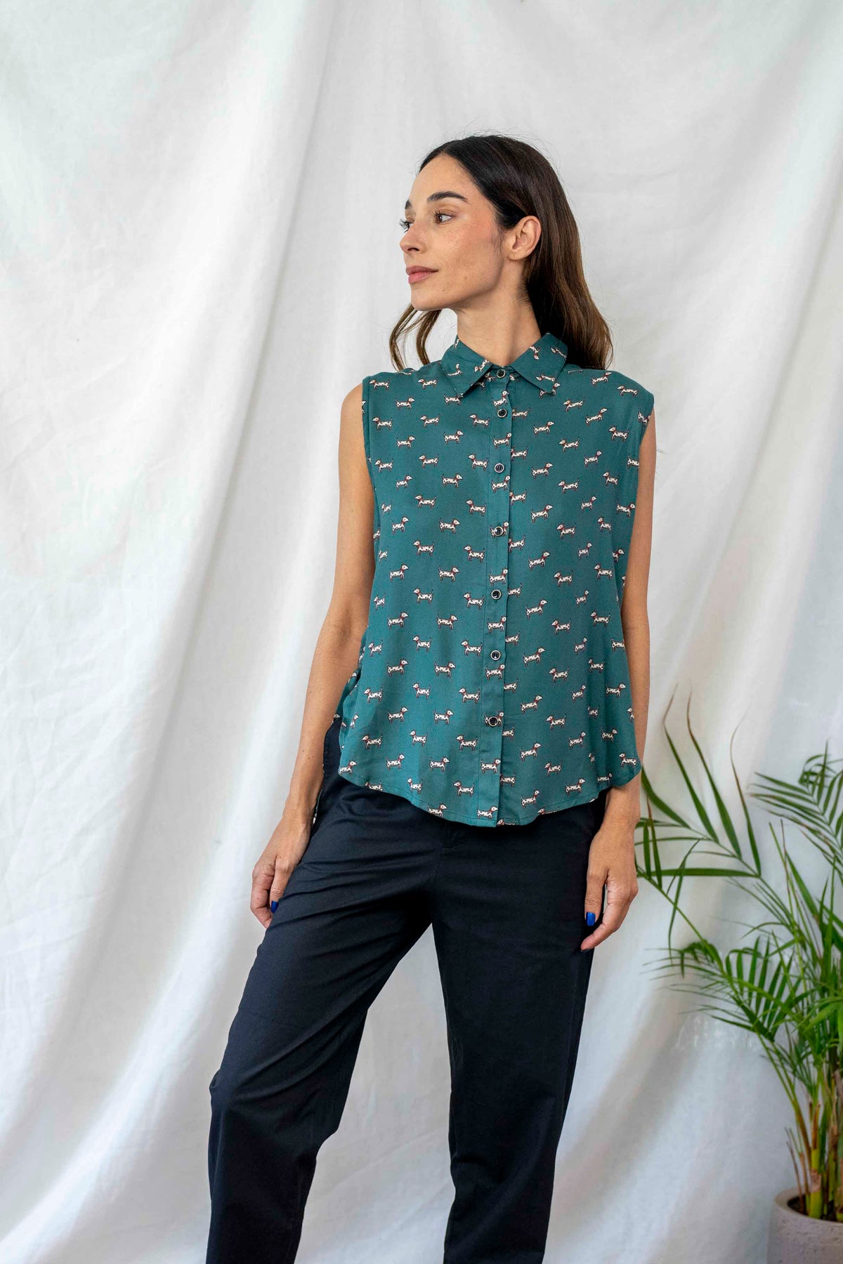 חולצת פפיון כלבלבים בעלת גוון טורקיזי משובח ודוגמה עדינה מוס בבד, נופלת מושלם על הגוף.