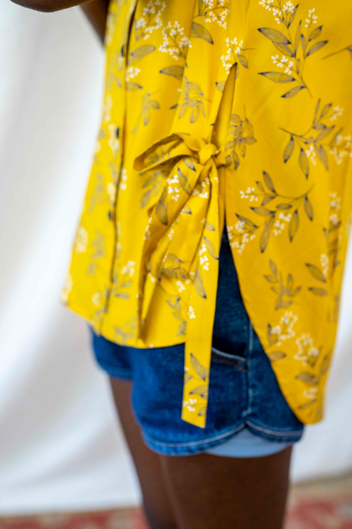 חולצת פפיון פירסט בלוסום בעלת גוון צהוב מוזהב ייחודי, עם מוטיב פרחוני עדין, חולצה מאירה ומשמחת העשויה בד רך ומלטף.