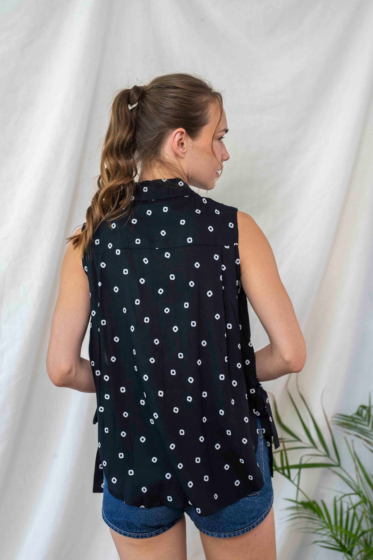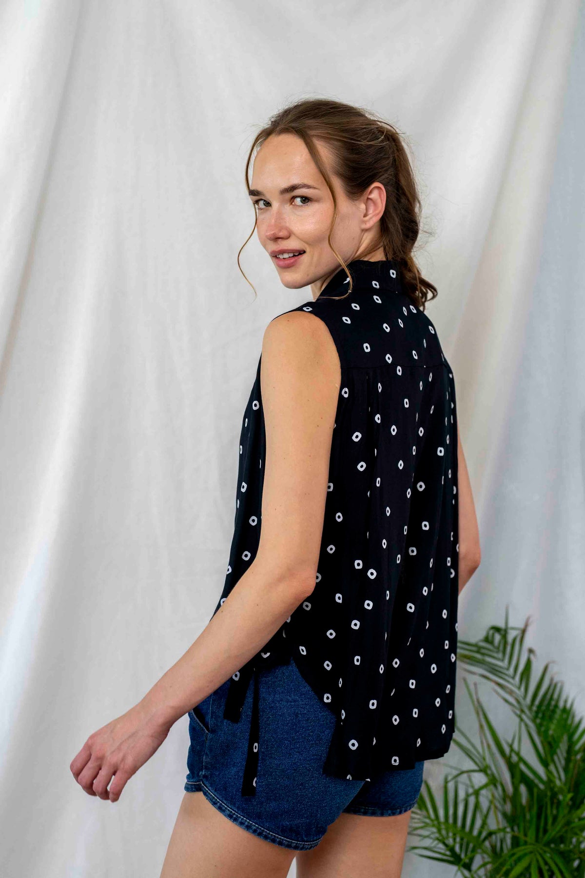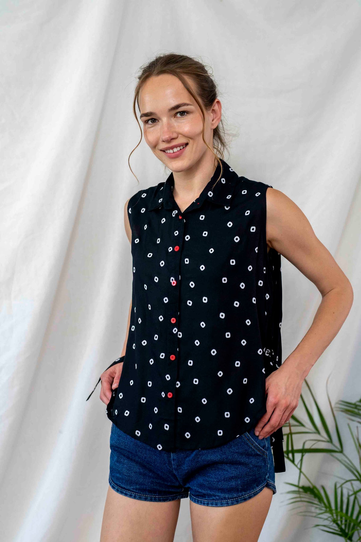 חולצת פפיון בעלת גיזרת אוברסייז משוחררת, רחוקה מהגוף, בעלת צווארון מחוייט ושסעים עמוקים בצידי הגוף, הנקשרים בסרט. החולצה עוצבה למזג האוויר הדביק הזה בדיוק, כשלא בא לך ששום דבר ייגע בך ועדיין מתחשק לך להראות מעולה ולגרוף את כל המחמאות.