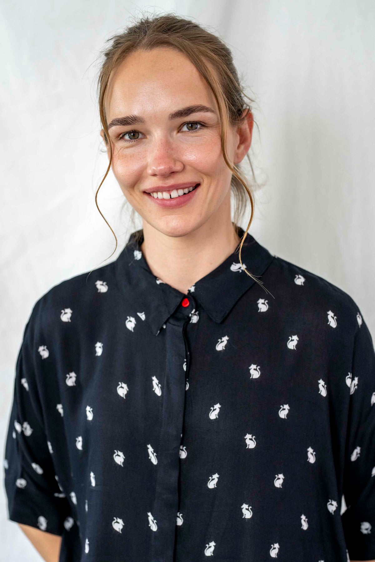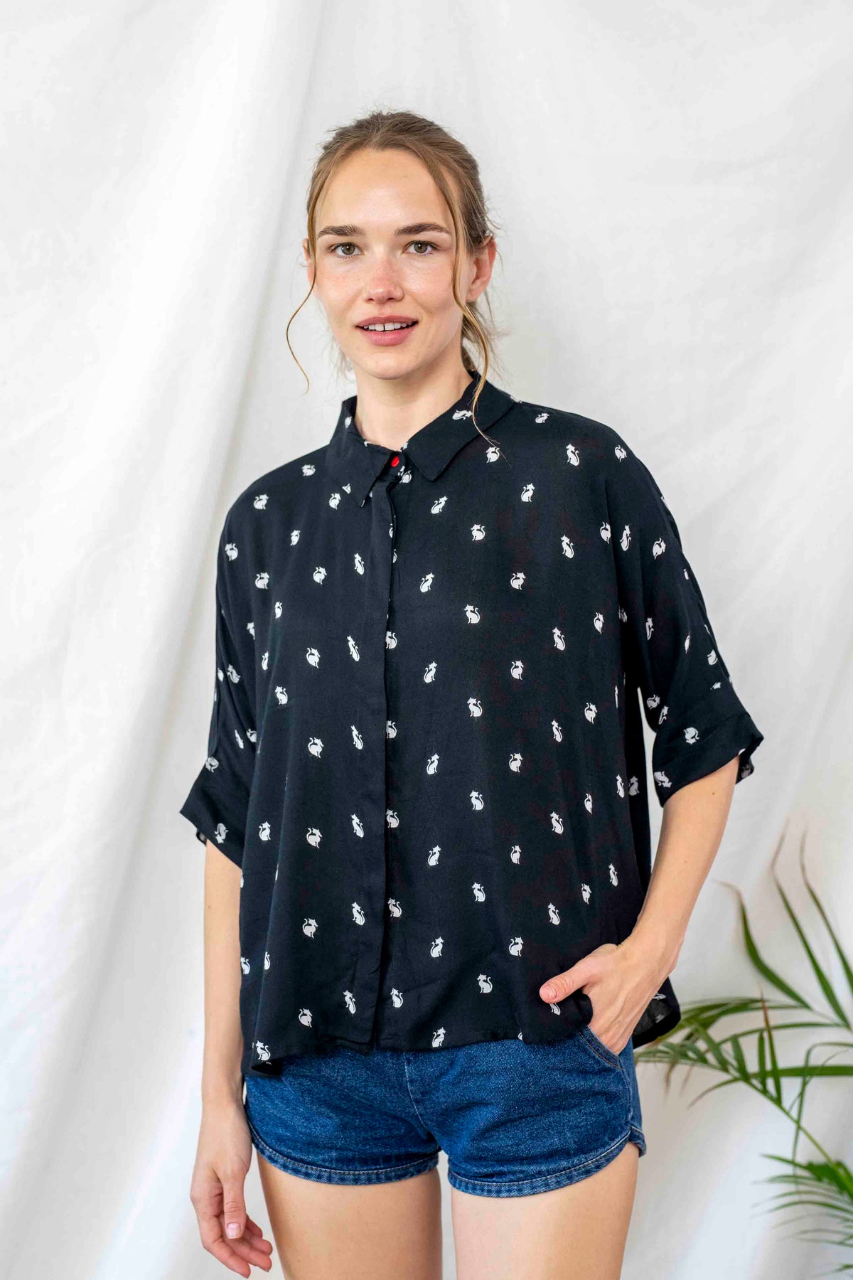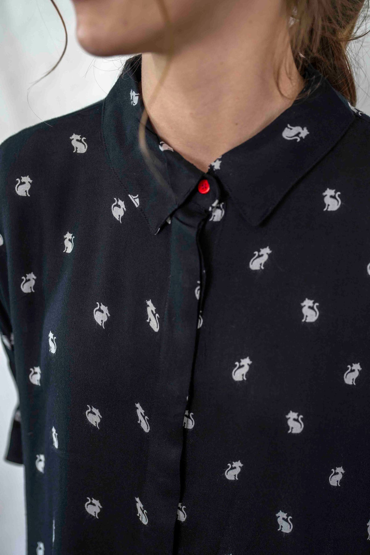 חולצת רובי חתלתולים בשחור לבן עם כפתורים אדומים שמוסיפים שיק לפריט, החולצה הכי נעימה, הכי קלאסית ועם זאת הכי שובבה.