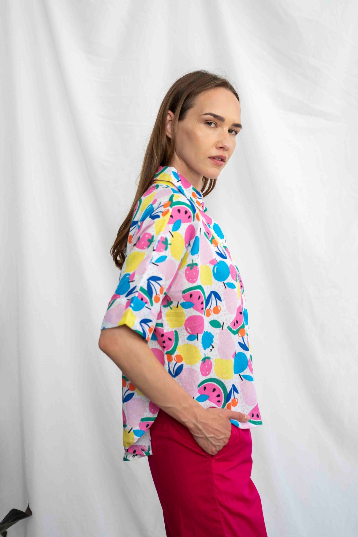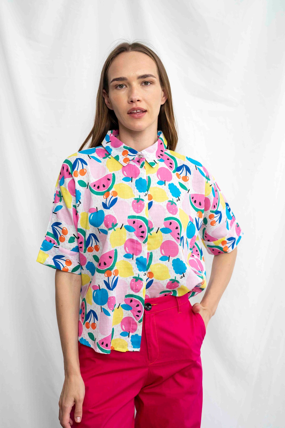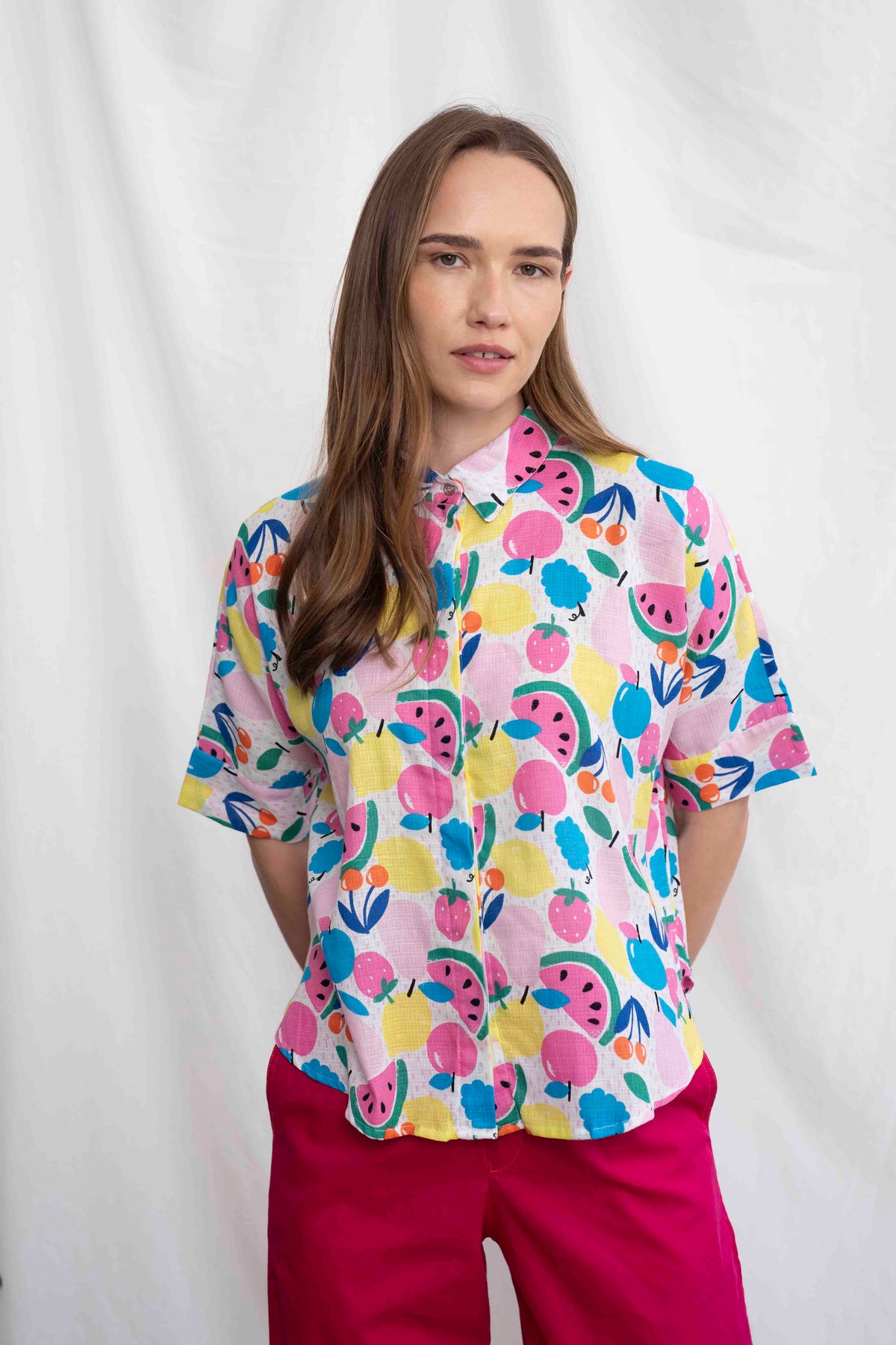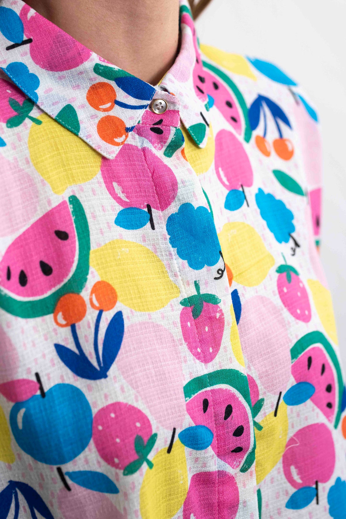 הגזרה הרפויה והנעימה של רובי שומרת על נוחות מקסימלית בלי לוותר על מראה מחויט ונקי – עם שרוולים קצרים, צווארון קלאסי וכפתורים קדמיים. בד נושם שמתאים לימים החמים, ועיצוב שמוסיף לכל הופעה אנרגיה קיצית ושובבה. זוהי חולצה שמרימה את מצב הרוח – ממש כמו ביס מפירות טריים ביום שמש.