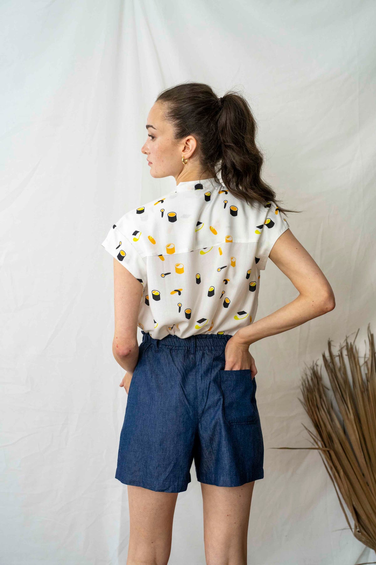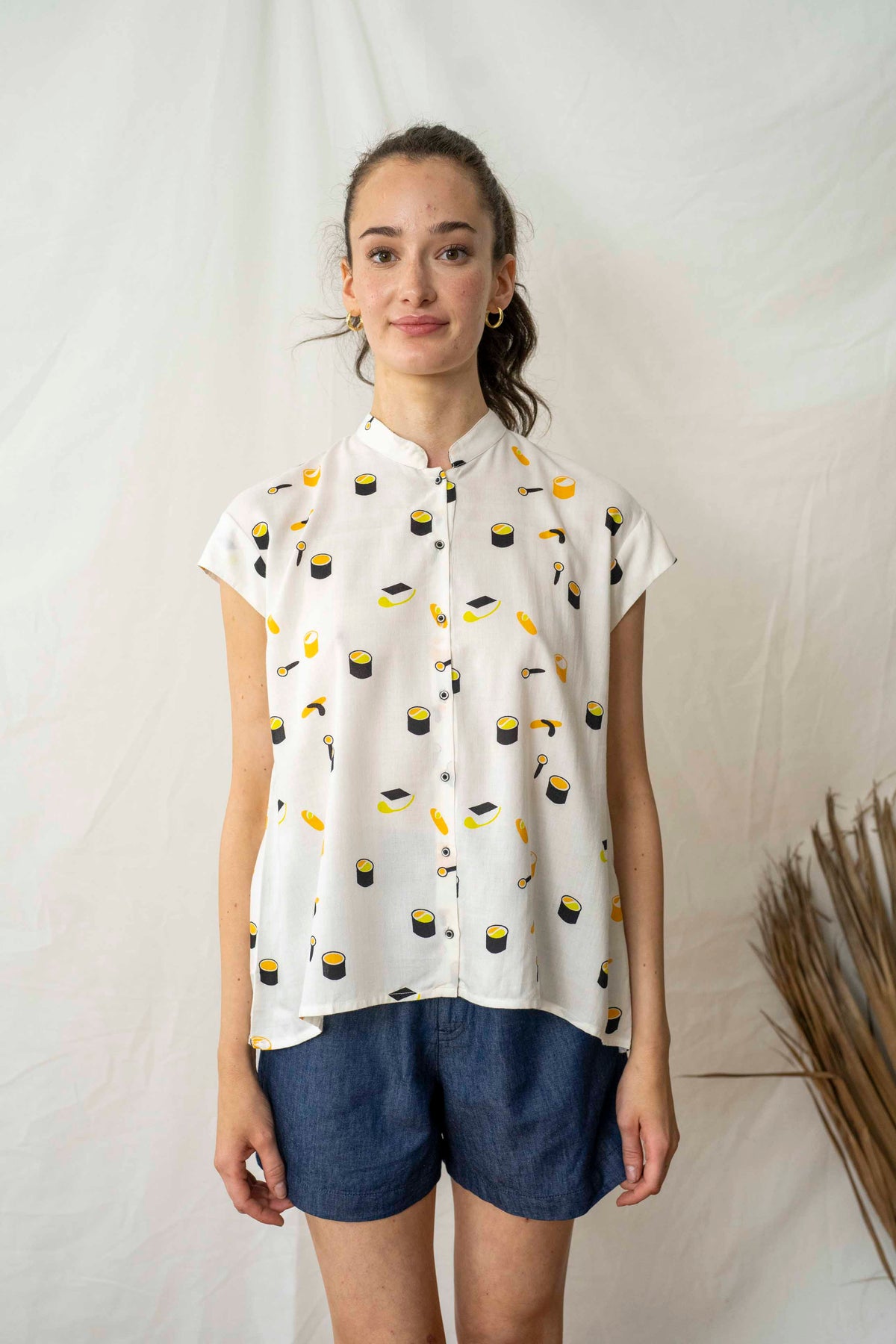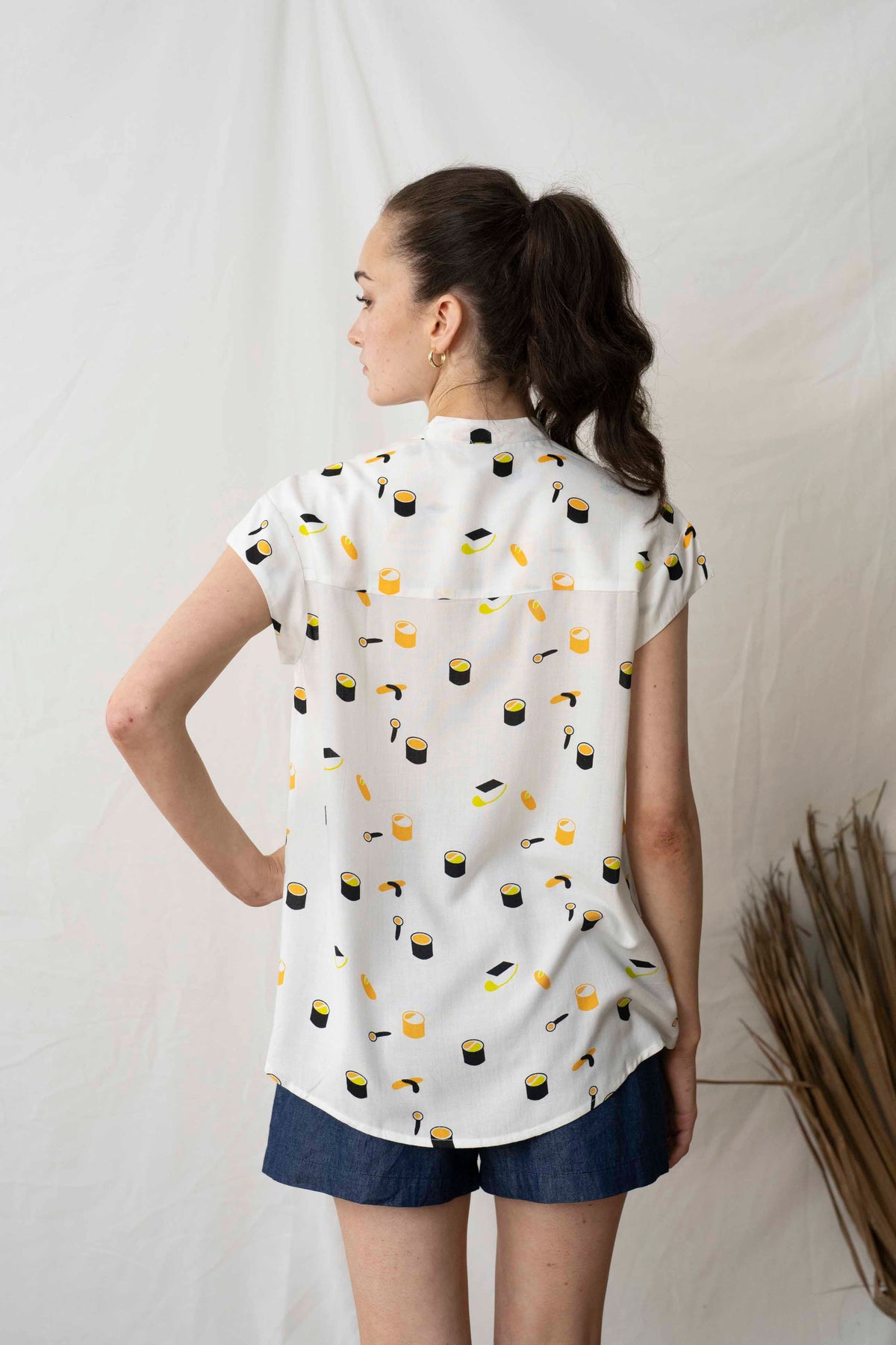 חולצת טוני סושי בניחוח יפני, מעוטרת בנגירי וסושי צבעוניים.