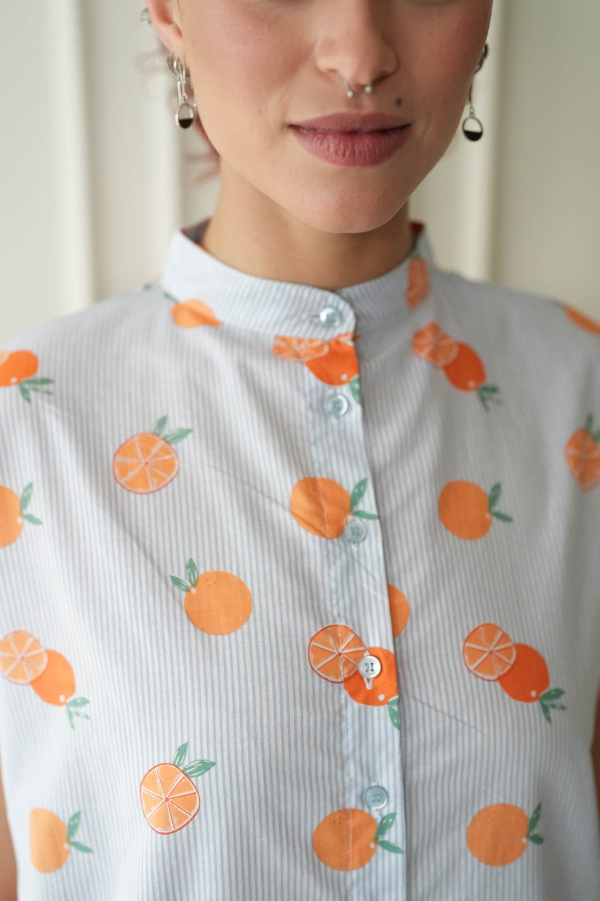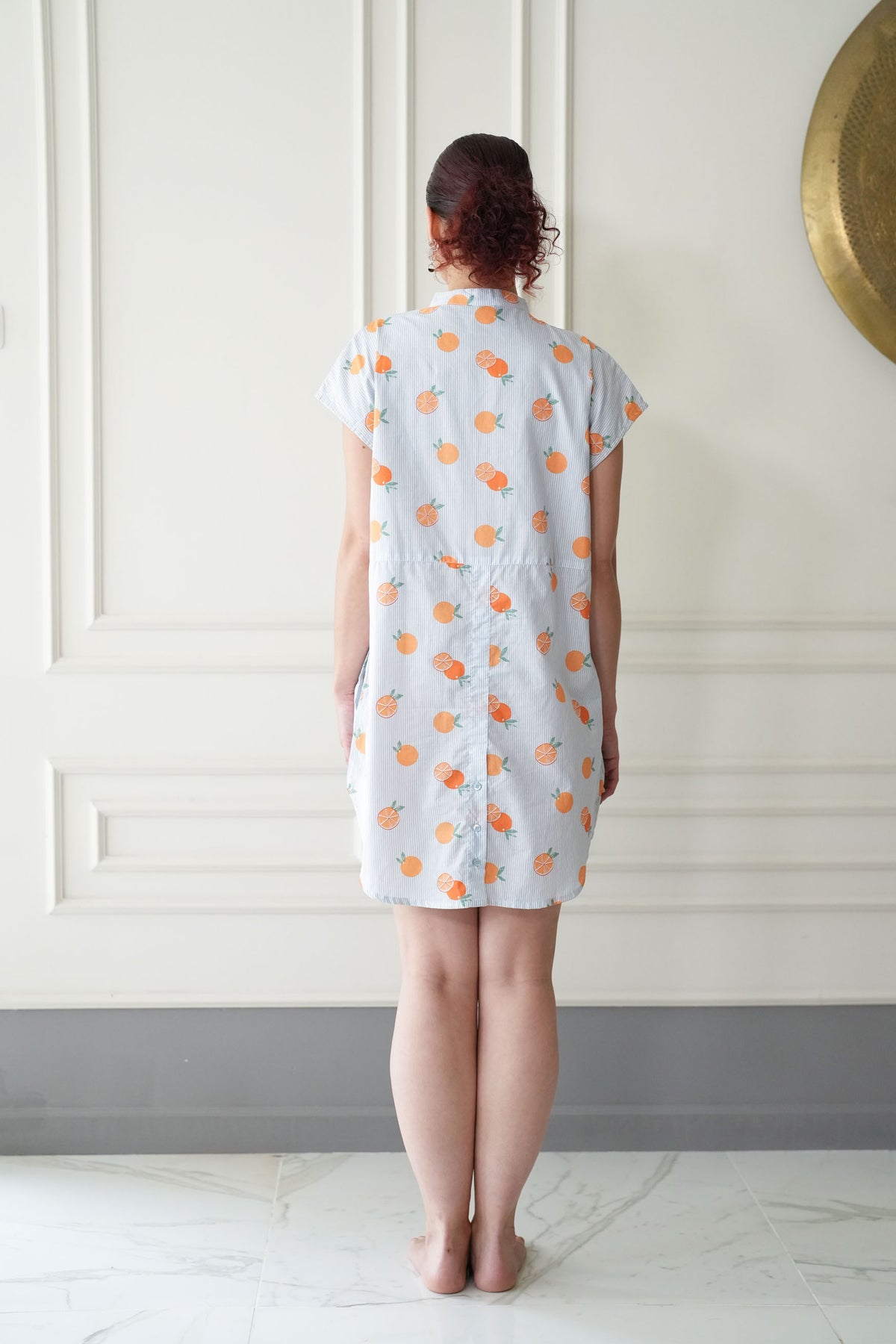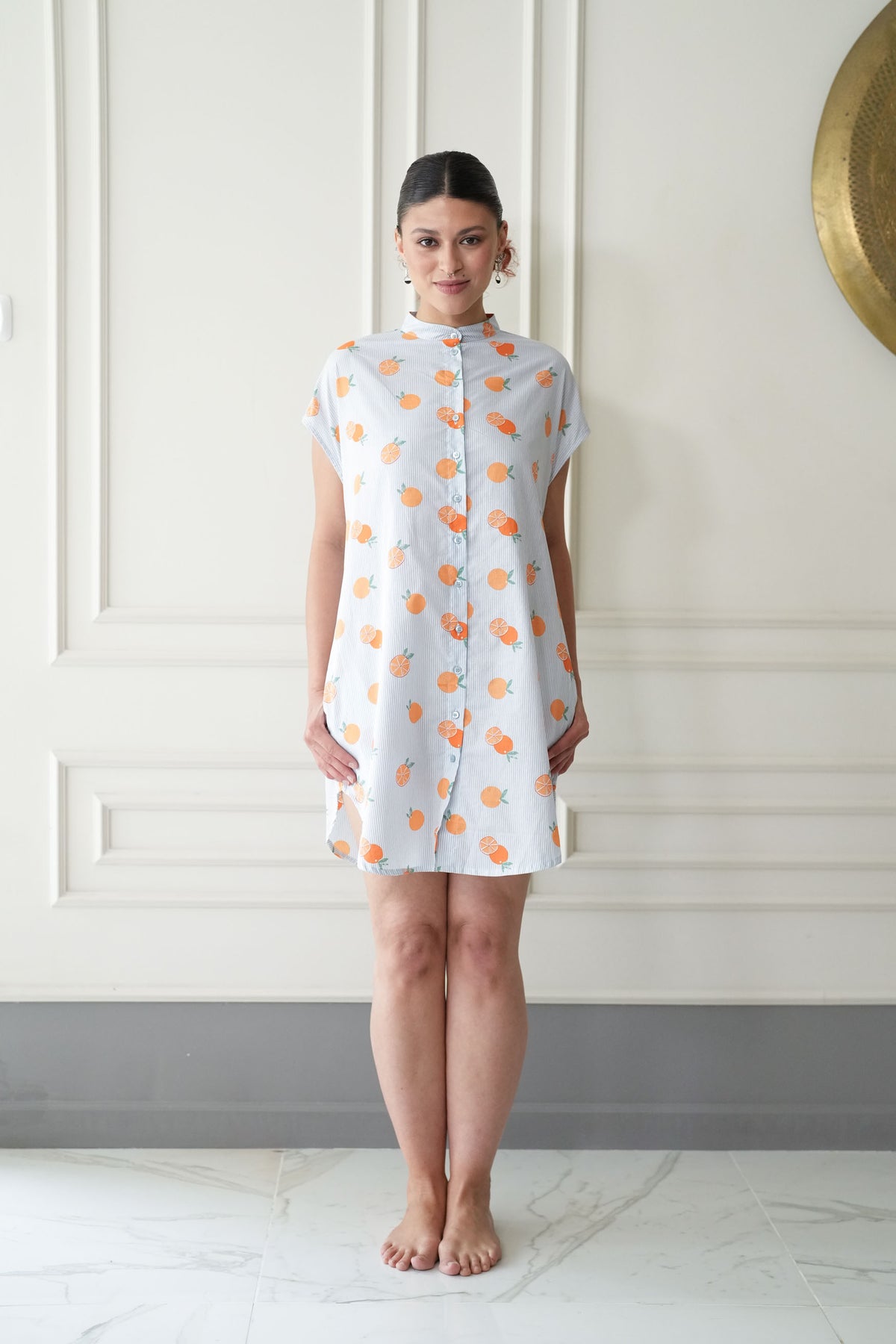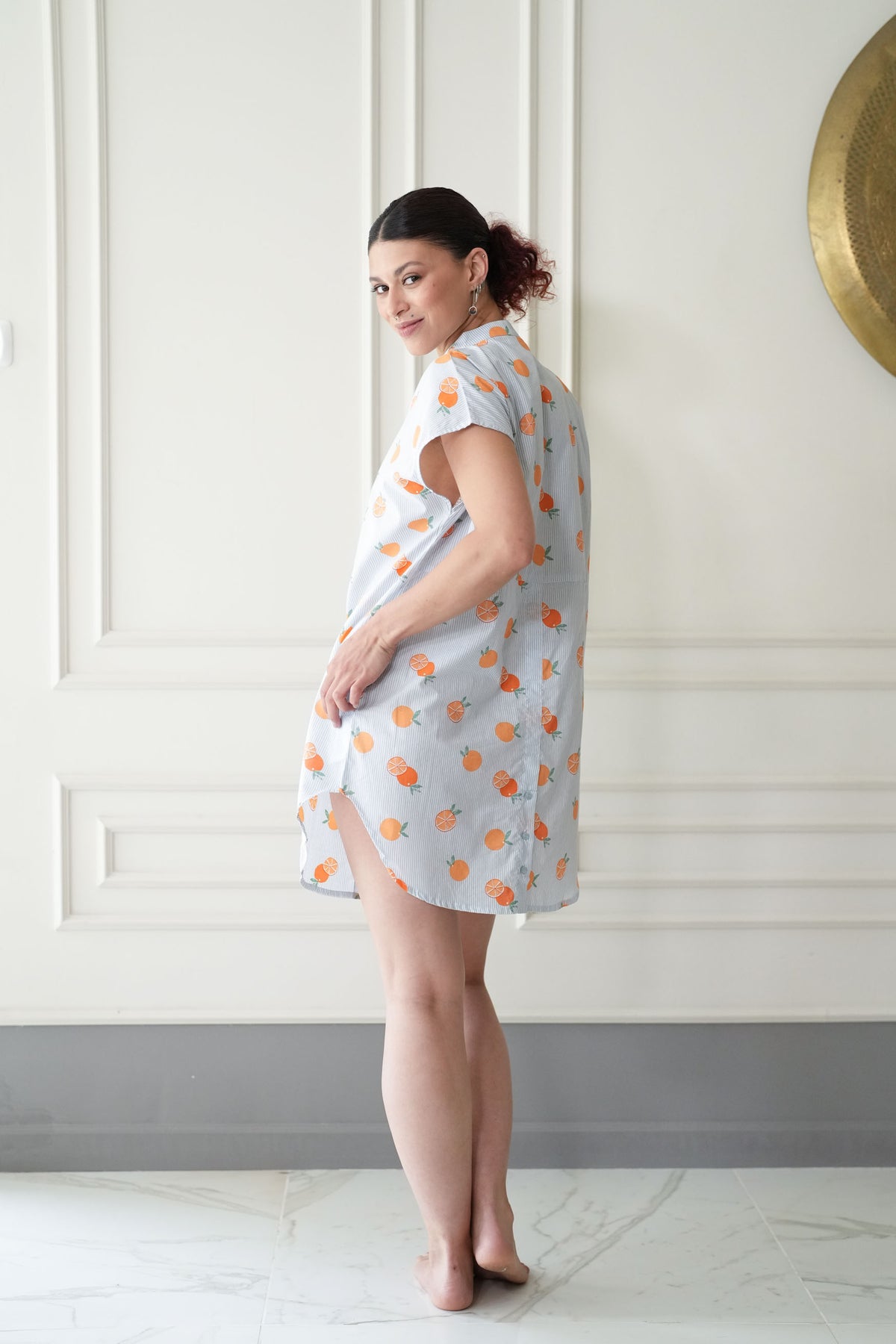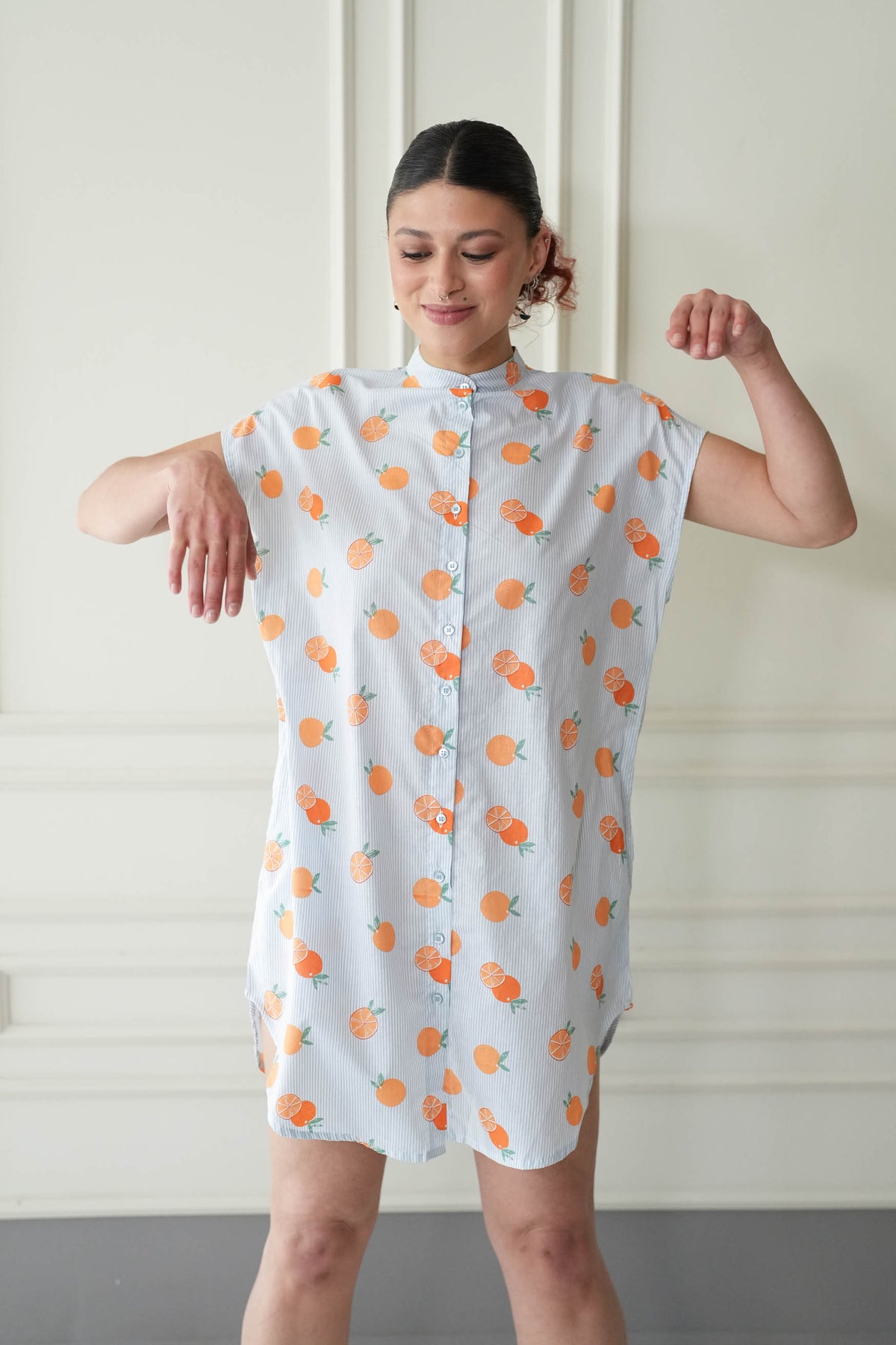 מיני אוברסיז סוף עונת התפוזים היא טוניקה מהממת בצבע לבן מעוטרת בפסי תכלת וכמובן פירות הדר בשלים וכתומים ,