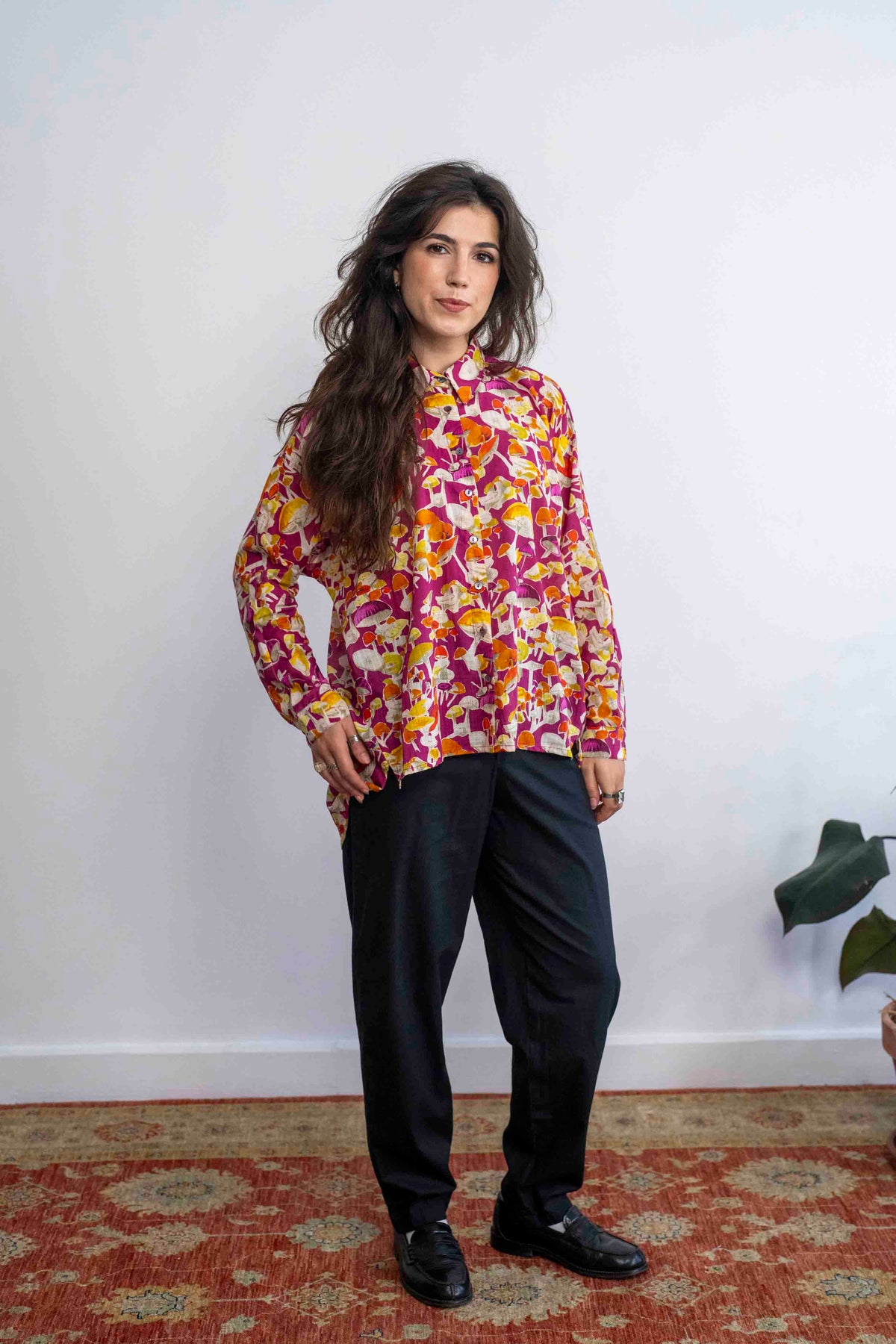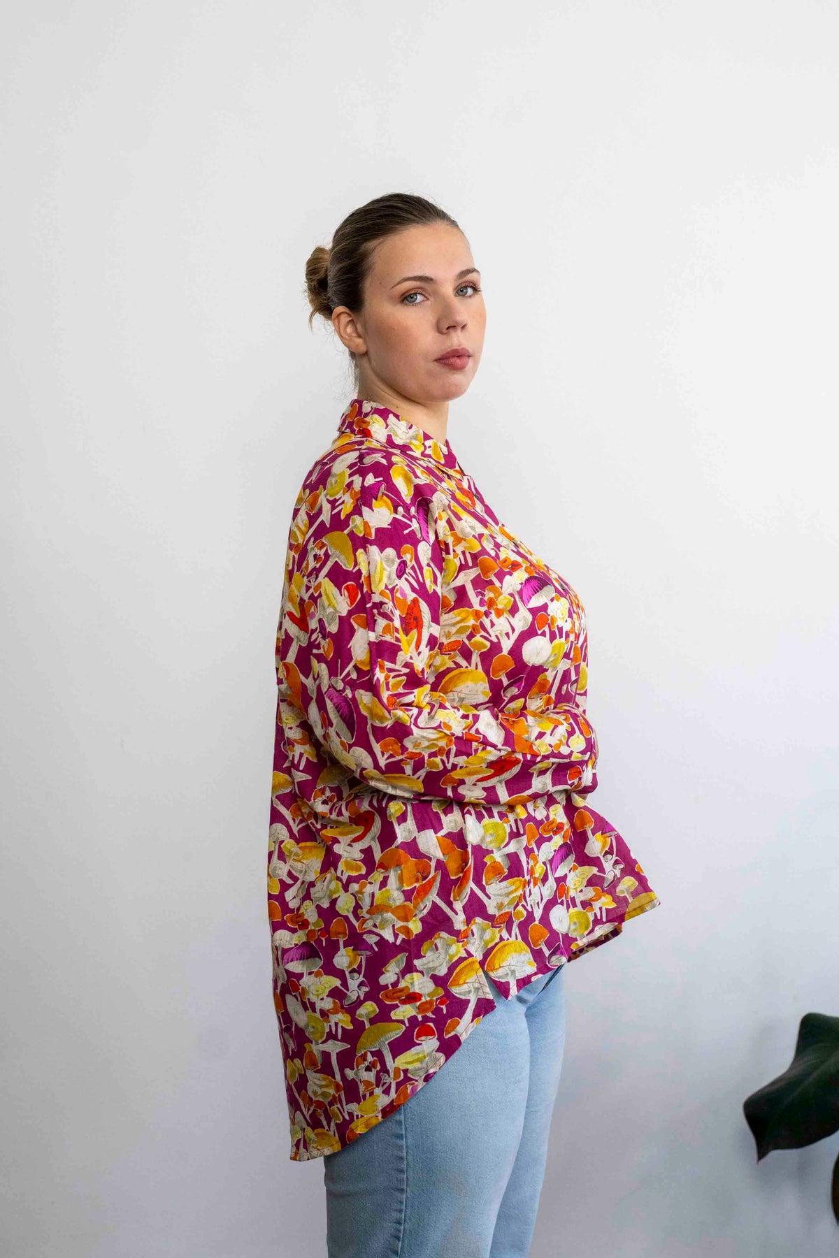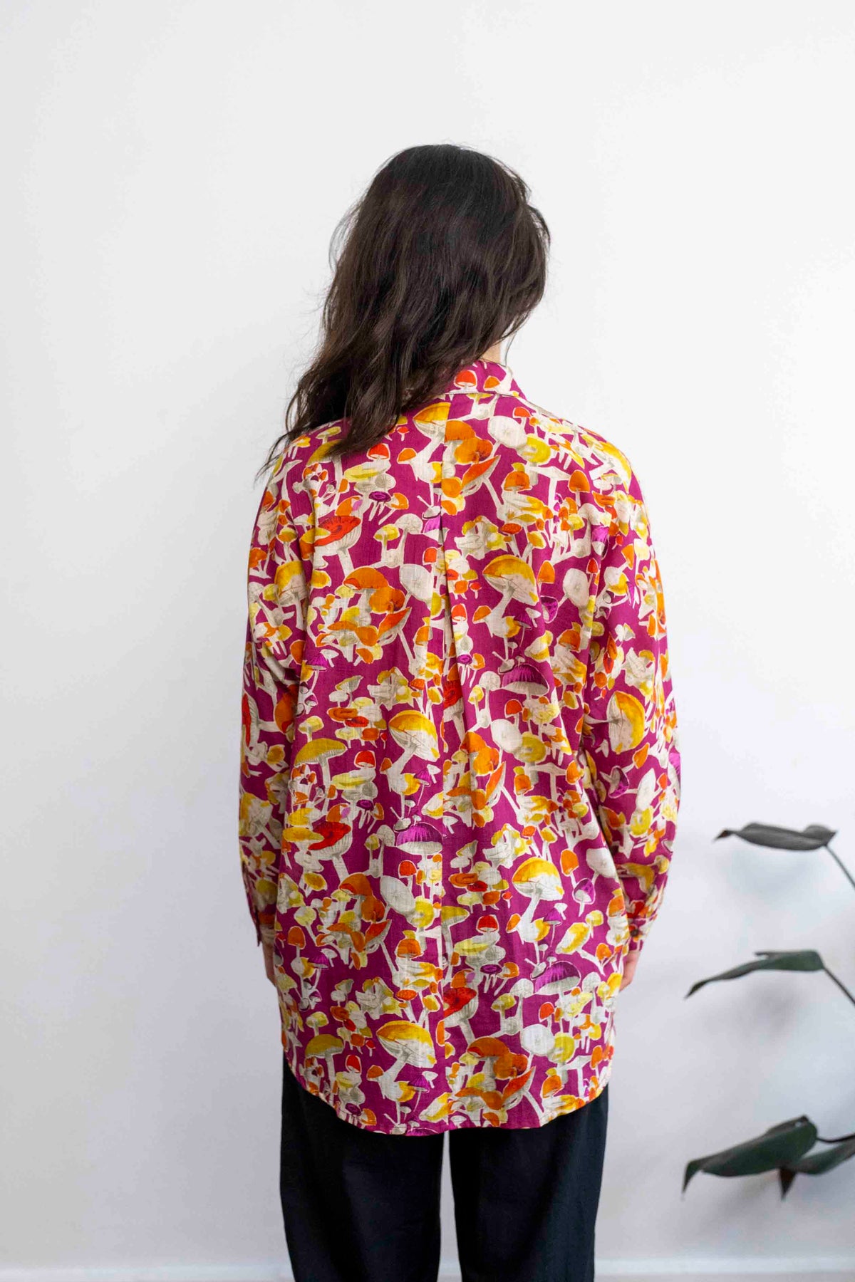 חולצת טוי בצבע סגול עשיר, עם מוטיב חוזר של פטריות יער בכל הגדלים .והצורות