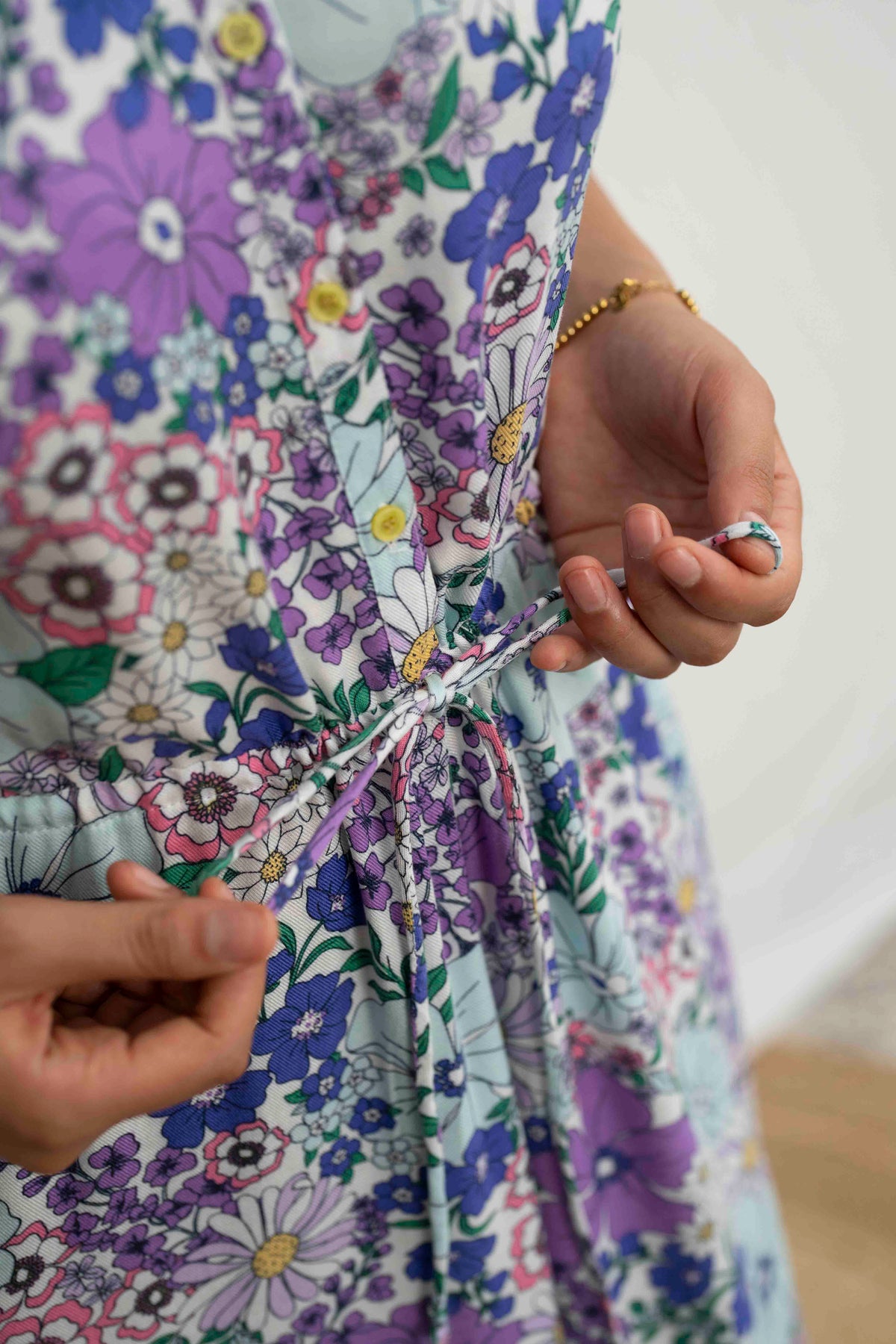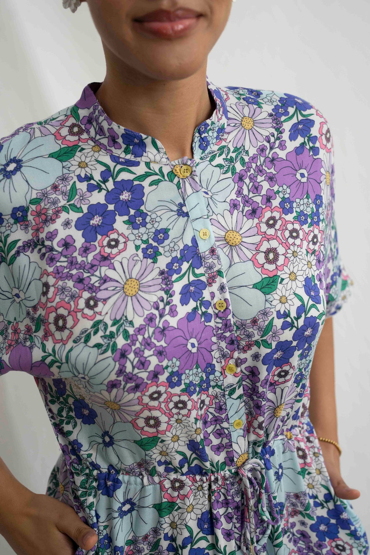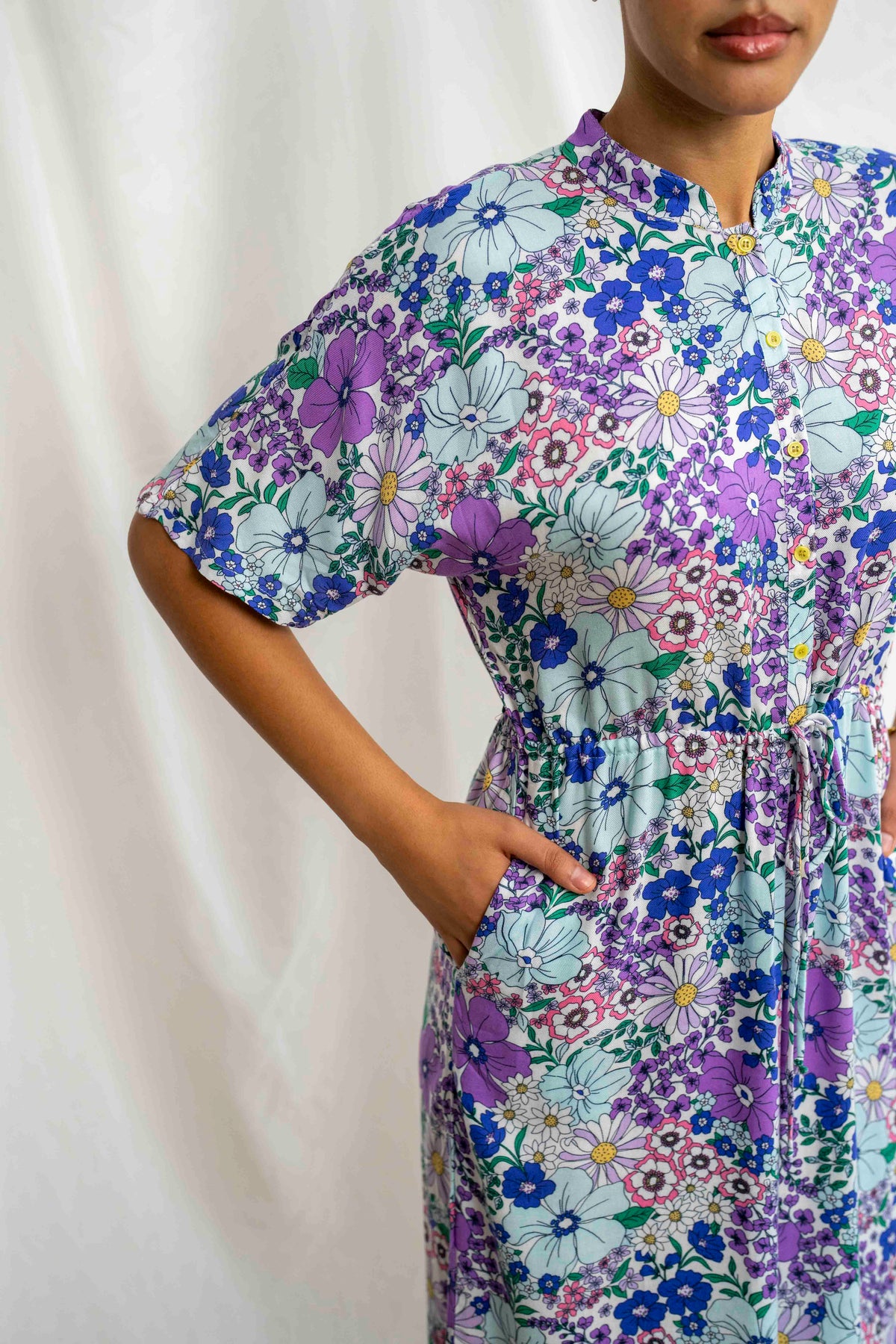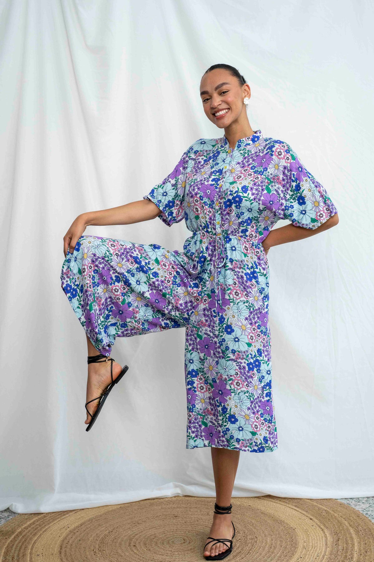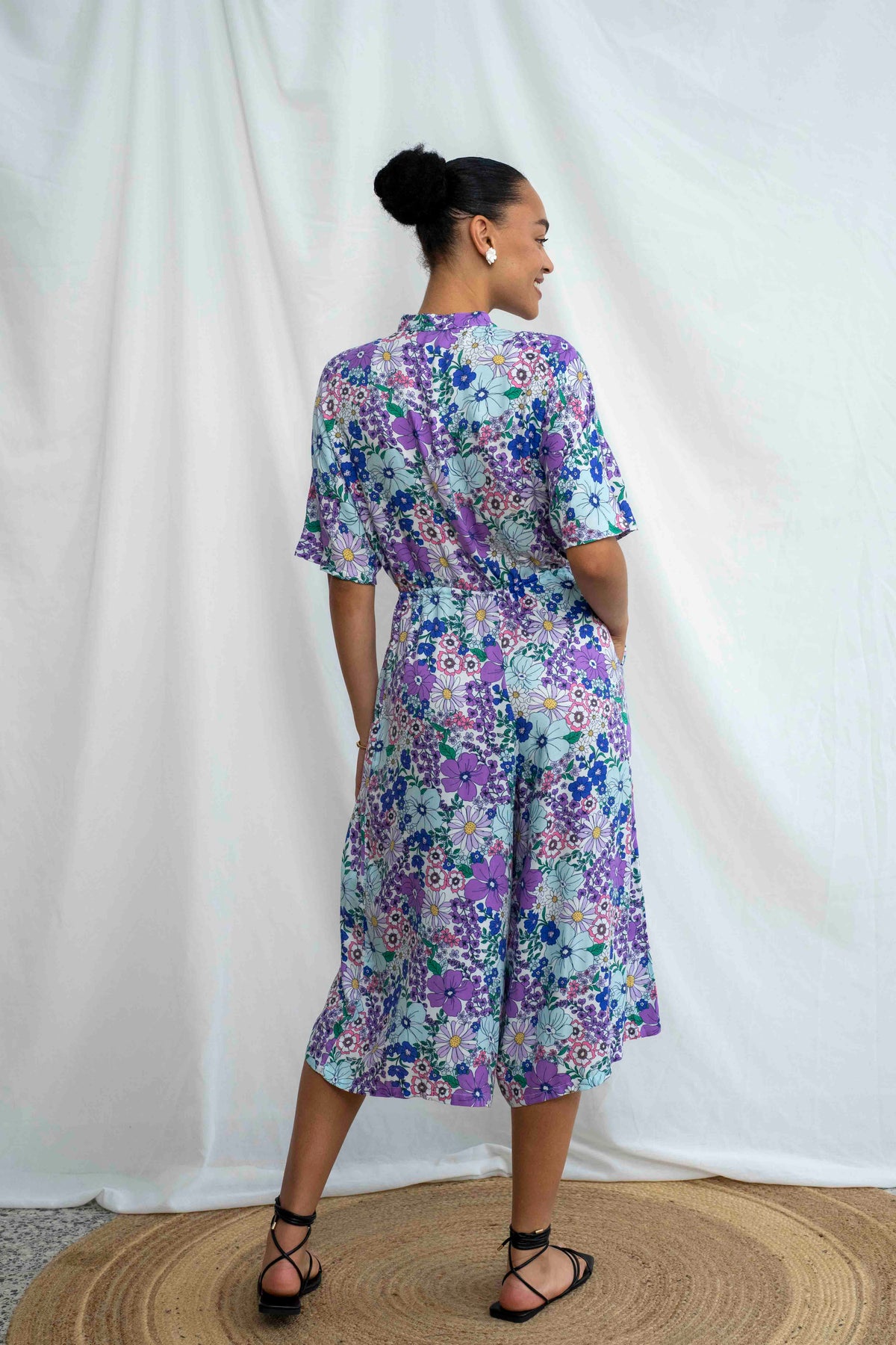אוברול גל בשדות התכלת הוא פרץ של שמחה וצבע, כמו הליכה בתוך שדה פרחים פורח ביום אביבי. ההדפס הצבעוני עם פרחי סגול, תכלת ולבן יוצר מראה קליל, שובה עין ובלתי נשכח. הבד רך, נושם, ומבטיח תחושת נוחות מושלמת לאורך כל היום – בדיוק כמו שאת אוהבת.