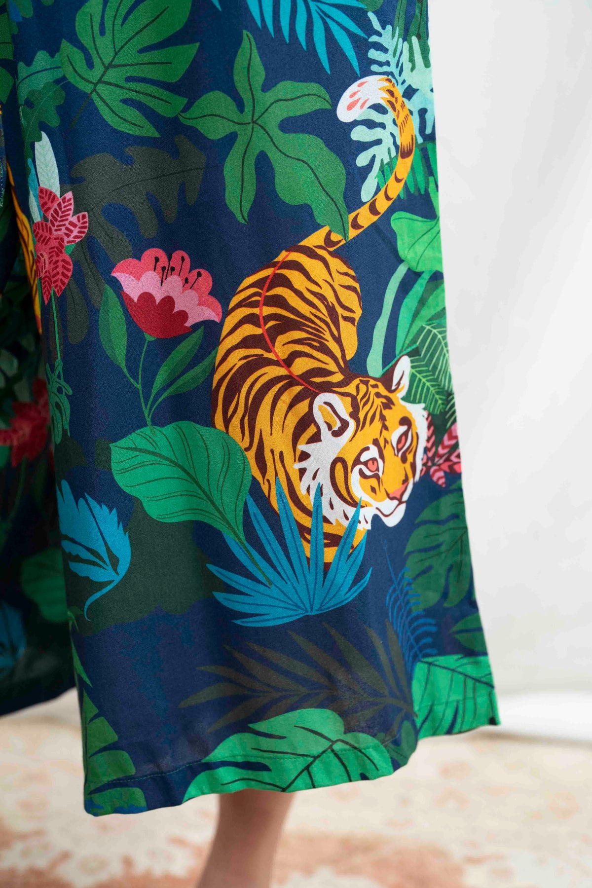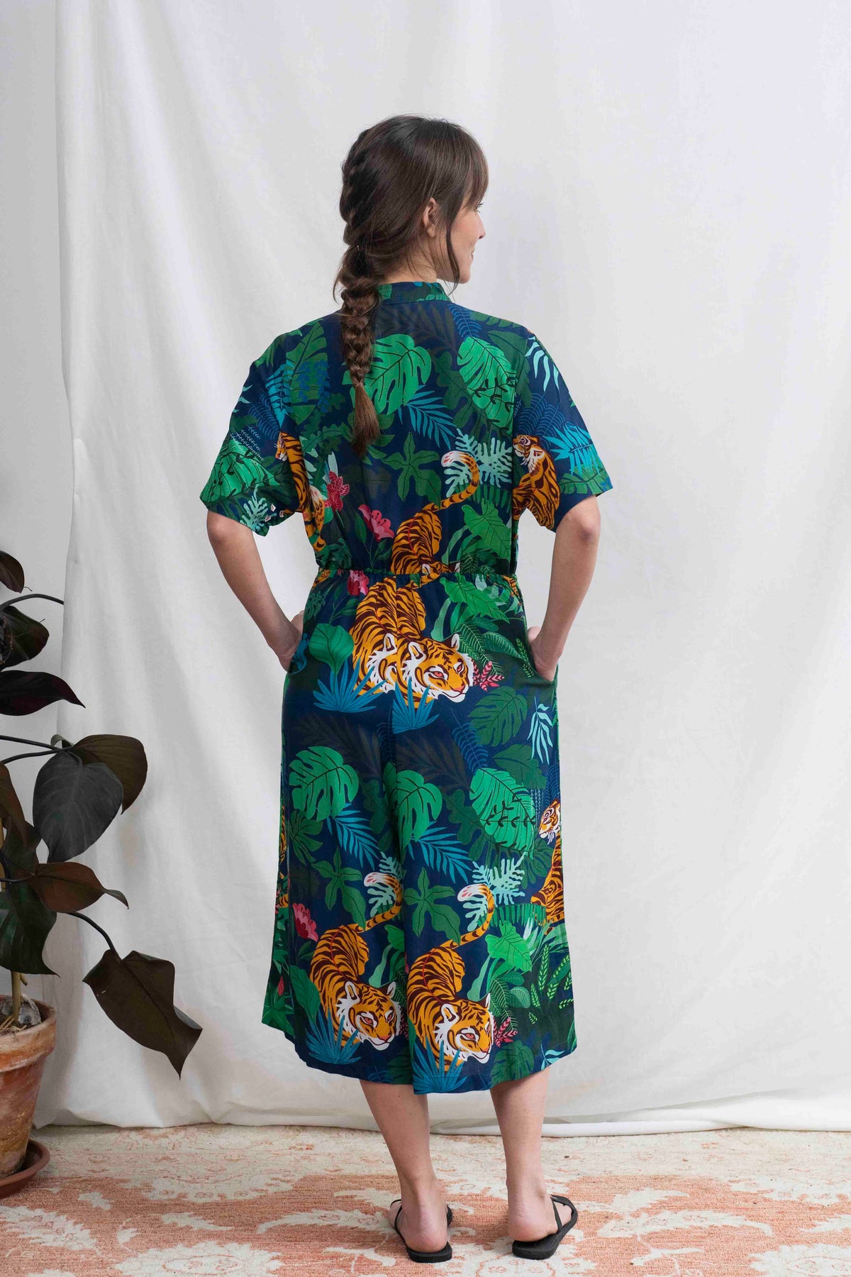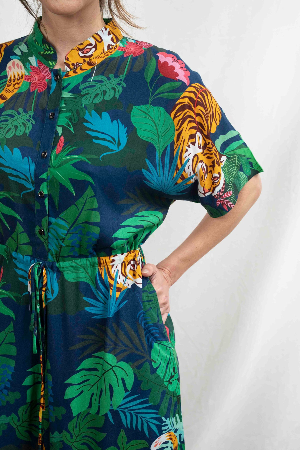 אוברול גל טיגריס בעל צבעוניות טרופית מטריפה ודמות טיגריס אדירה שחוזרת על עצמה בהדפס.