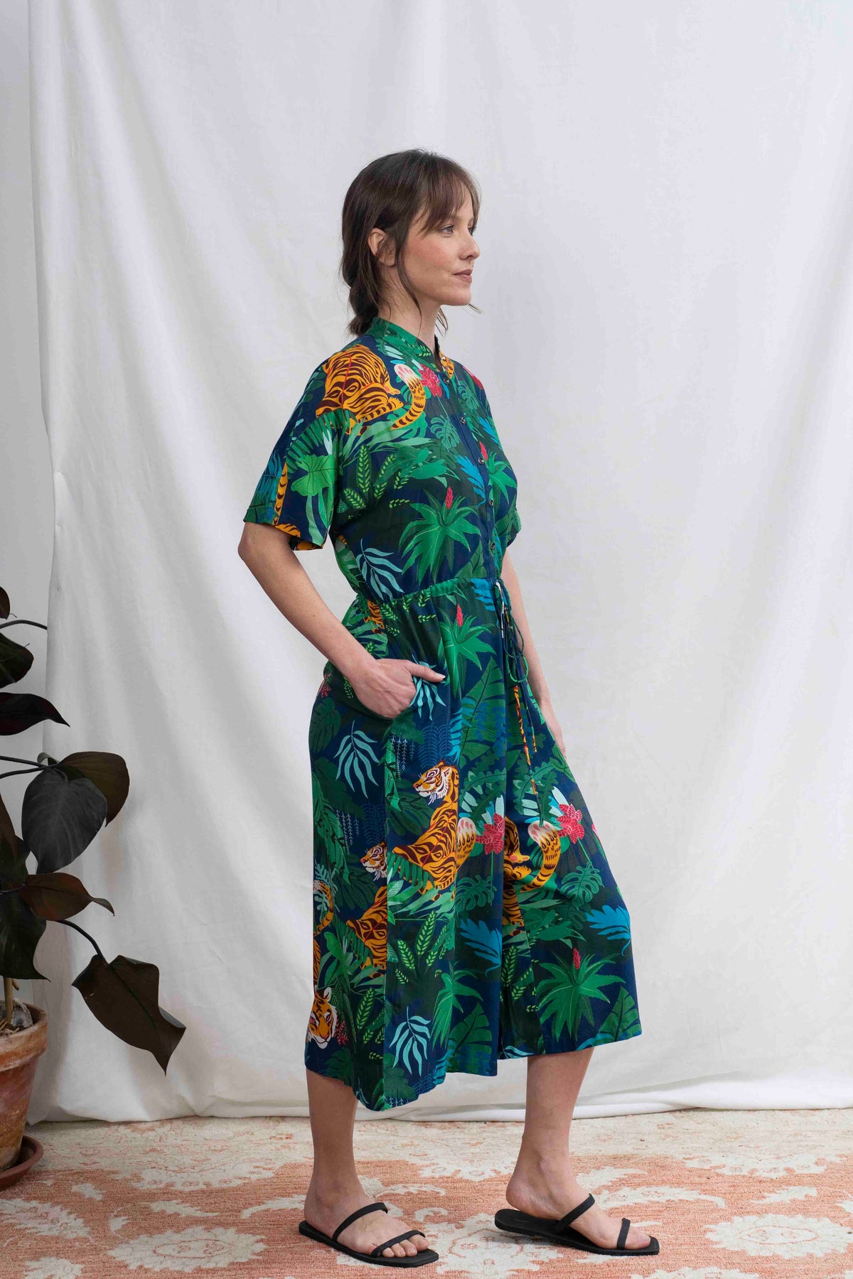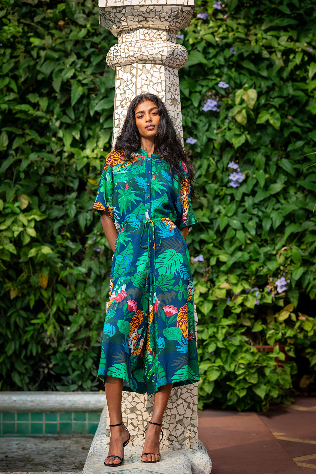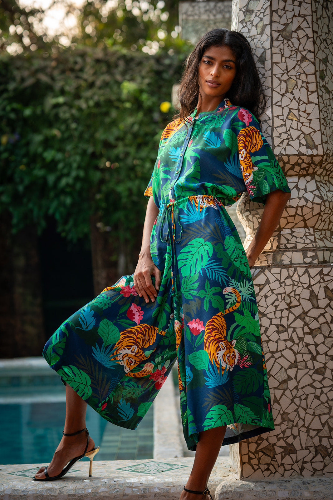 אוברול גל טיגריס בעל צבעוניות טרופית מטריפה ודמות טיגריס אדירה שחוזרת על עצמה בהדפס.