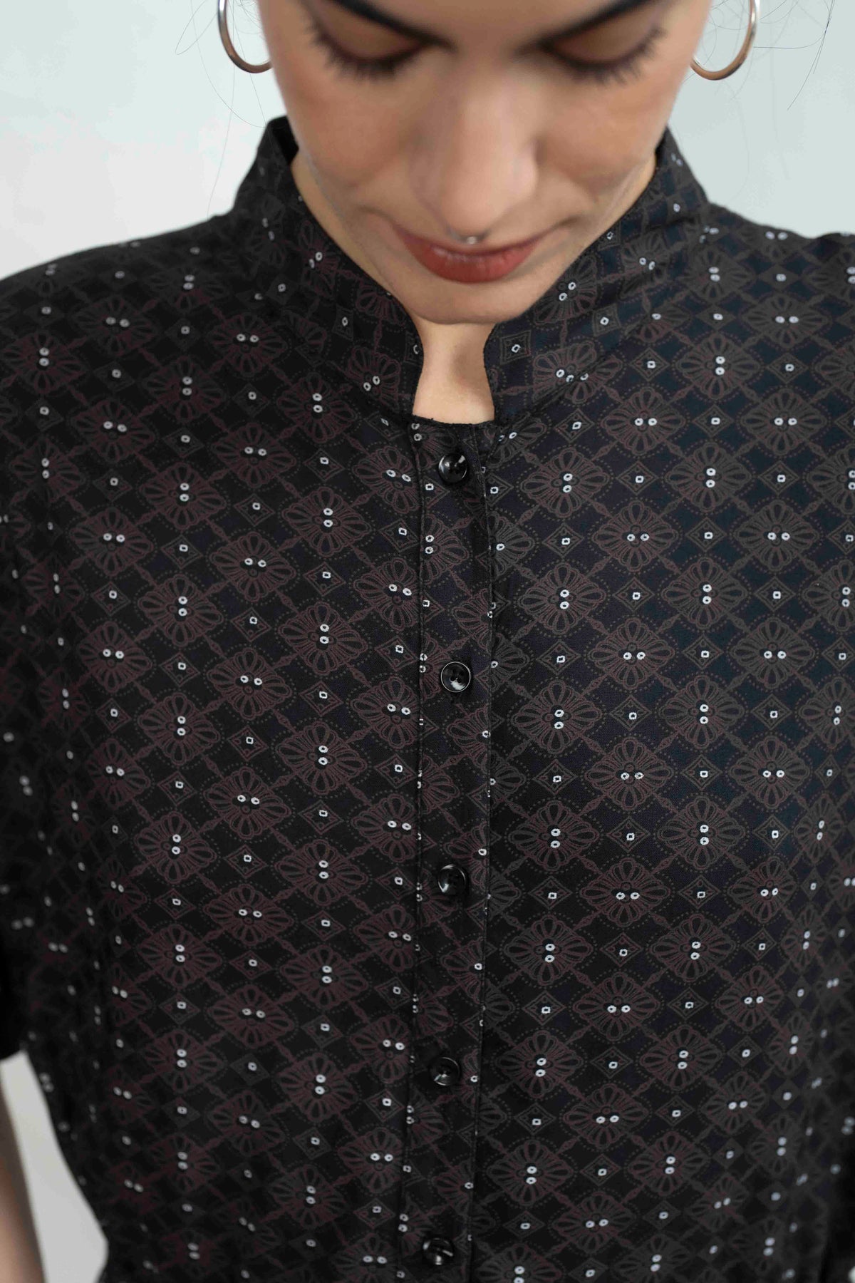 אוברול גל כשאור דולק בחלונך מעוטר צורות גאומטריות ובעל צבעוניות חומה כהה וחמה.