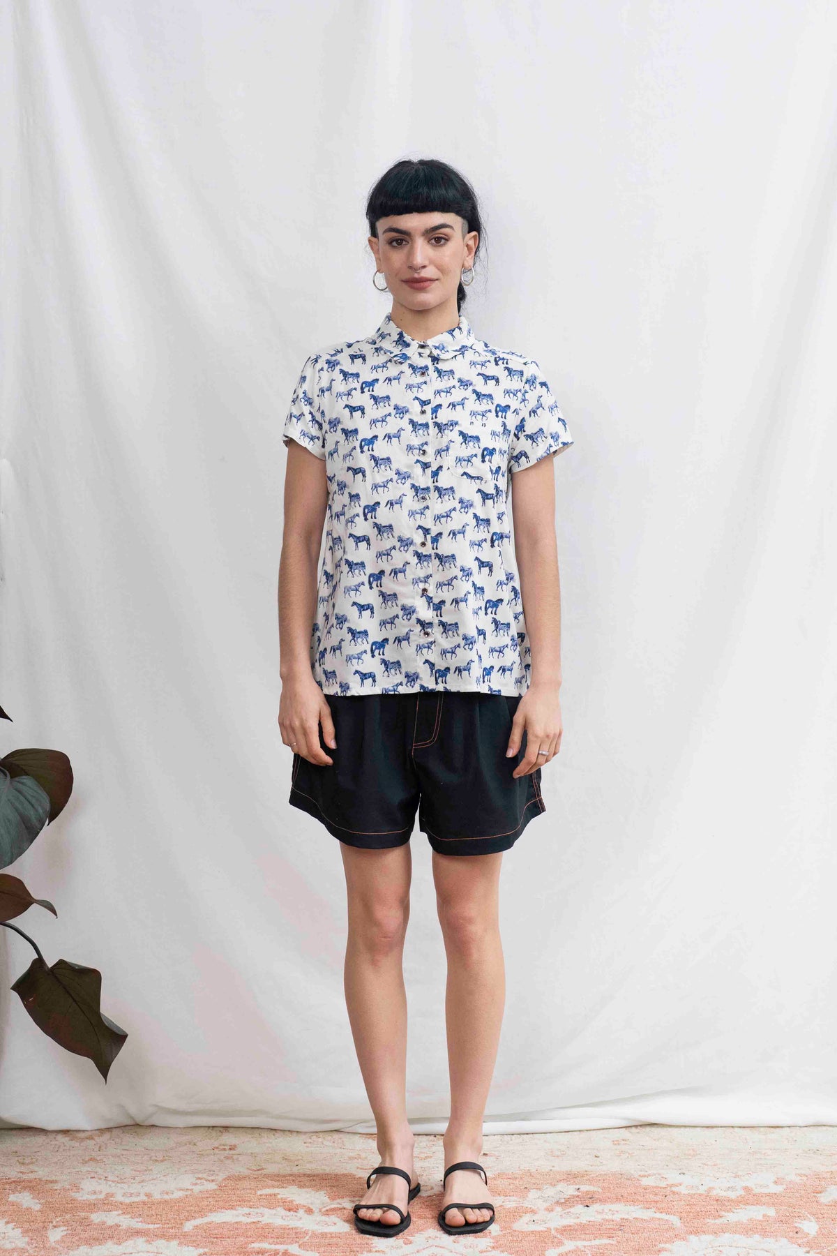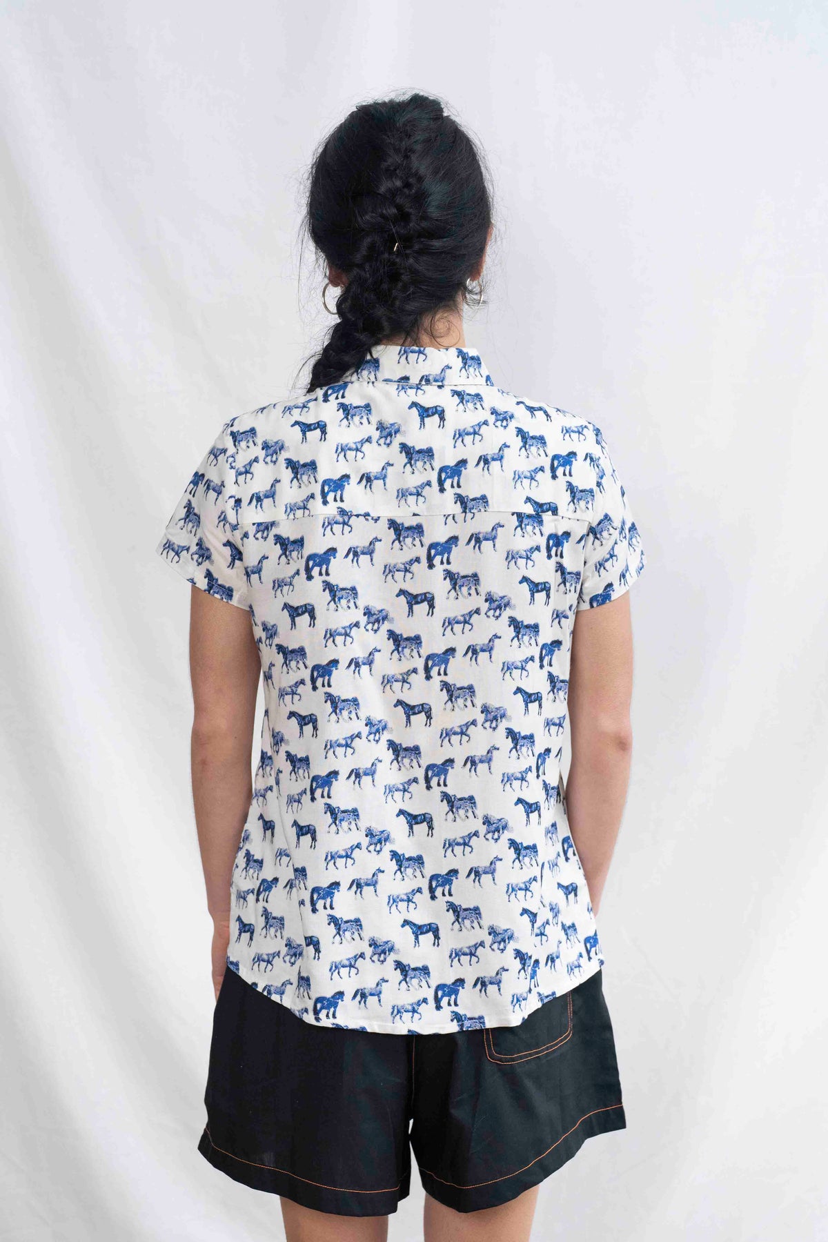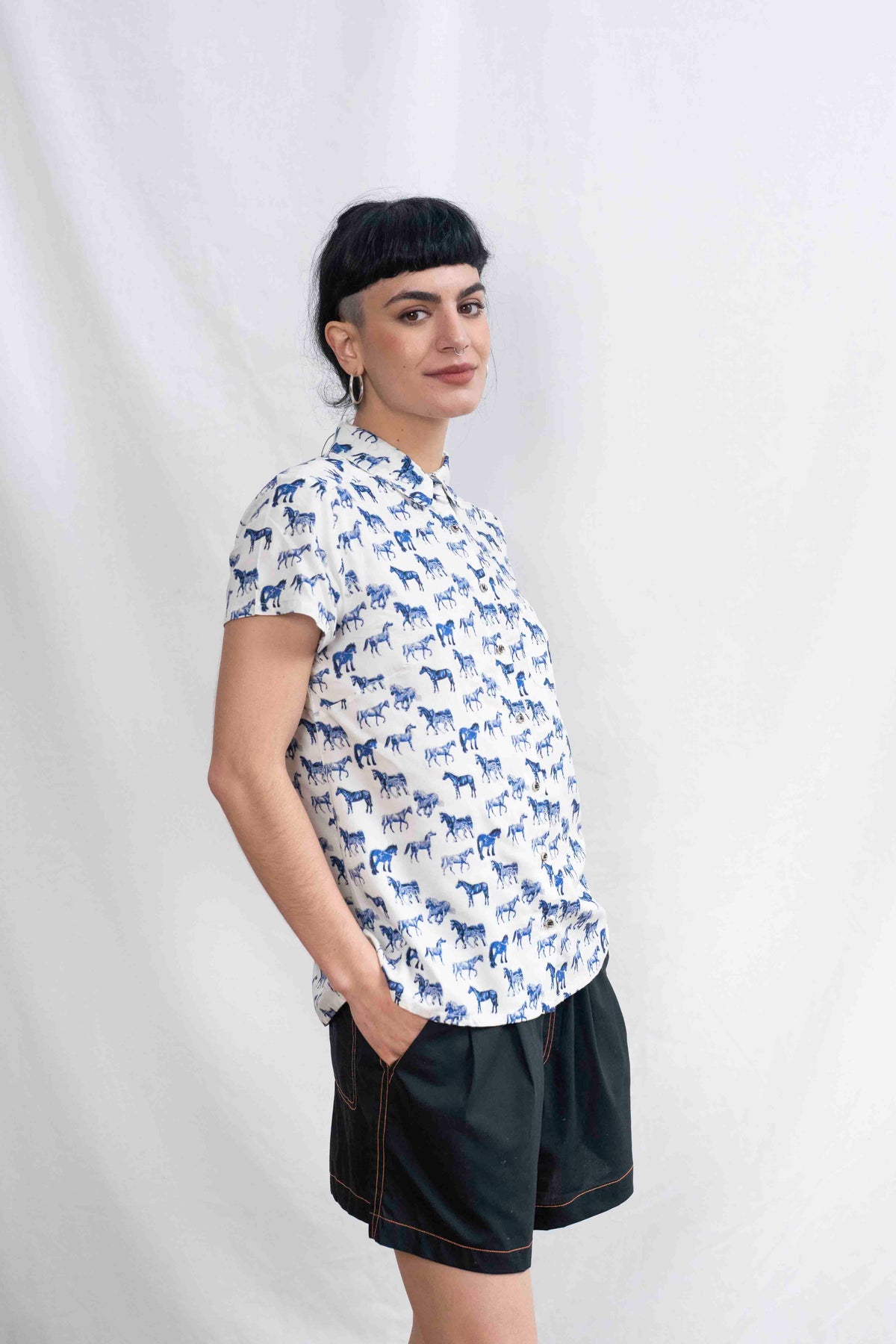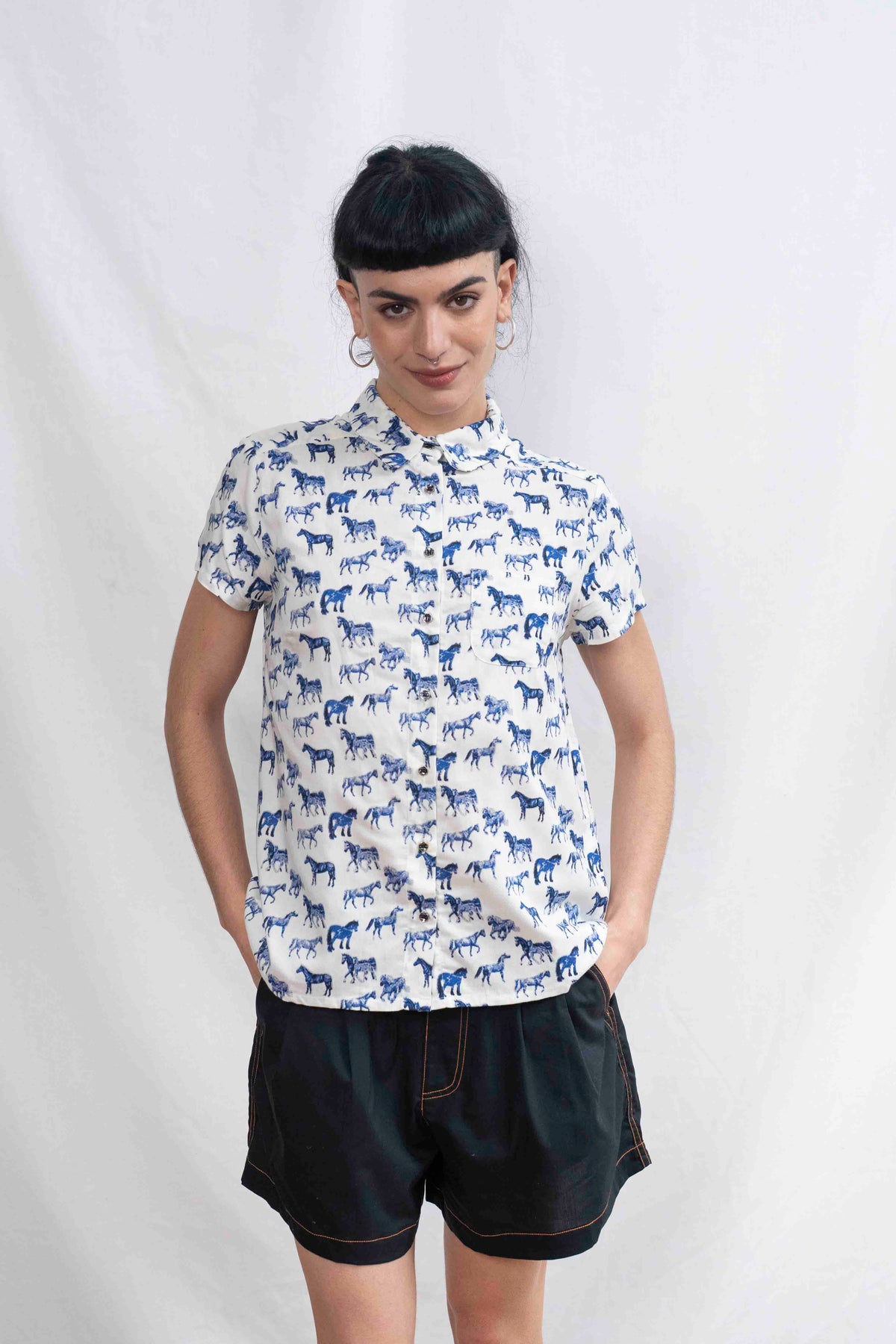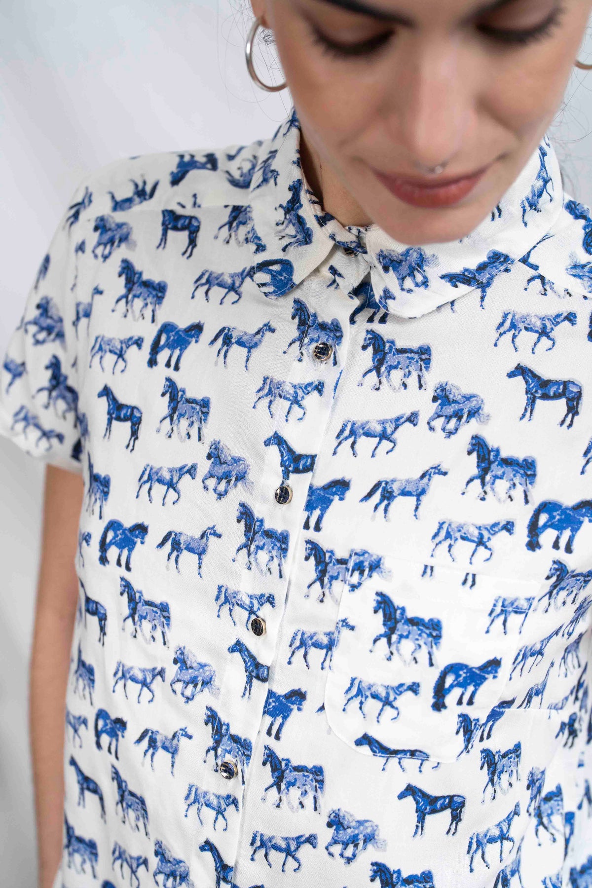 חולצת דריה סוסים שנראים כאילו צוירו במכחול בתקופה הכחולה, חולצה על זמנית ואדירה.