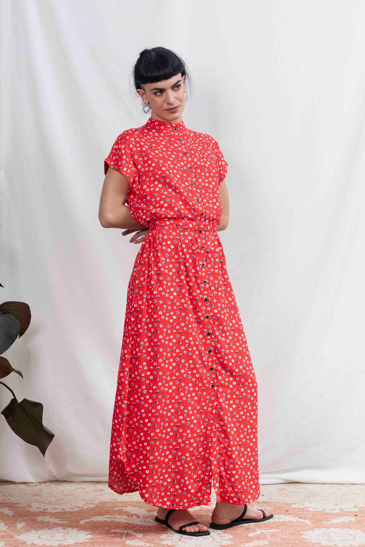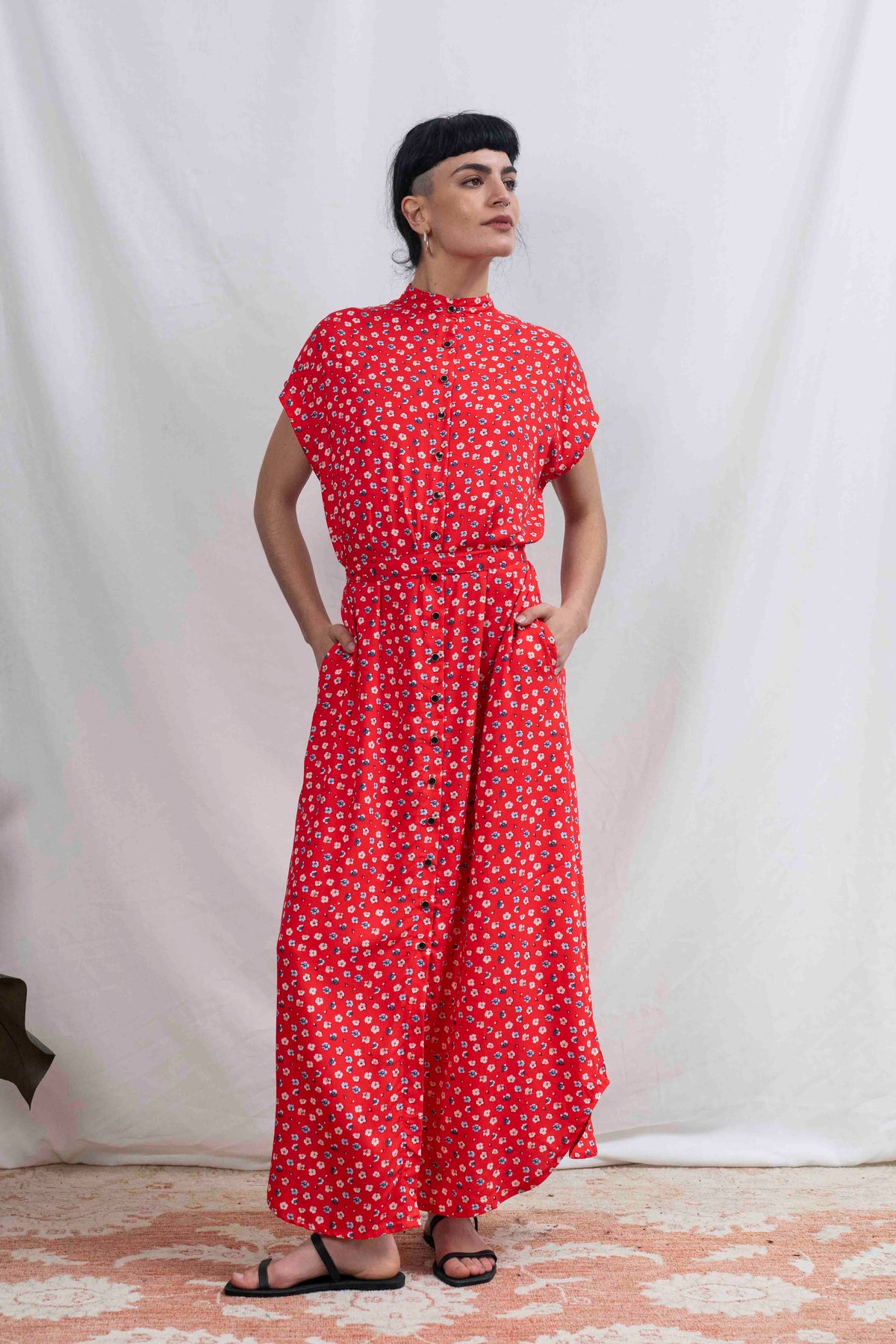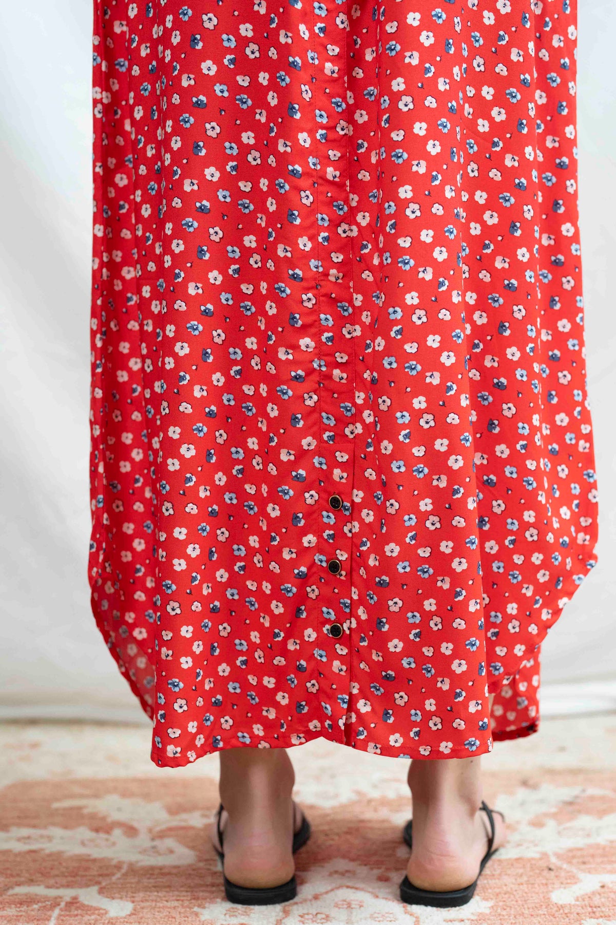 שמלת מקסי אוברסייז לוהטת במיוחד בעלת גוון אדום בוהק שאי אפשר לפספס, מעוטרת בפרחים קטנים בלבן ובצבע דנים כחול, שמלה שתגרוף את כל המחמאות.