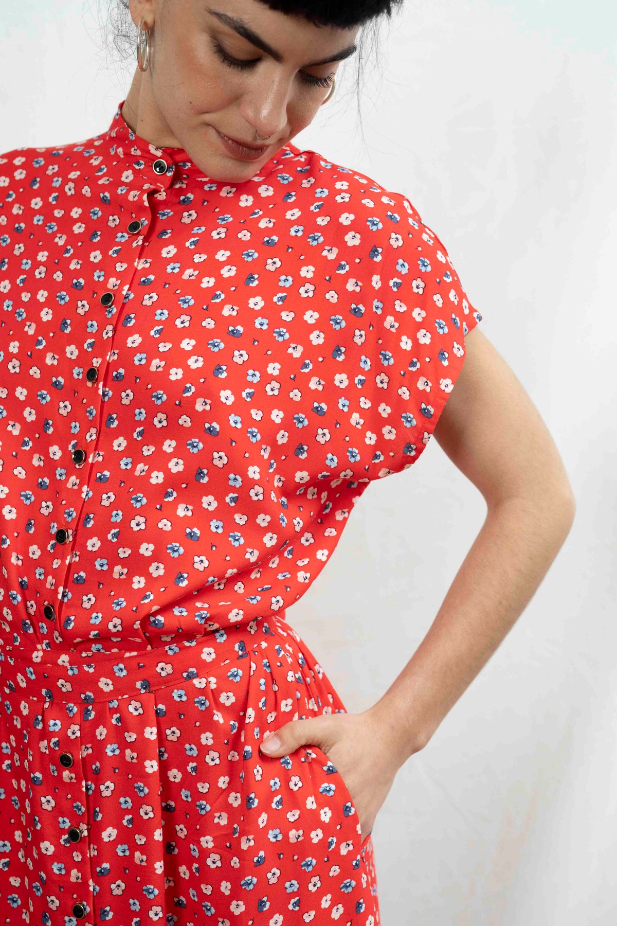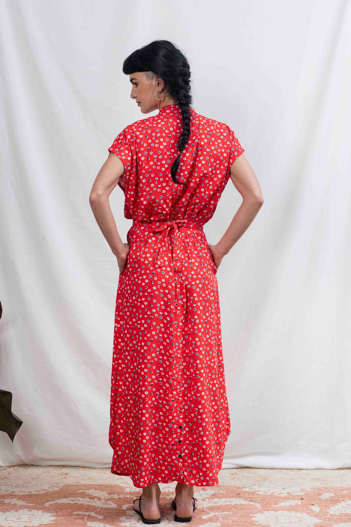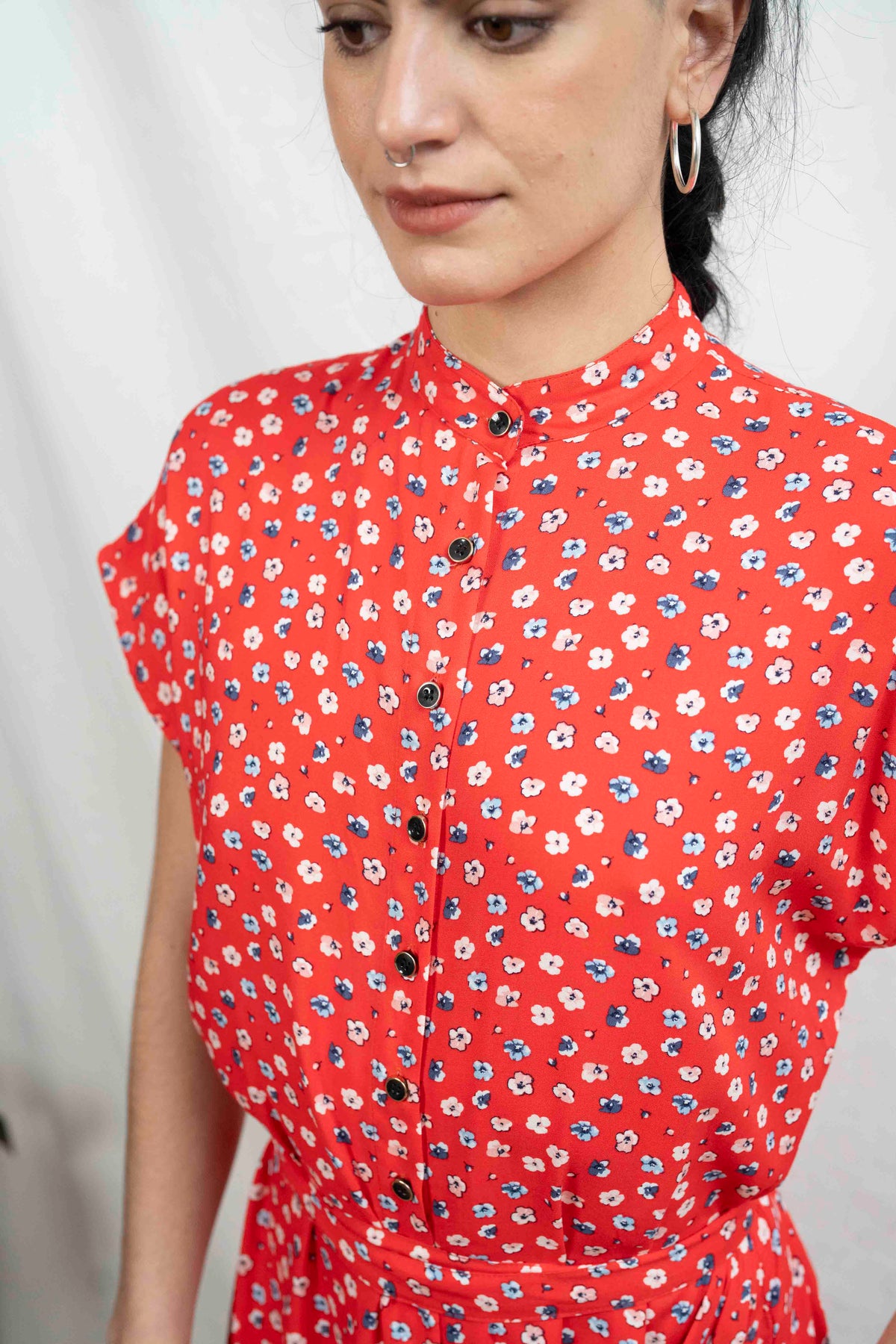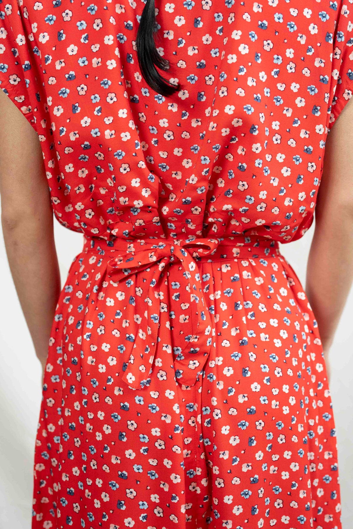 שמלת מקסי אוברסייז לוהטת במיוחד בעלת גוון אדום בוהק שאי אפשר לפספס, מעוטרת בפרחים קטנים בלבן ובצבע דנים כחול, שמלה שתגרוף את כל המחמאות.