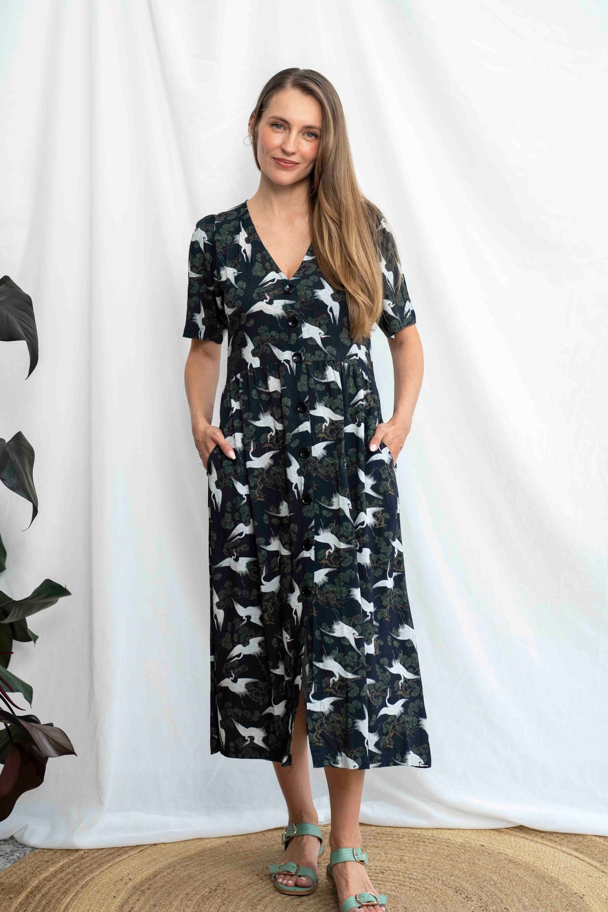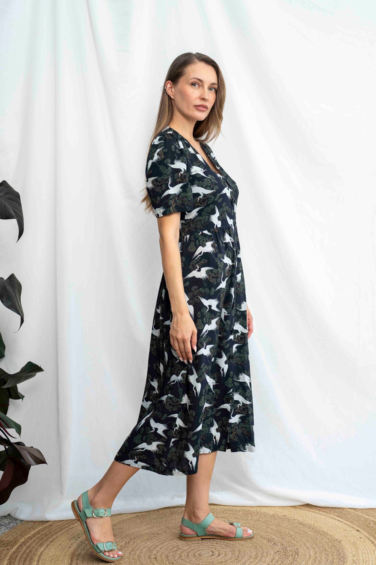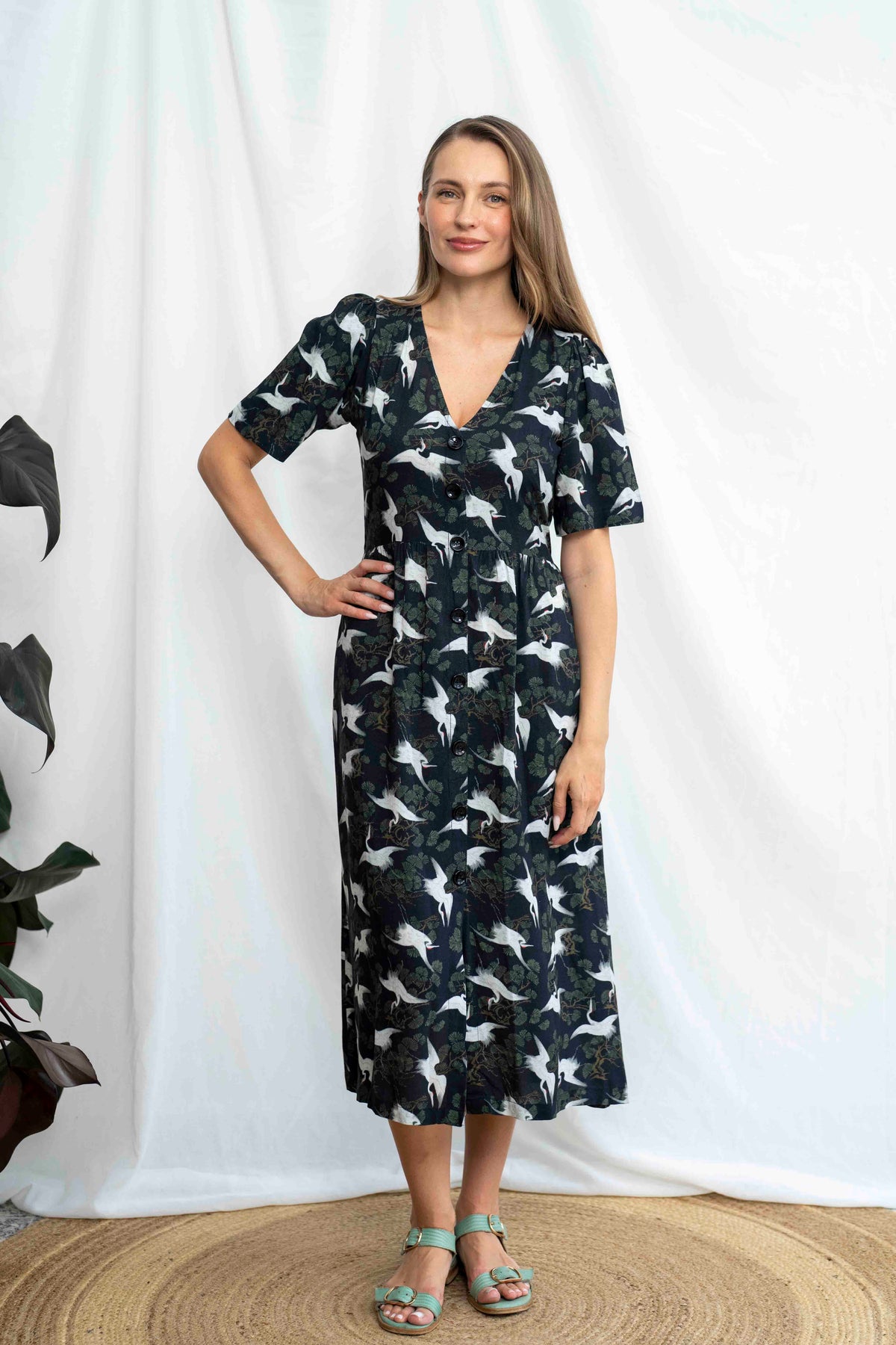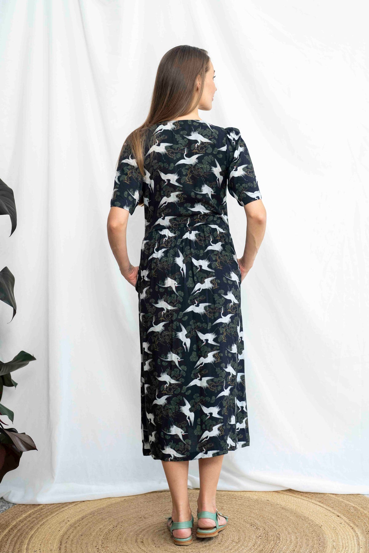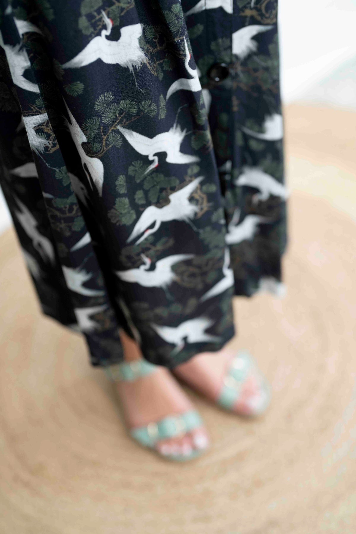 שמלת יולי שרוול עגורים יפן לוקחת אותך למחוזות רחוקים עם הדפס מרהיב של עגורים לבנים מרחפים על רקע כהה ועמוק, המעוטר בצמחייה עדינה בהשראת איורי יפן מסורתיים. שילוב הצבעים הדרמטי-שקט יוצק לתוך השמלה תחושת רוגע, עידון ואסתטיקה אמנותית, והבד הקליל והנושם מרגיש טבעי ונעים על הגוף – מושלם לעונה.