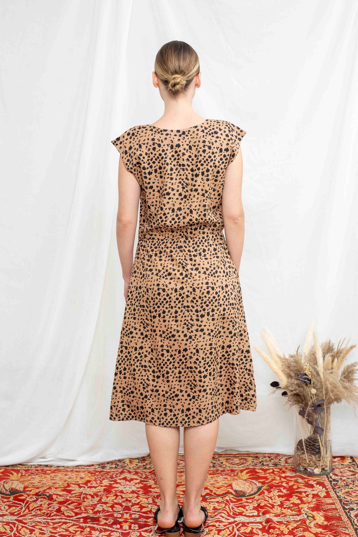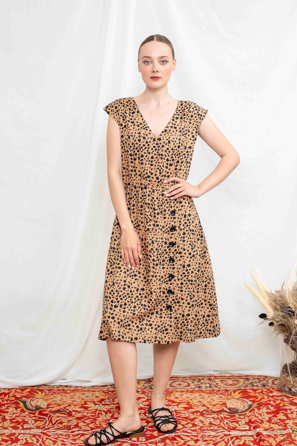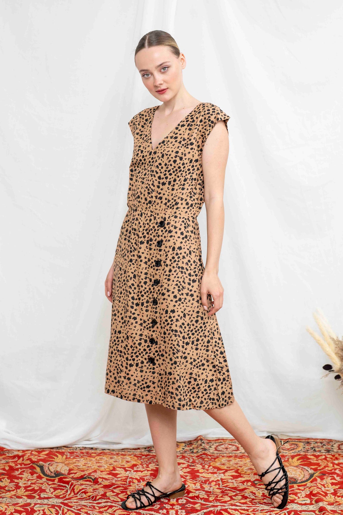 שמלת אווה ללא שרוולים. שמלה באורך מידי, מעוצבת בגזרת A סופר מחמיאה ונשית, בעלת מפתח V, כפתורים גדולים בצד החצאית, קו מותניים אלסטי, וכמובן, זוג כיסים צדיים. שמלה קלאסית בסגנון רטרו, הכי קלילה ורומנטית, פשוט וואן-פיס מושלם שיסדר לך את הלוק.