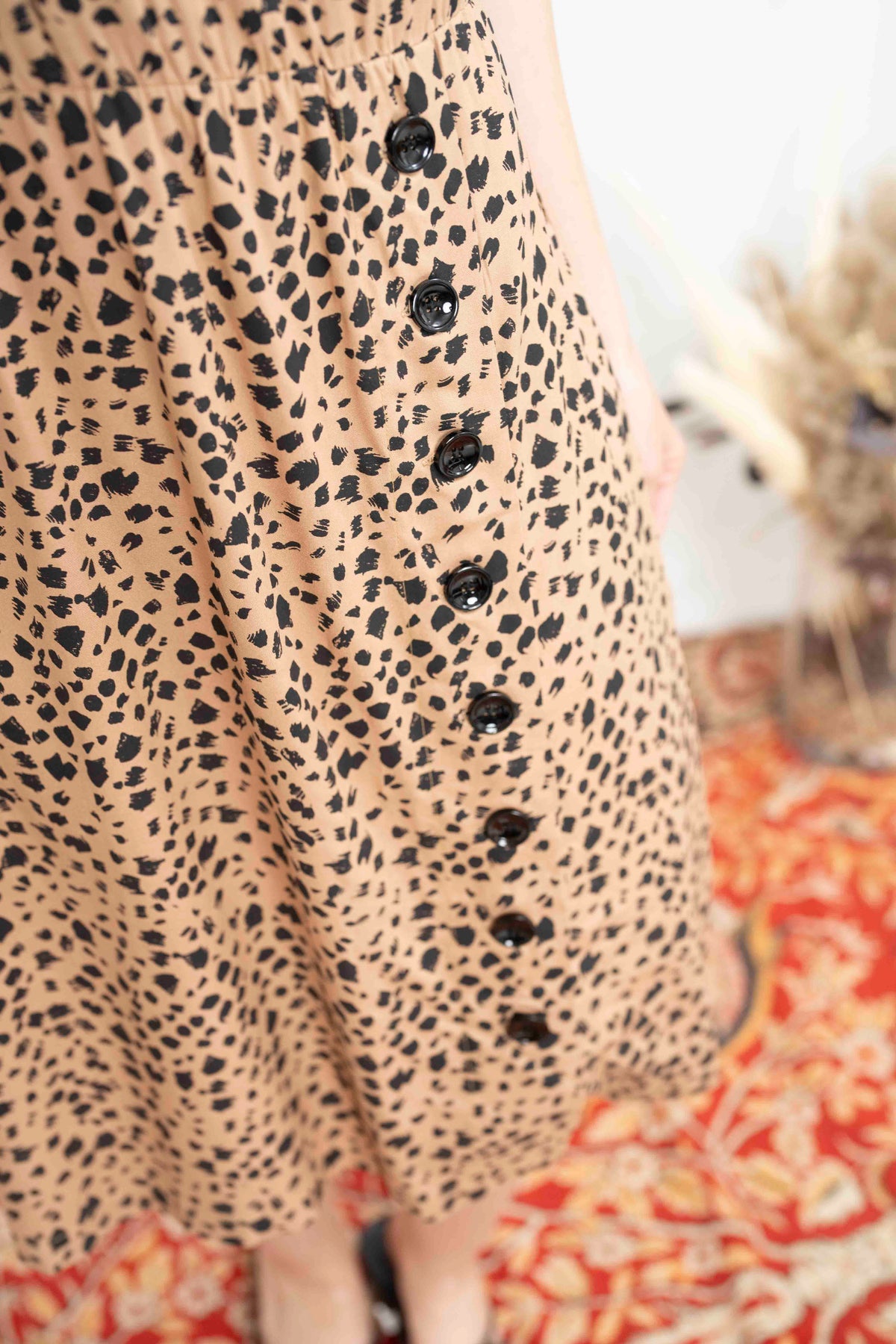 שדרגי את היומיום שלך עם שמלת אווה חברבורות, המקושטת בדוגמה חייתית מופשטת, בגוון ורוד עתיק,