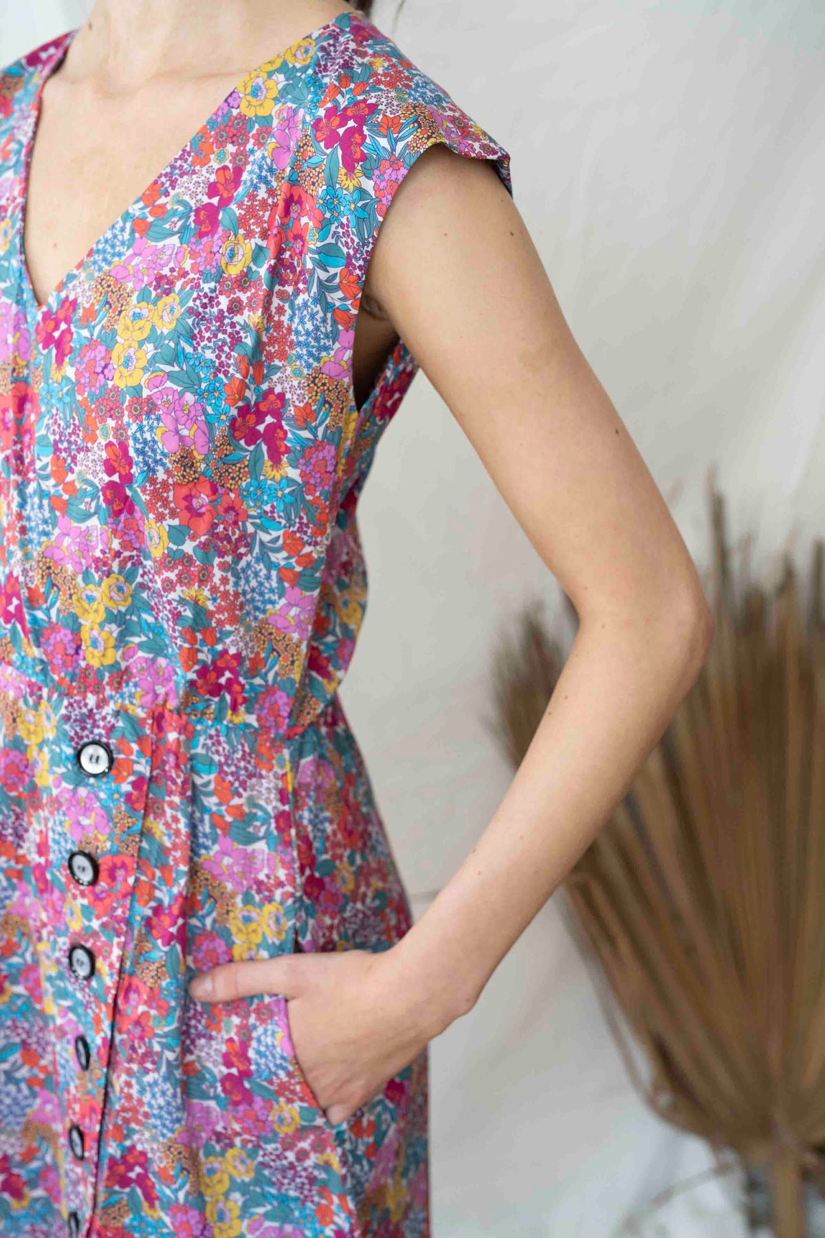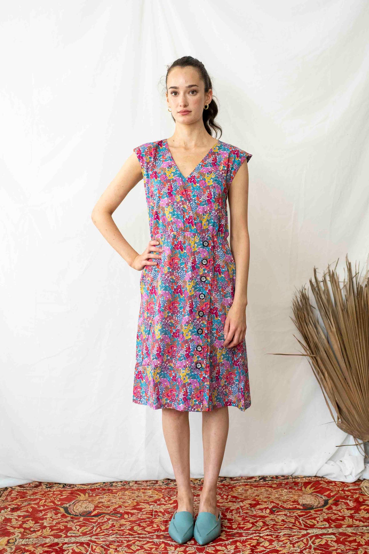 שמלת אווה ללא שרוולים. שמלה באורך מידי, מעוצבת בגזרת A סופר מחמיאה ונשית, בעלת מפתח V, כפתורים גדולים בצד החצאית, קו מותניים אלסטי, וכמובן, זוג כיסים צדיים. שמלה קלאסית בסגנון רטרו, הכי קלילה ורומנטית, פשוט וואן-פיס מושלם שיסדר לך את הלוק.