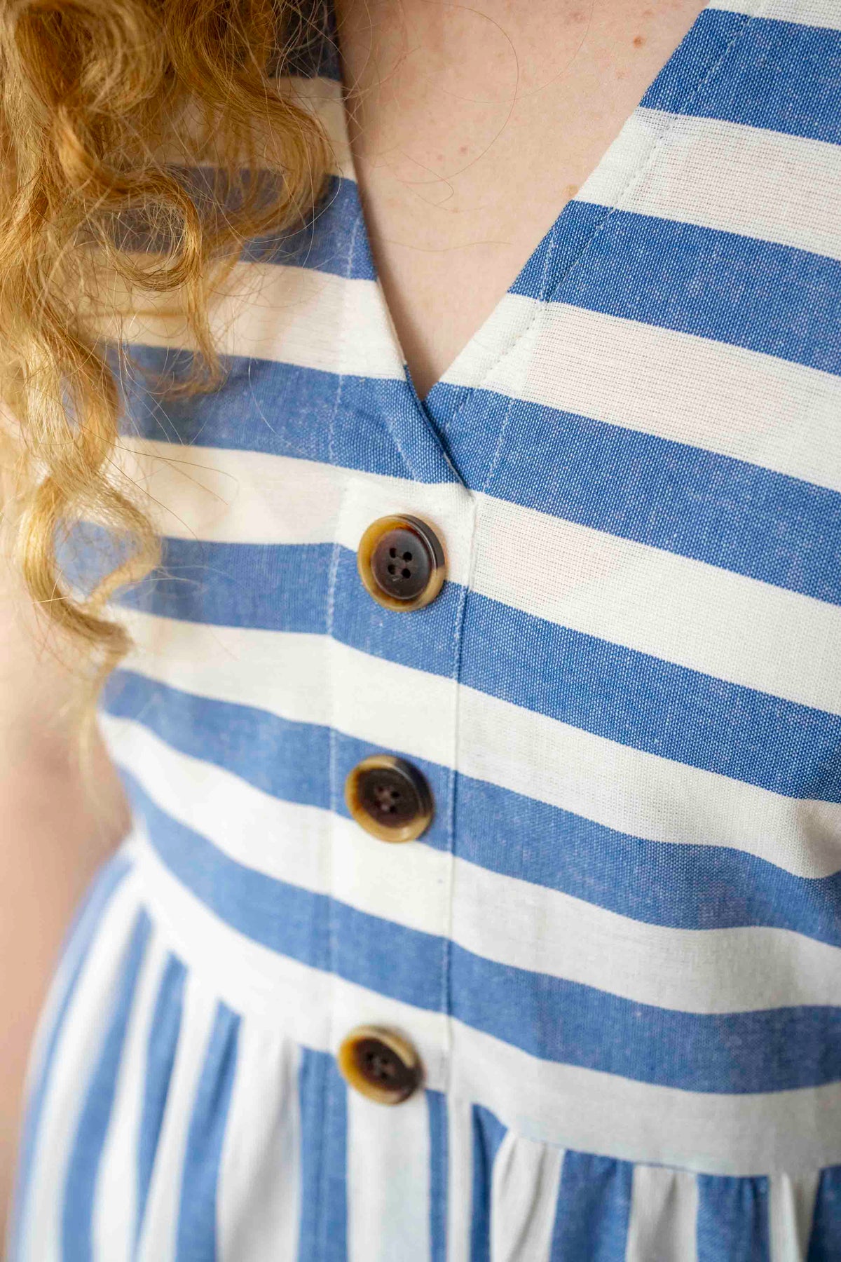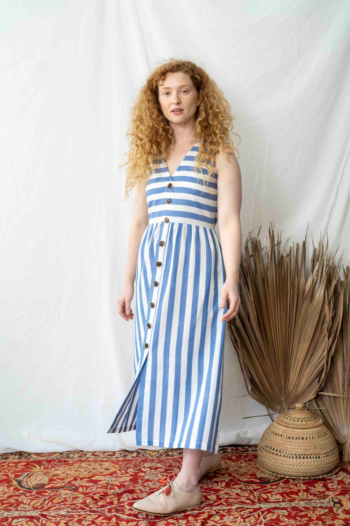 שמלת יולי פסים תחלת בעלת מוטיב קלאסי ובגווני קיץ של תכלת ולבן. שמלת יולי היא הפתרון האידיאלי ליום קליל ונעים, מעניקה נוחות מירבית ומראה מהמם בכל אירוע. השמלה באורך מידי, ללא שרוולים ועם מפתח וי מושלם. הכפתורים הדקורטיביים לכל אורך השמלה מעניקים ביטחון וסטייל, ויש לה זוג הכיסים הצידיים מוסיפים פרקטיות. הגומי בגב מאפשר נוחות מרבית ומדגיש את המותן בצורה מחמיאה.