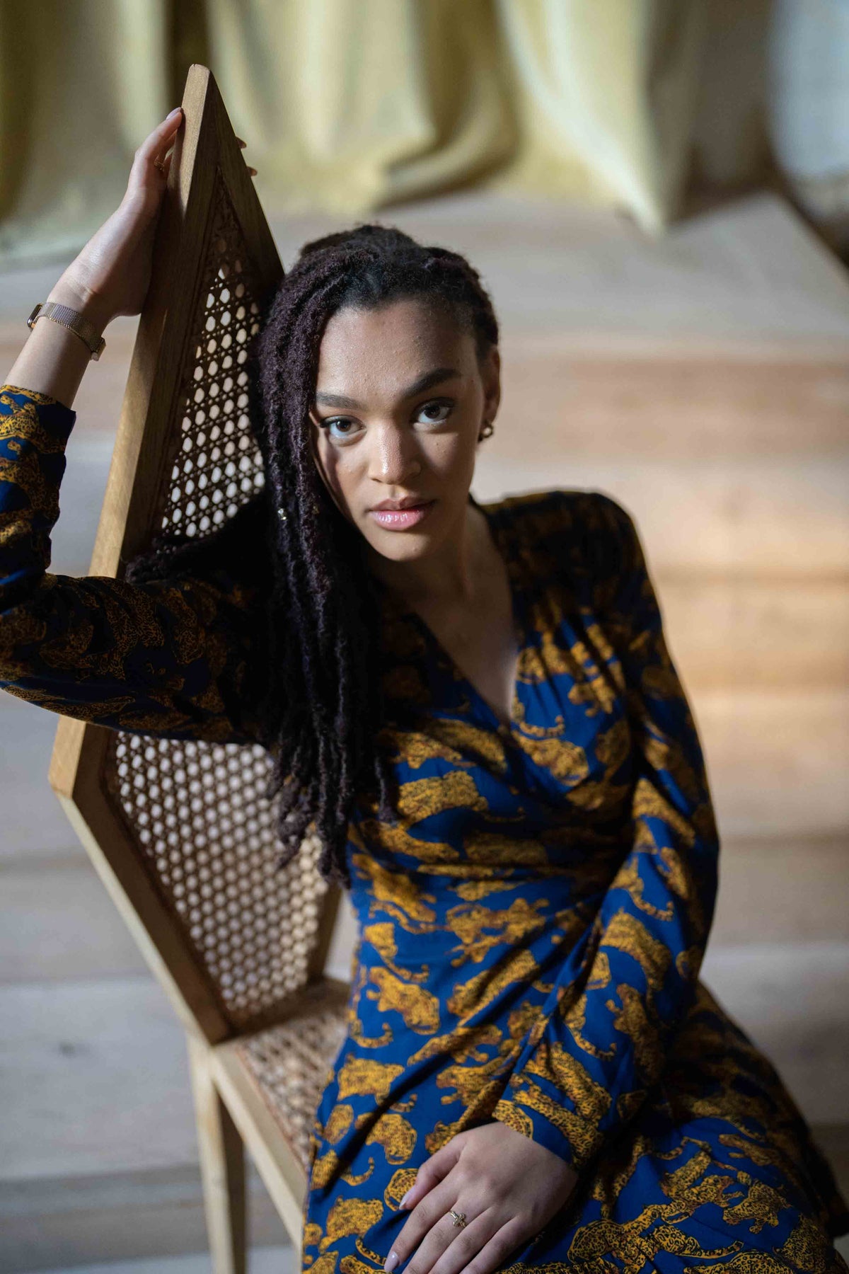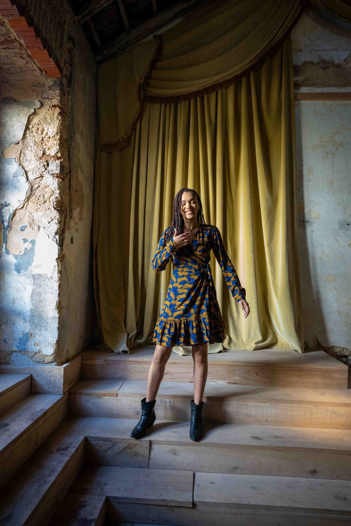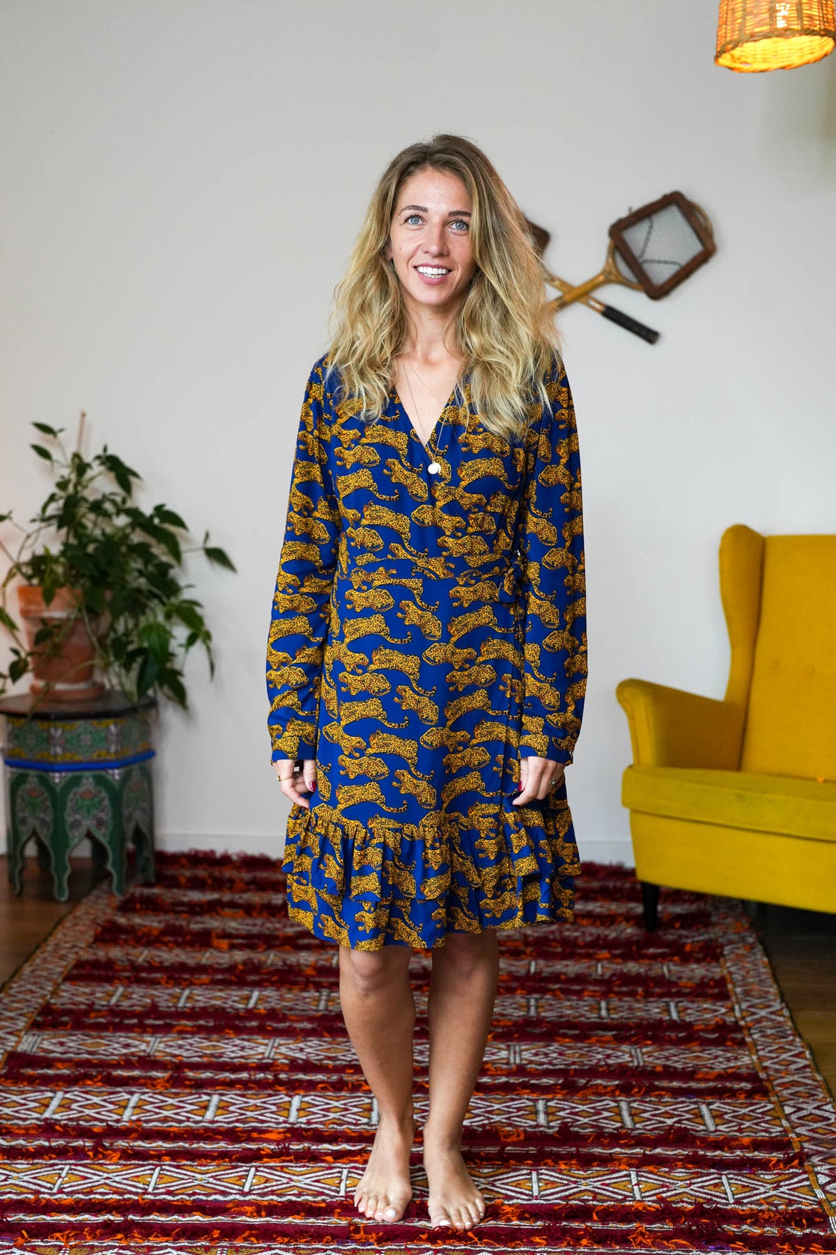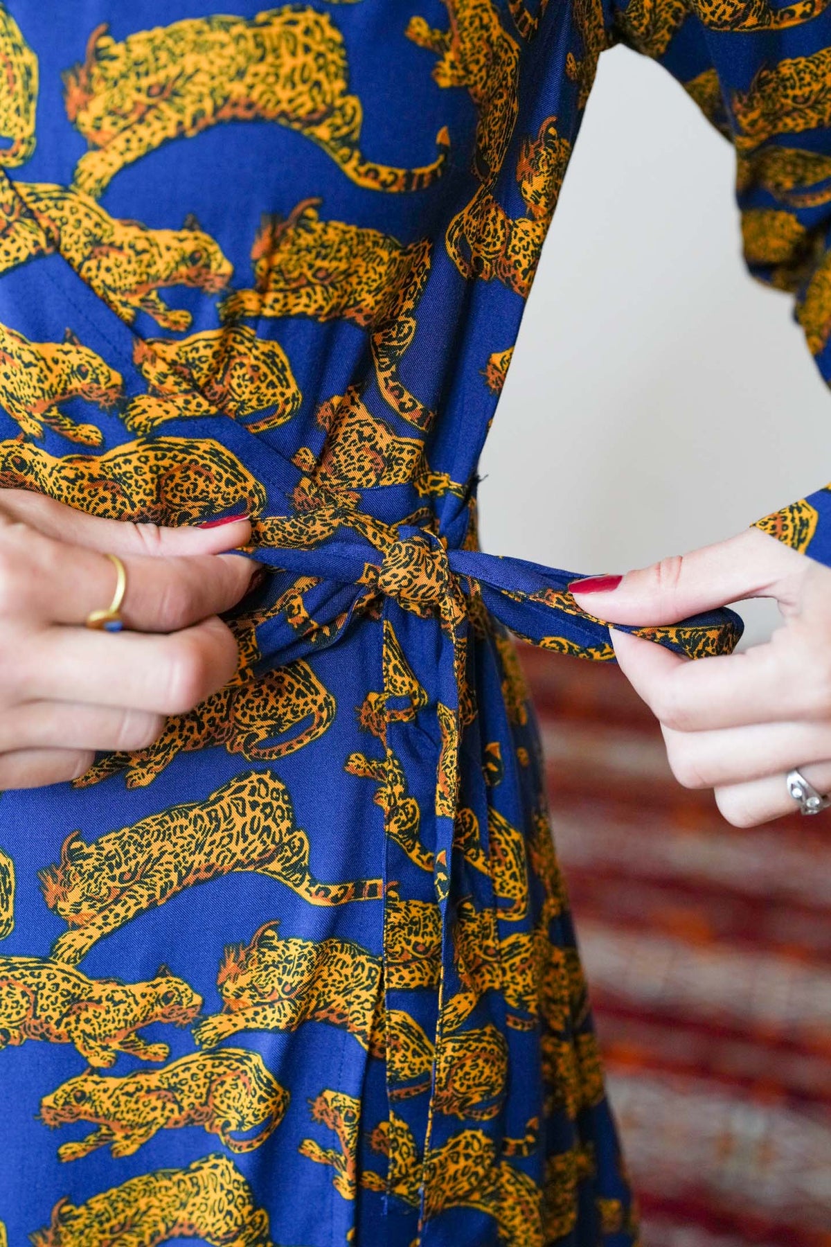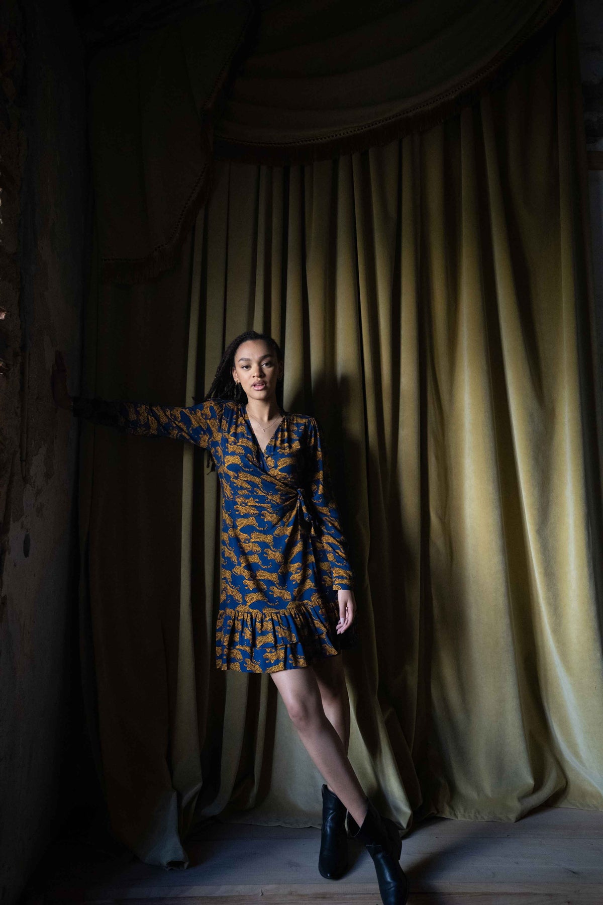 שמלת אלכס ברדלס פראי בעלת מוטיב ממשפחת החתולים, שמלת אלכס הנפלאה, בגיזרת מעטפת מחמיאה, בעלת שרוך פנימי ששולט בהידוק השמלהש לגופך, זוג כיסים צידיים וסיומת קסומה.