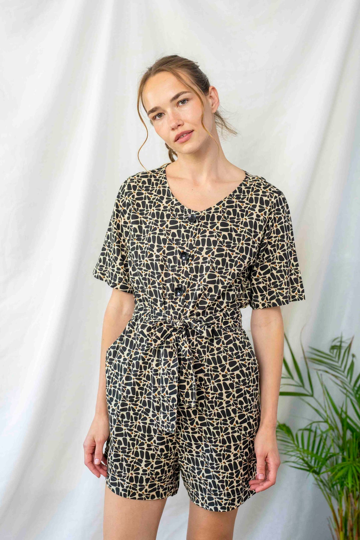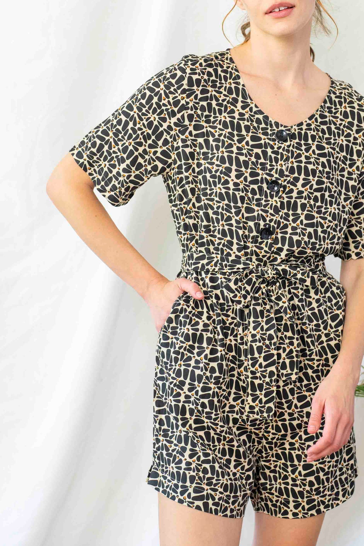 האוברול בגיזרה ישרה, עם שרוולים קצרים וכמובן זוג כיסי צד וכיס אחורי אחד, הוא בעל צווארון מעוגל ומגיע עם חגורה שניתן להוסיף להדגשת המותן.
