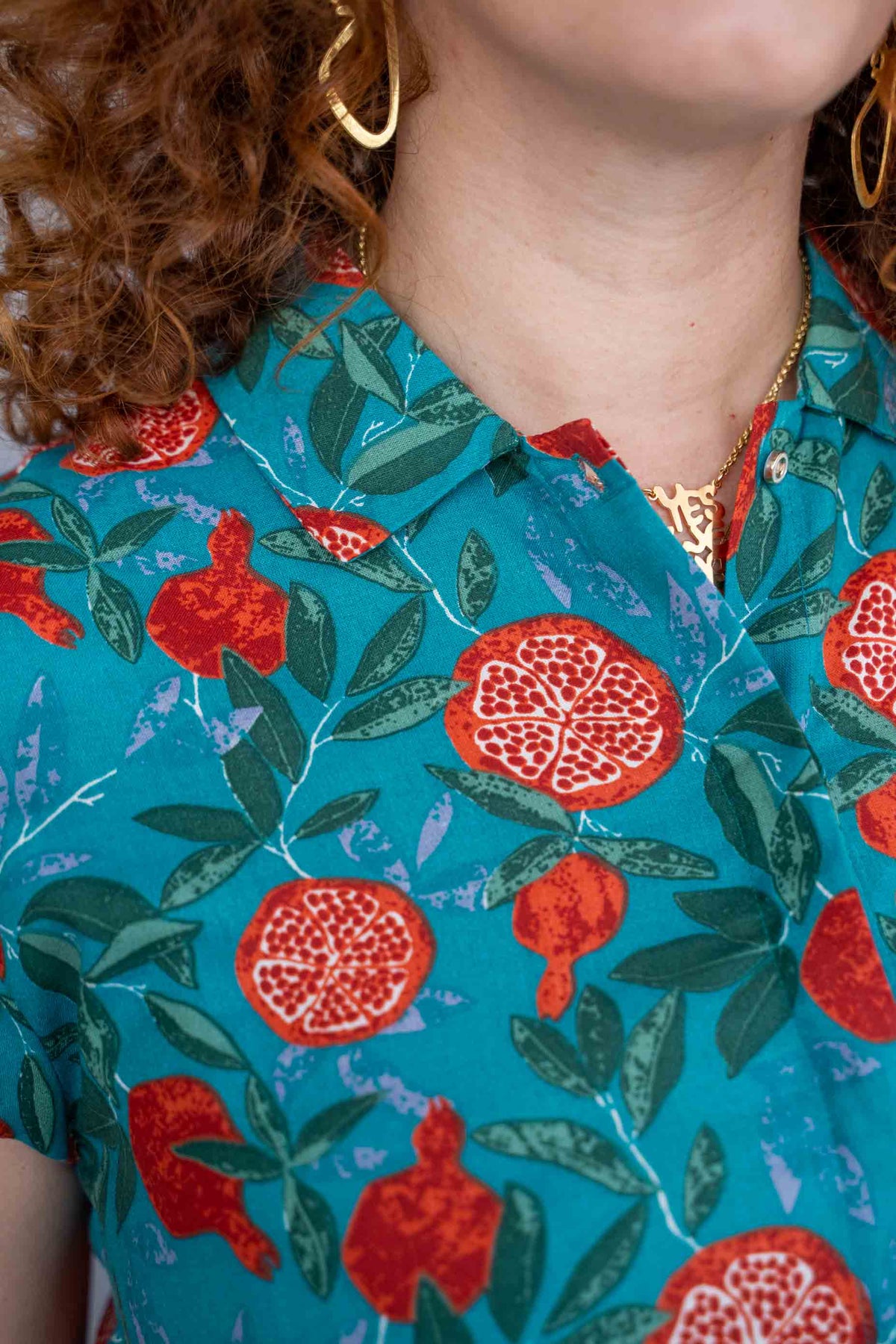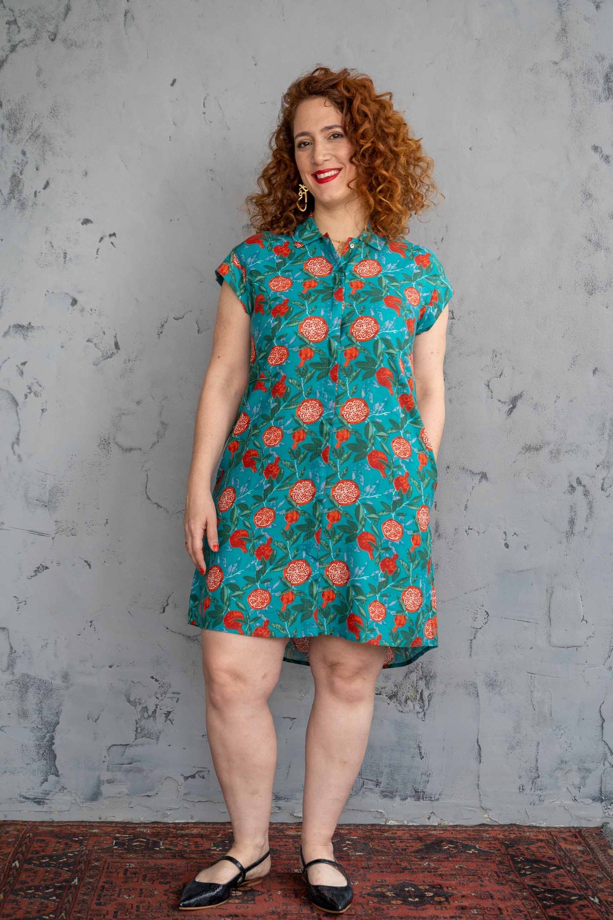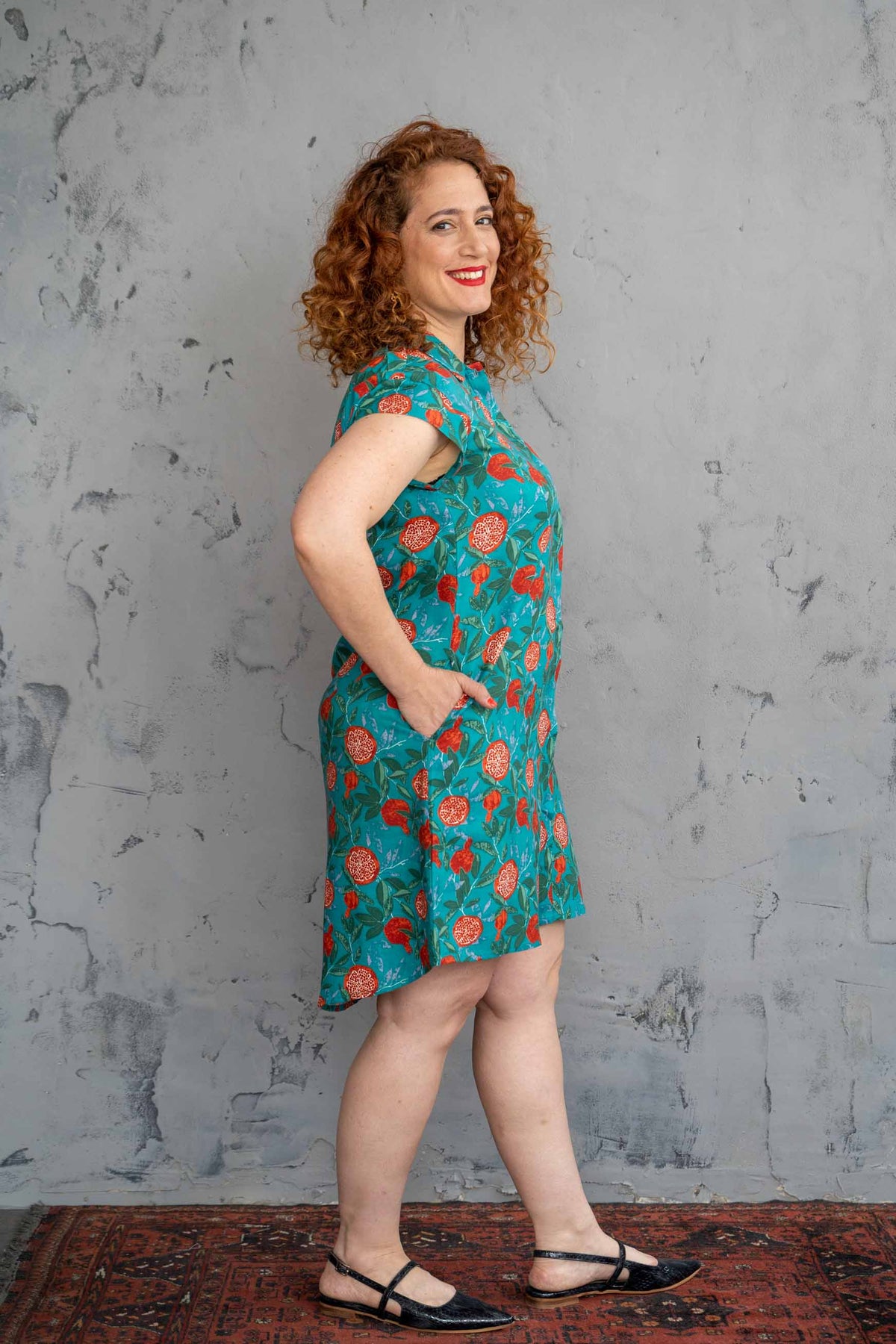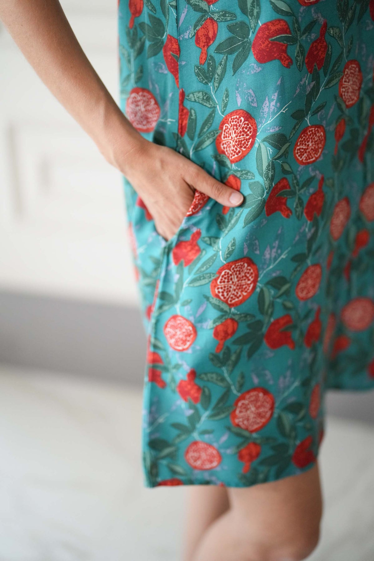 שמלת טוקיו רימון מוסיף המון מעוטרת ברימונים גדולים, פרחים ועלים, אחת השמלות הכי ארצישראליות. שמלה בגיזרת A רחבה מהגוף, מלטפת ומחמיאה, שמלת טוקיו באורך מיני מעל הברך, בעלת צווארון עדין ומכופתרת לכל אורכה, יש לה זוג כיסים צידיים ואורך אי סימטרי, זו הסיבה שהיא הכי חרישה ליומיום, לפגישה או לבילוי עם חברה.
