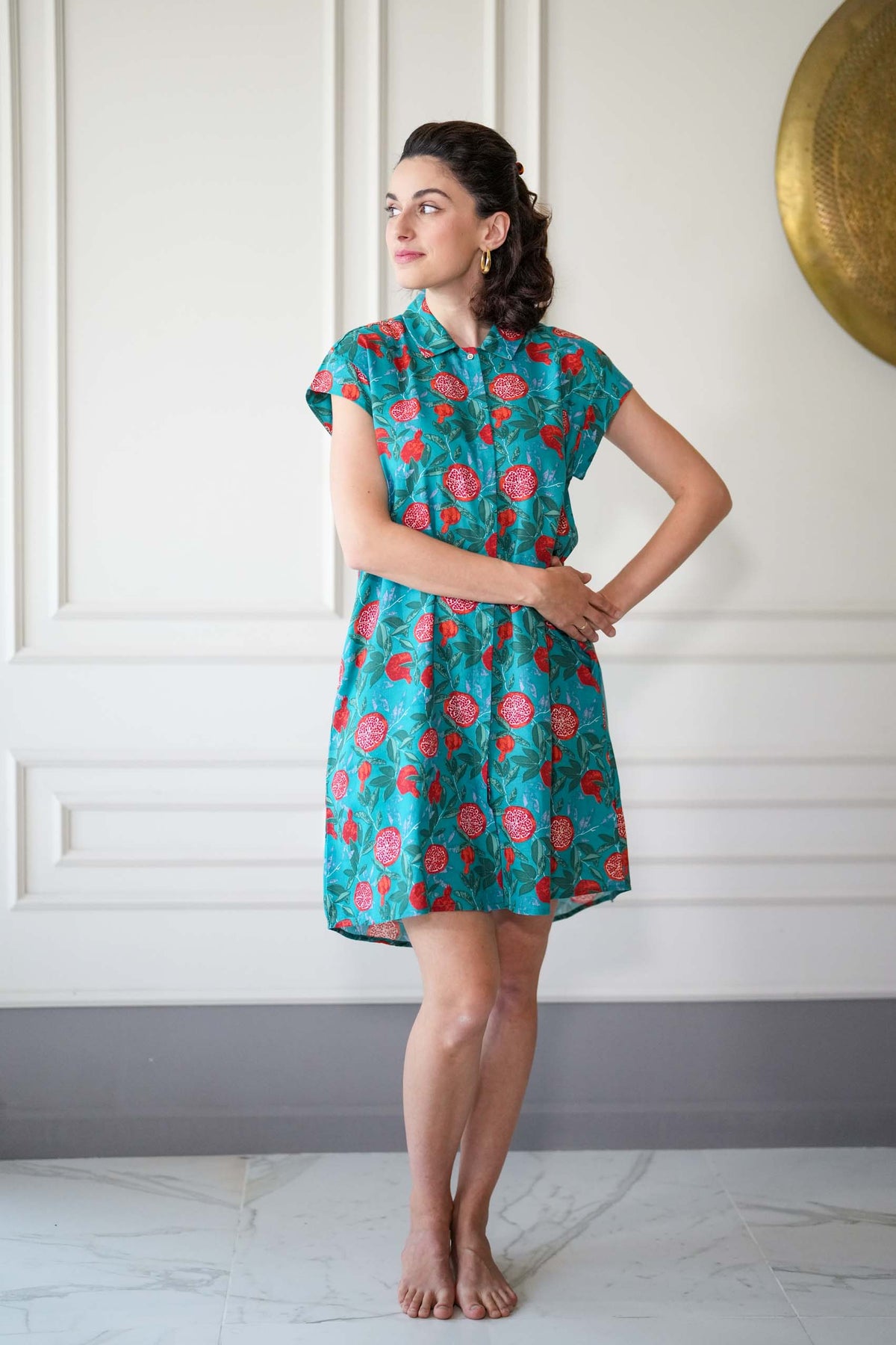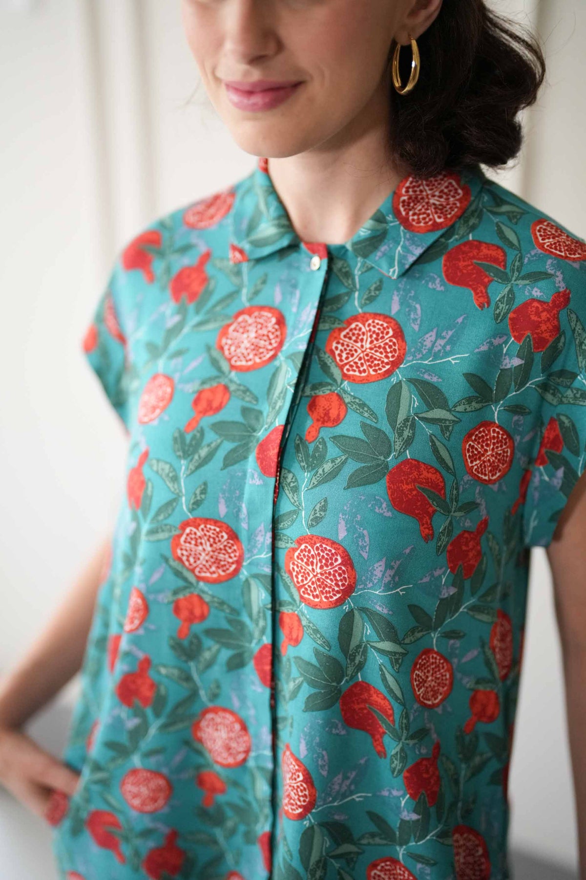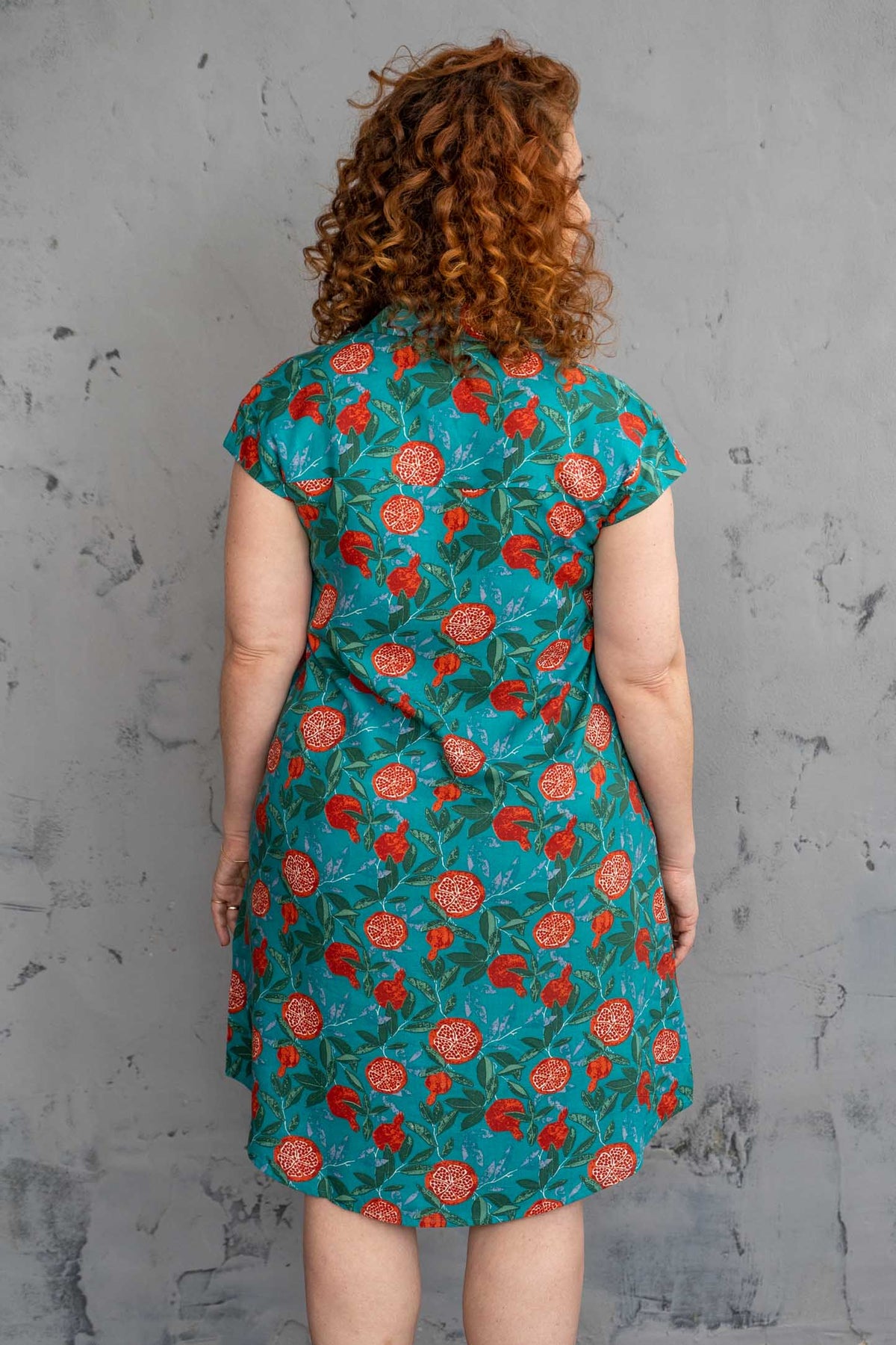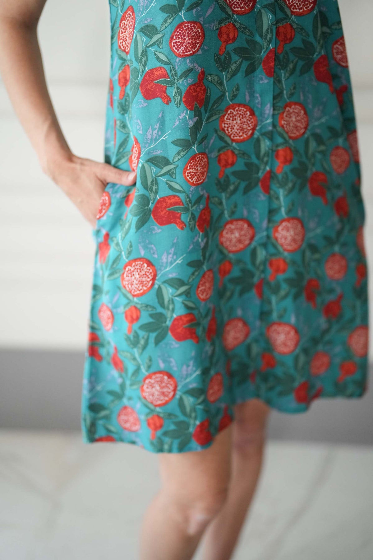 שמלת טוקיו רימון מוסיף המון מעוטרת ברימונים גדולים, פרחים ועלים, אחת השמלות הכי ארצישראליות. שמלה בגיזרת A רחבה מהגוף, מלטפת ומחמיאה, שמלת טוקיו באורך מיני מעל הברך, בעלת צווארון עדין ומכופתרת לכל אורכה, יש לה זוג כיסים צידיים ואורך אי סימטרי, זו הסיבה שהיא הכי חרישה ליומיום, לפגישה או לבילוי עם חברה.
