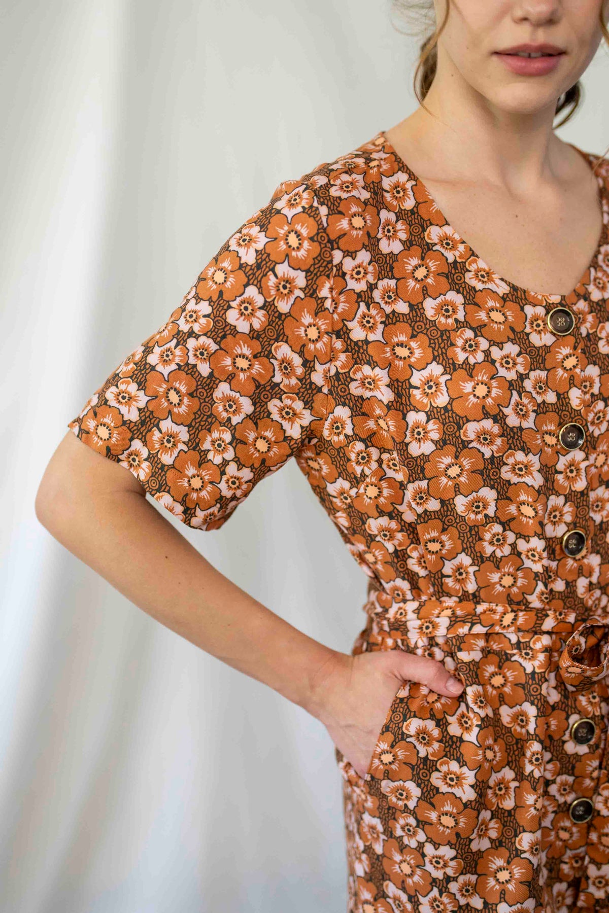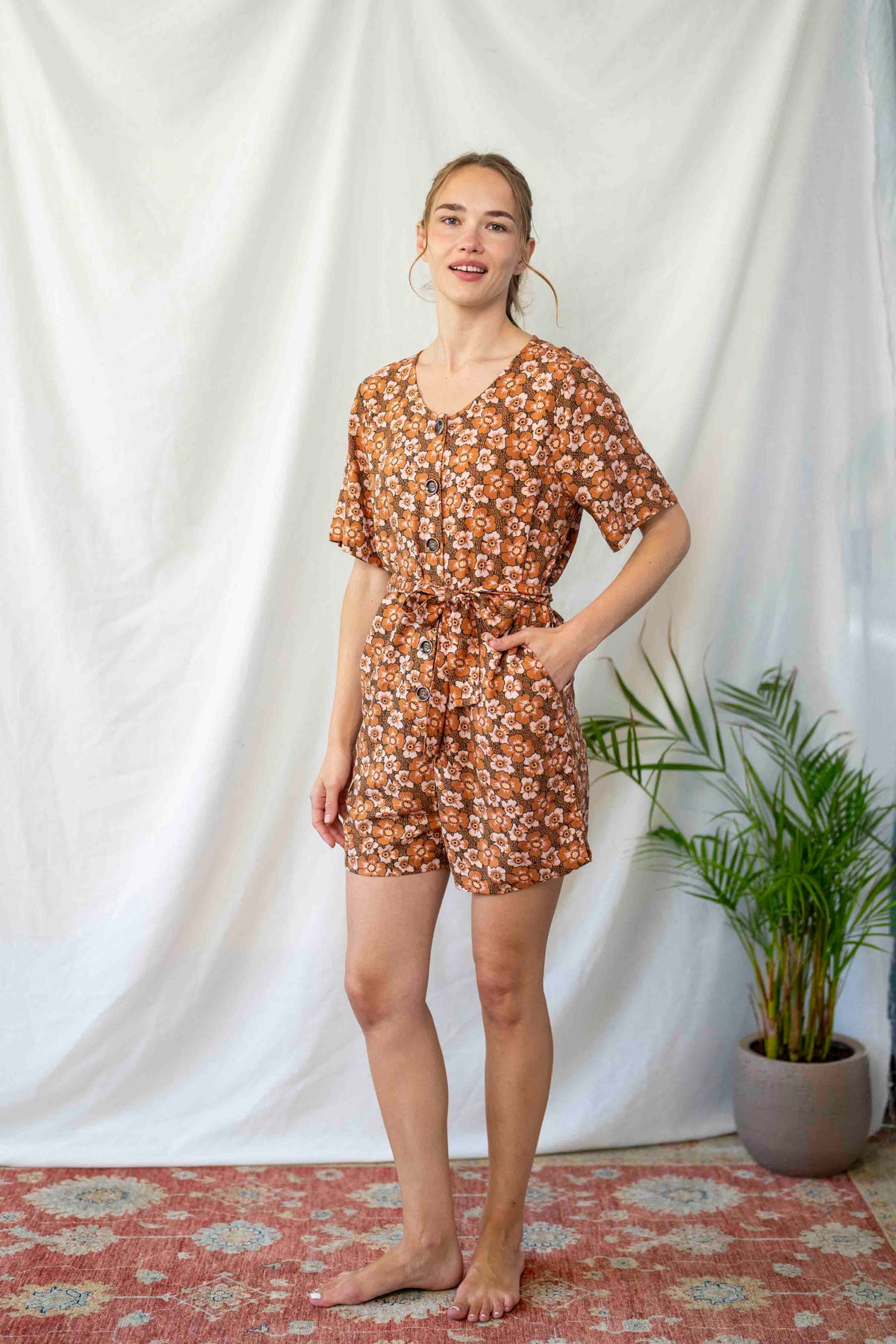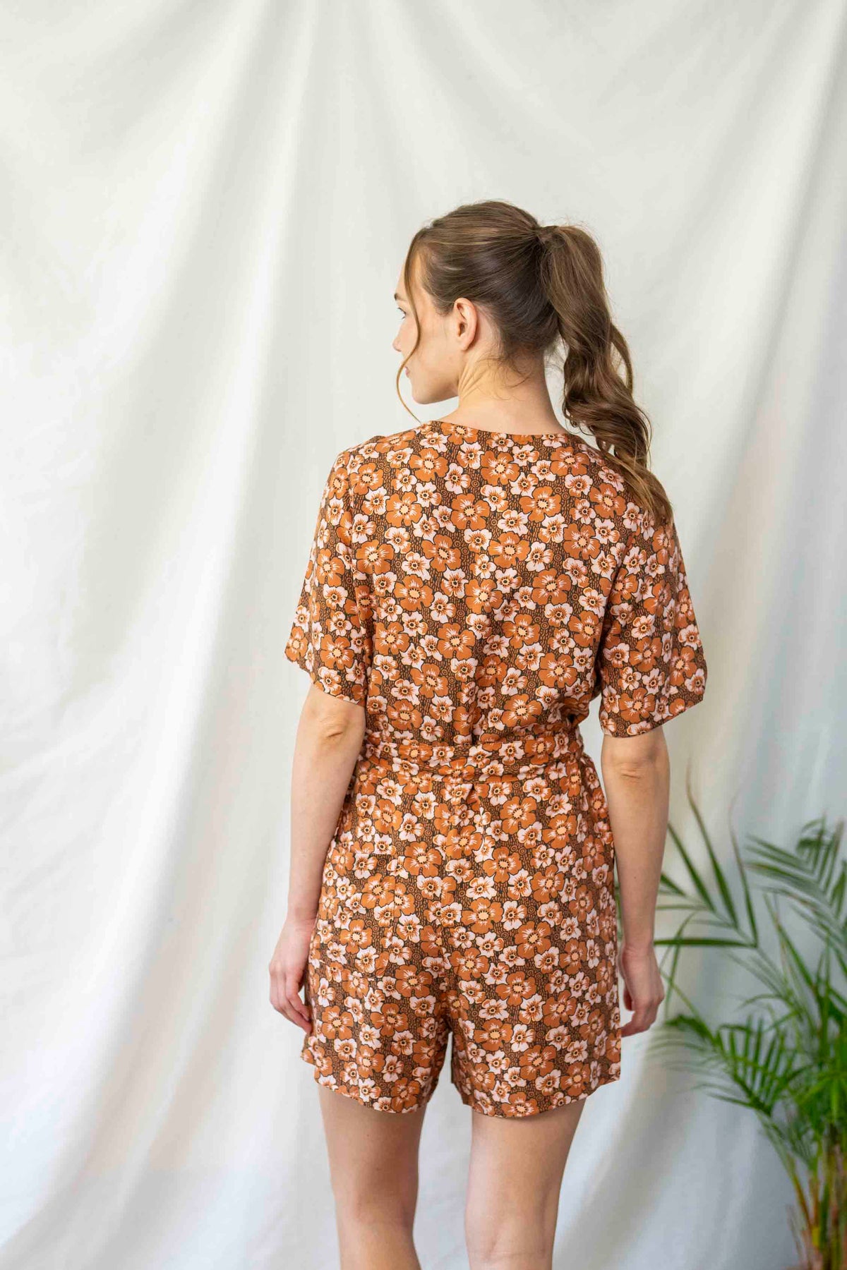 אוברול יסמין הנפלא בגוונים של חום מעוטר בפרחים בסגנון רטרו.
