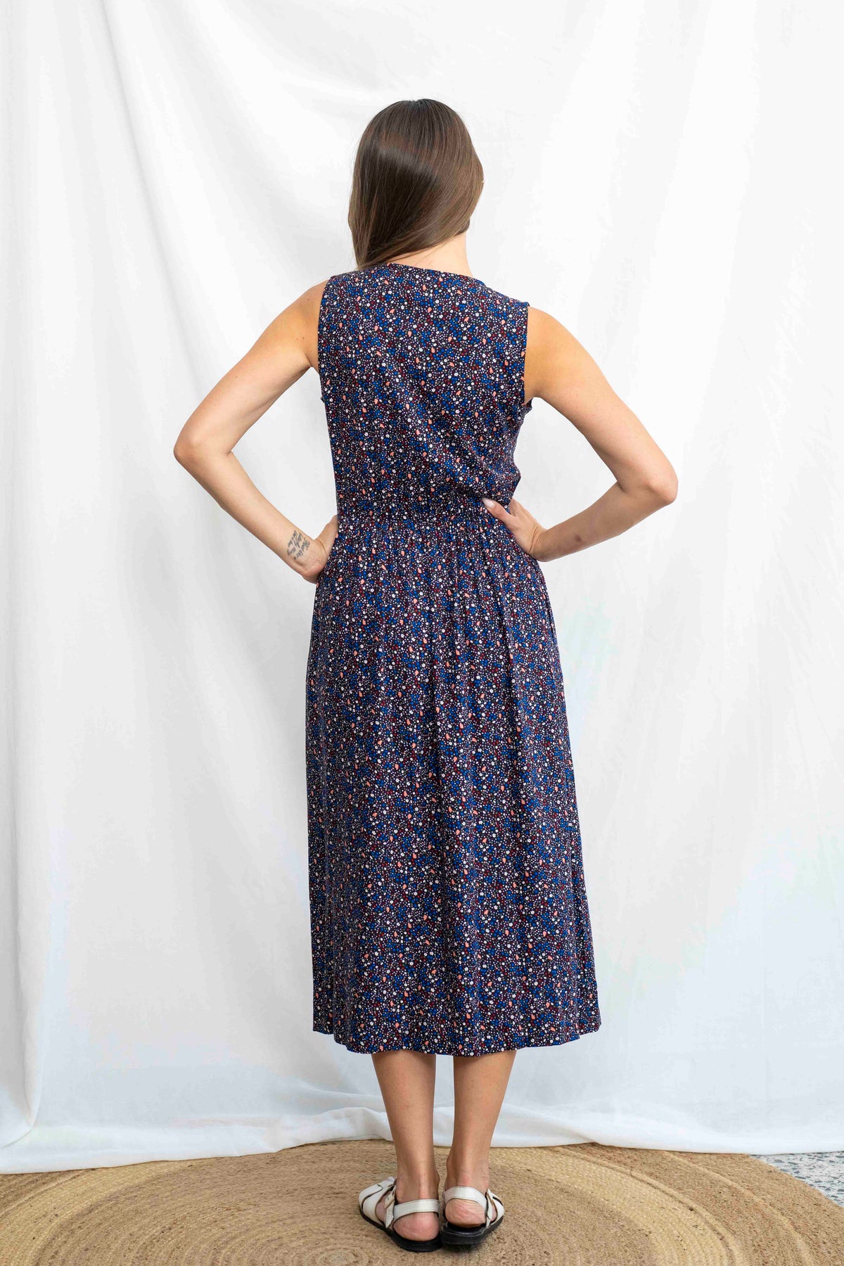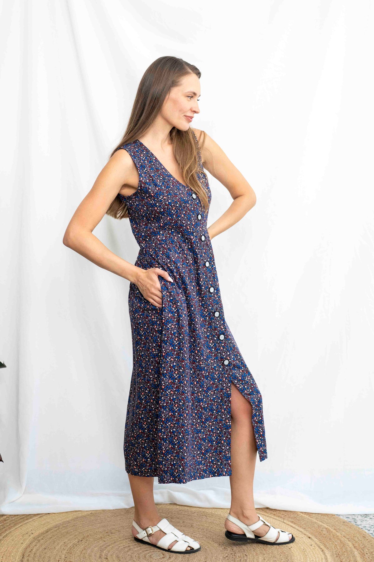 מהמם בכל אירוע. השמלה באורך מידי, ללא שרוולים ועם מפתח וי מושלם. הכפתורים הדקורטיביים לכל אורך השמלה מעניקים ביטחון וסטייל, ויש לה זוג הכיסים הצידיים מוסיפים פרקטיות. הגומי בגב מאפשר נוחות מרבית ומדגיש את המותן בצורה מחמיאה.