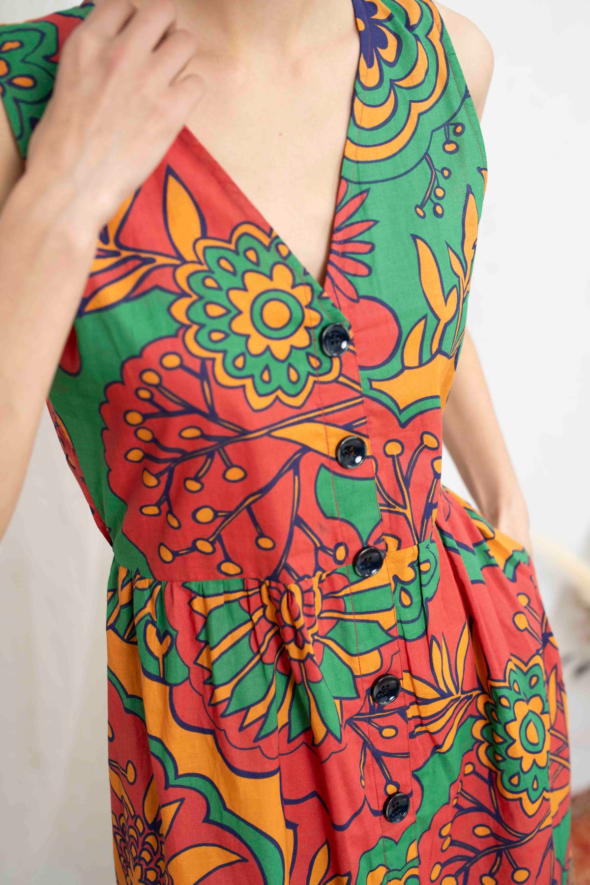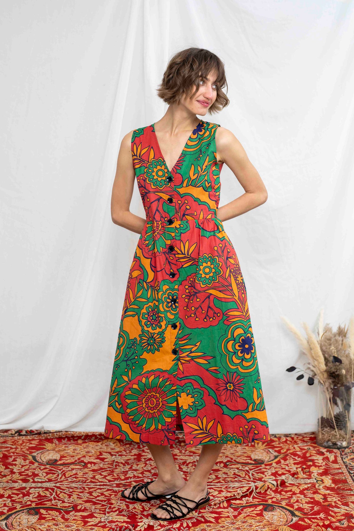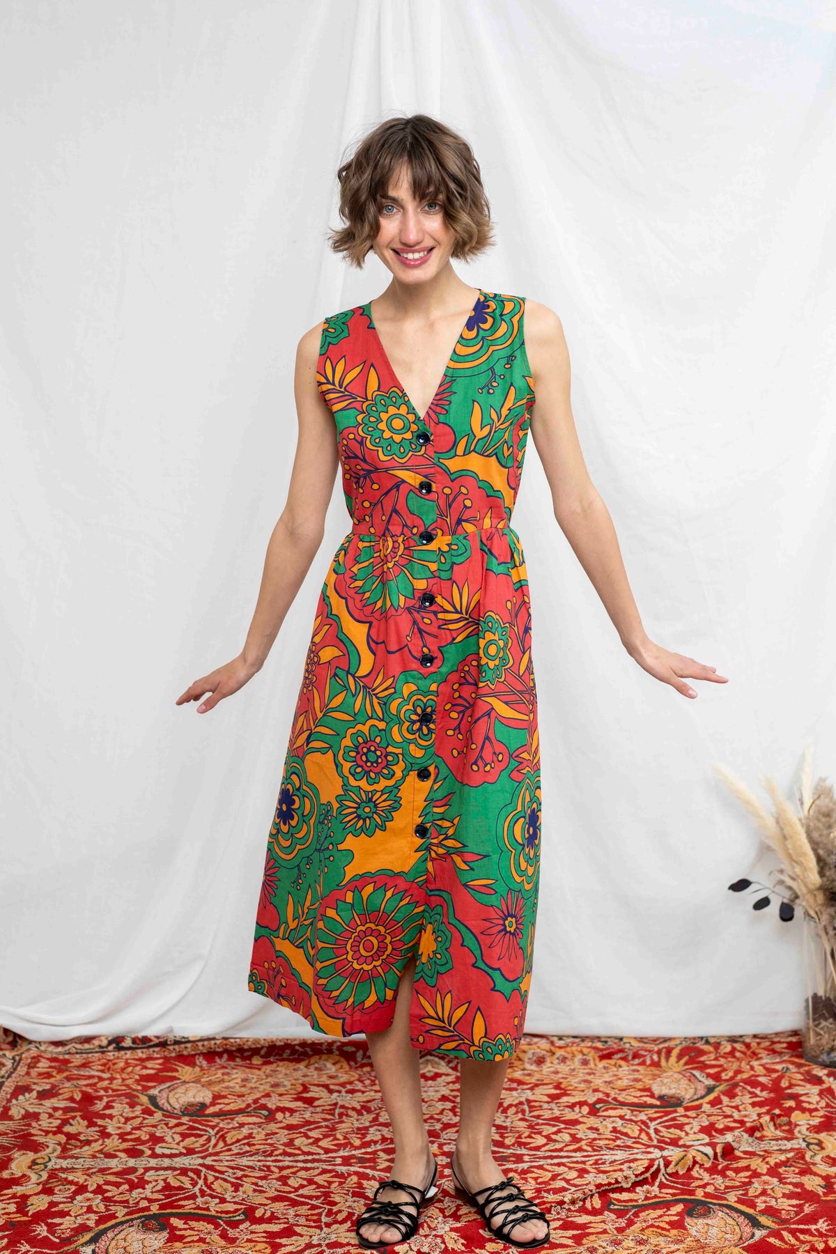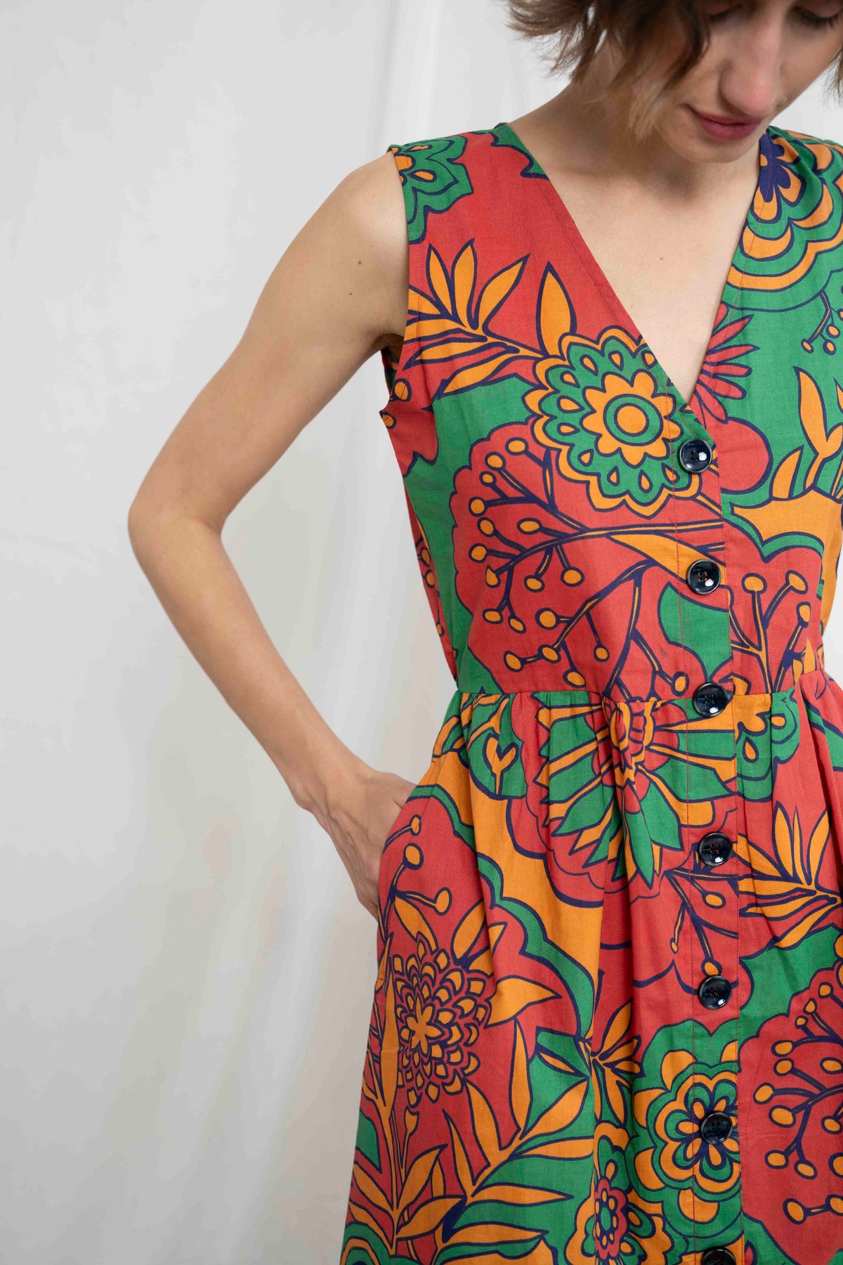 מהמם בכל אירוע. השמלה באורך מידי, ללא שרוולים ועם מפתח וי מושלם. הכפתורים הדקורטיביים לכל אורך השמלה מעניקים ביטחון וסטייל, ויש לה זוג הכיסים הצידיים מוסיפים פרקטיות. הגומי בגב מאפשר נוחות מרבית ומדגיש את המותן בצורה מחמיאה.