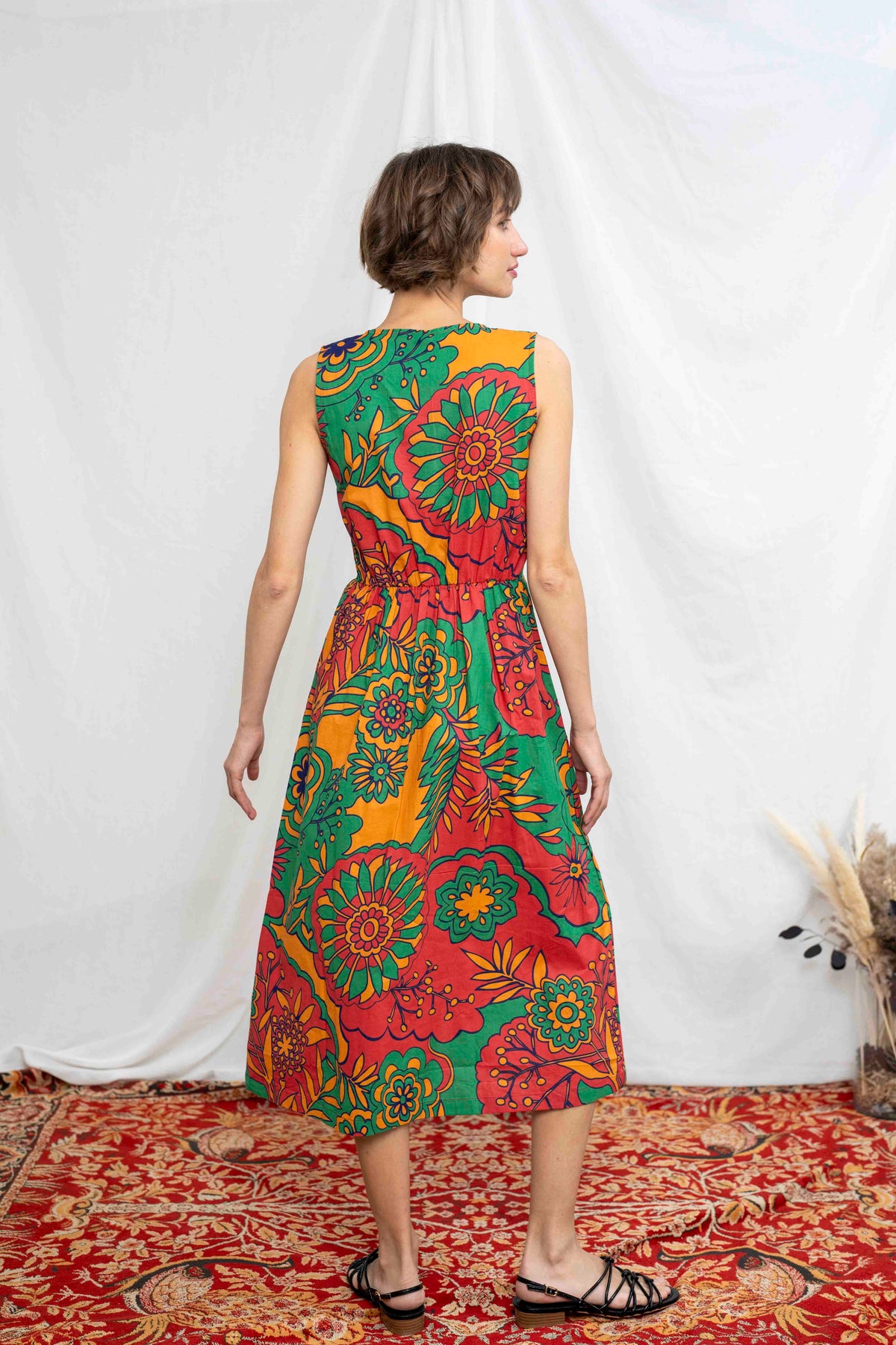 שמלת יולי וינטג׳ית בעלת דוגמה פרחונית מופשטת שמזכירה תקופות אחרות :) אחרי שאזלה במהירות בפעם הקודמת, הזדמנות אמיתית להתחדש בשמלה על זמנית.