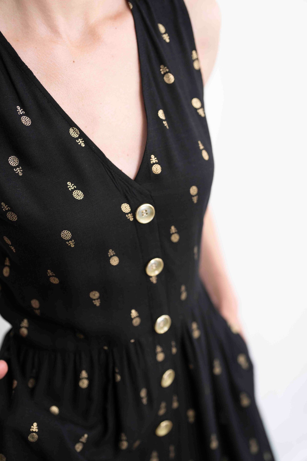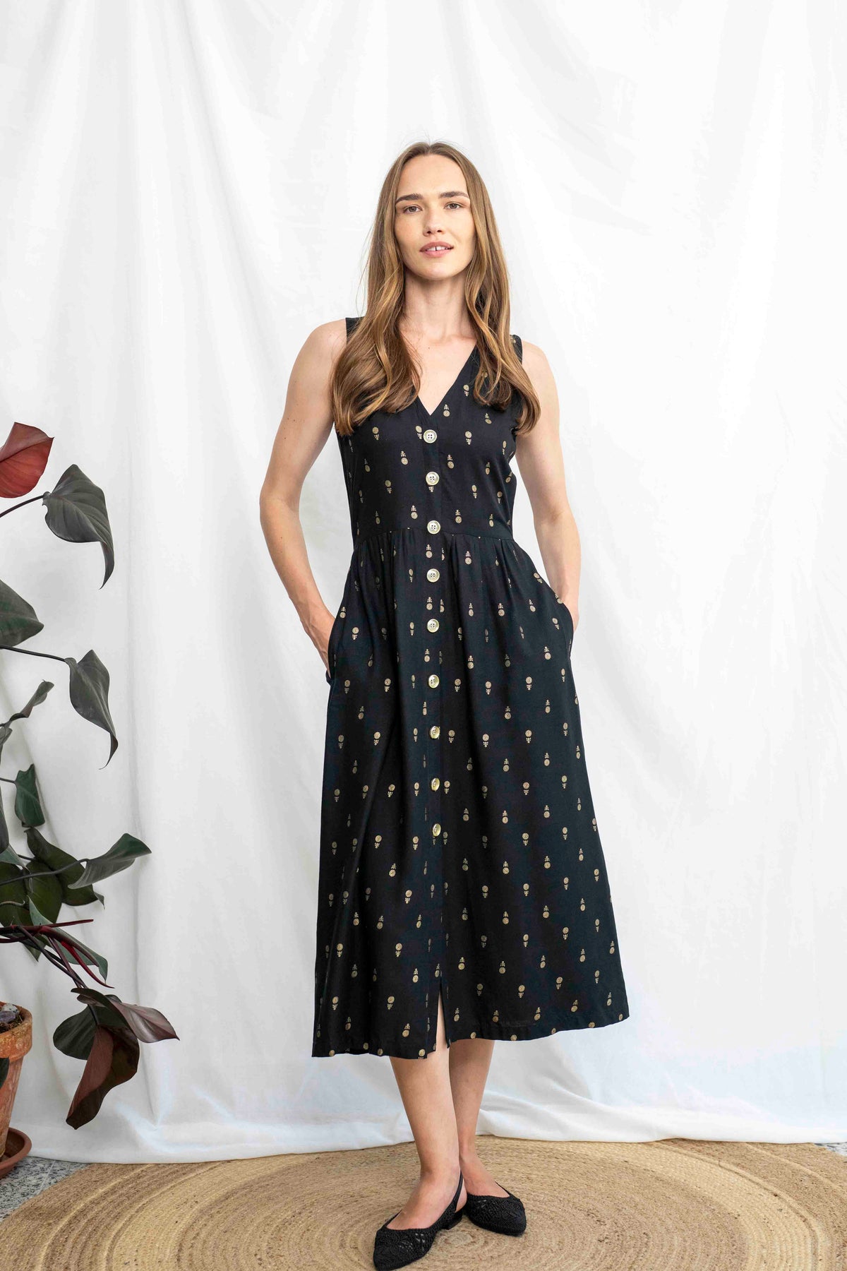 מהמם בכל אירוע. השמלה באורך מידי, ללא שרוולים ועם מפתח וי מושלם. הכפתורים הדקורטיביים לכל אורך השמלה מעניקים ביטחון וסטייל, ויש לה זוג הכיסים הצידיים מוסיפים פרקטיות. הגומי בגב מאפשר נוחות מרבית ומדגיש את המותן בצורה מחמיאה.